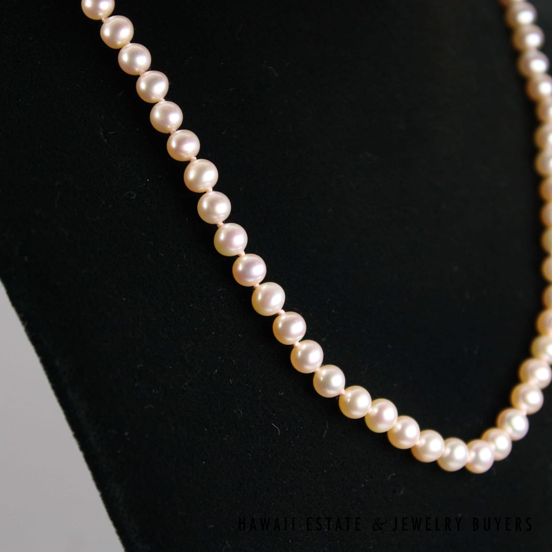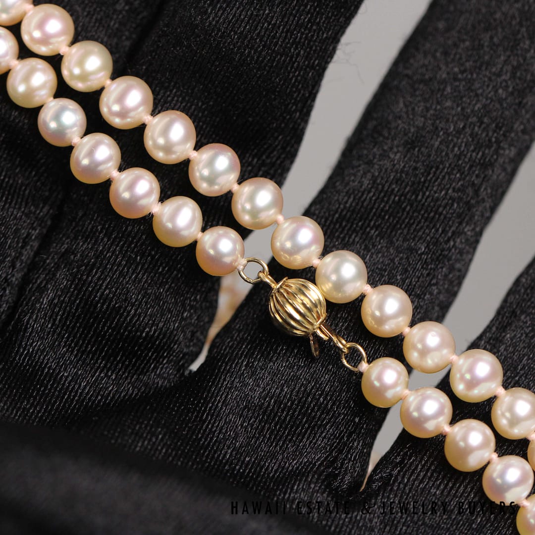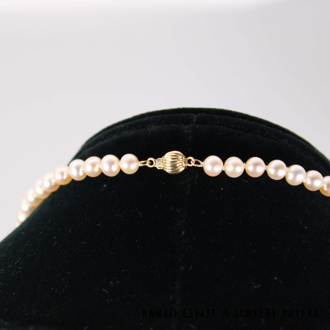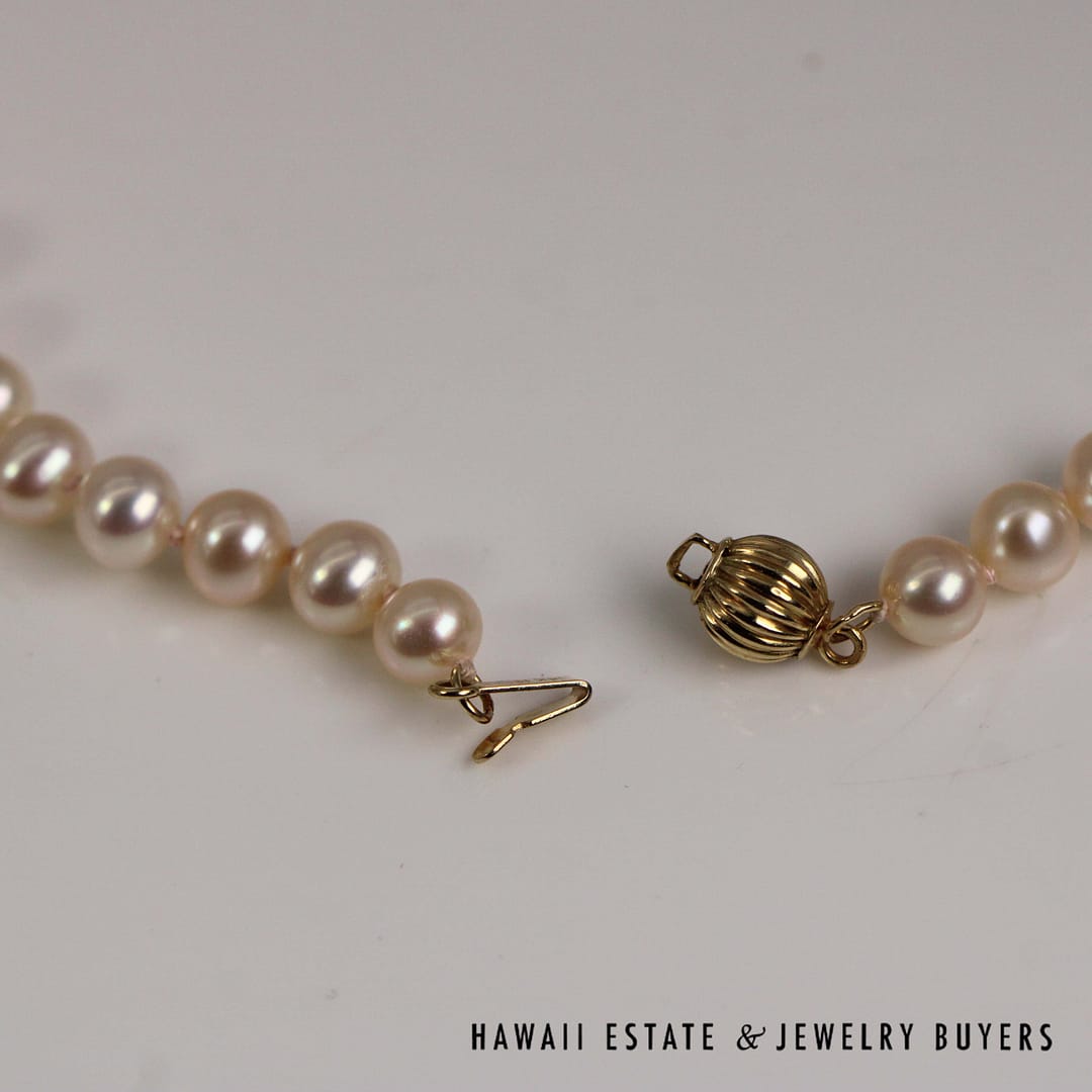 Elegant 18 inch knotted pearl strand featuring 5.5 to 6 millimeter pearls with a 14K yellow gold clasp a graceful and timeless accessory
