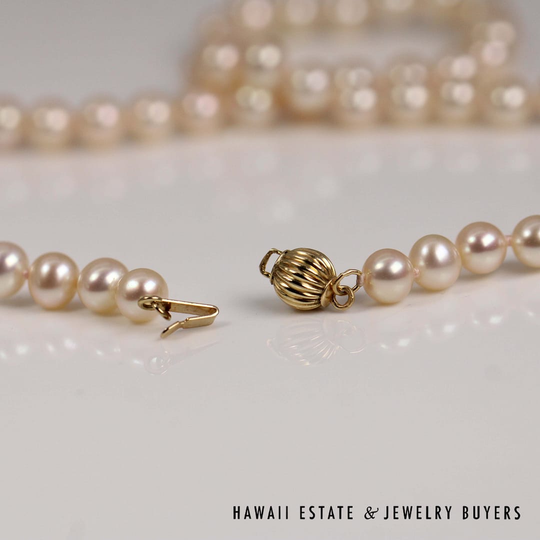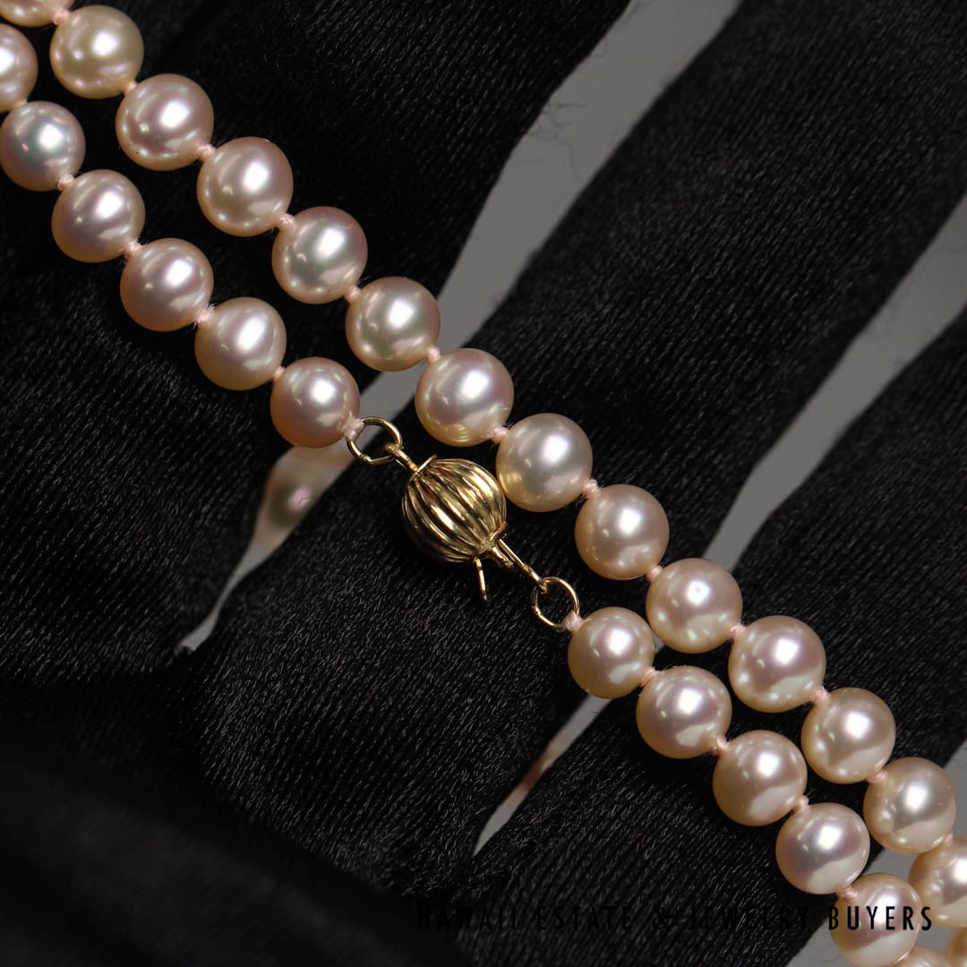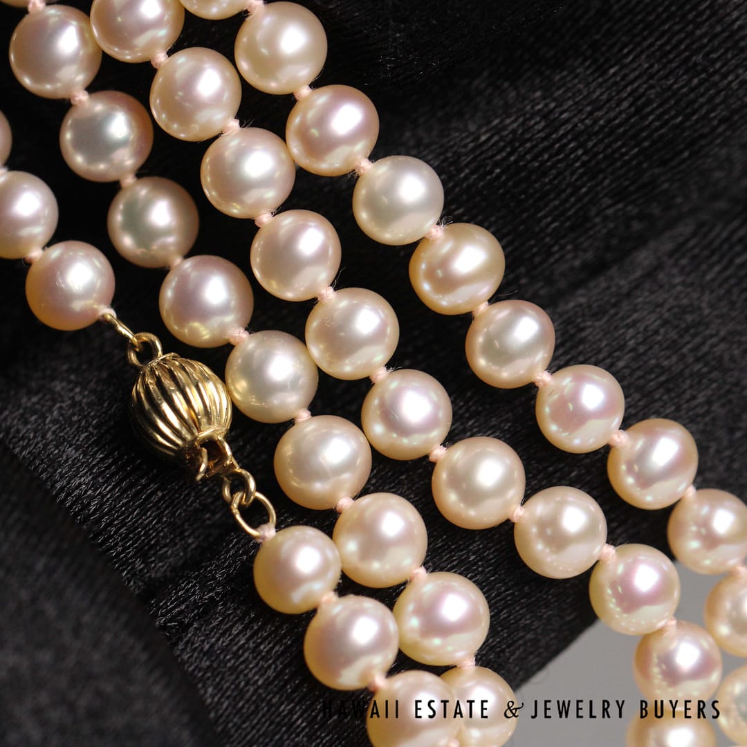 Elegant 18 inch knotted pearl strand featuring 5.5 to 6 millimeter pearls with a 14K yellow gold clasp a graceful and timeless accessory