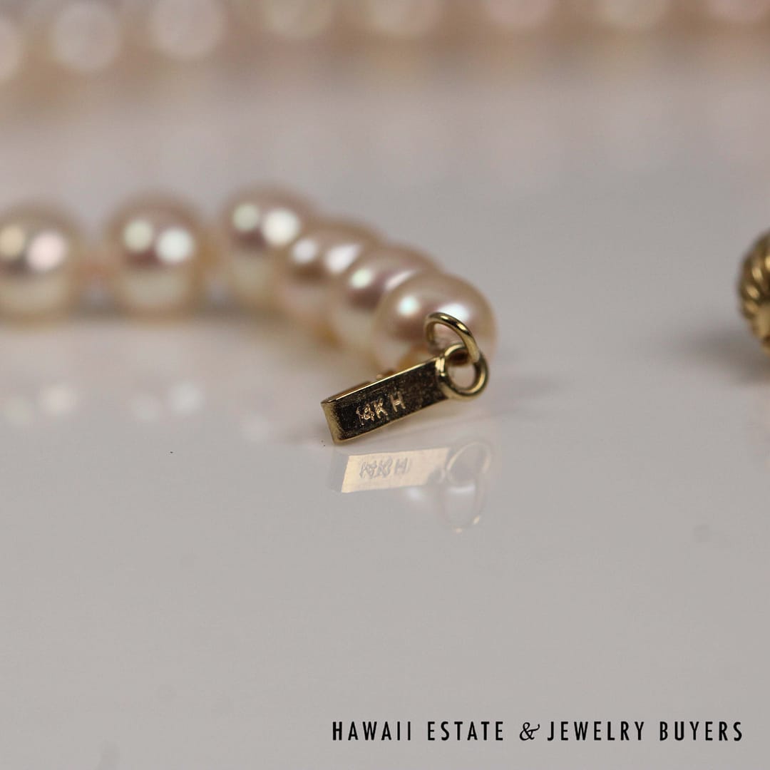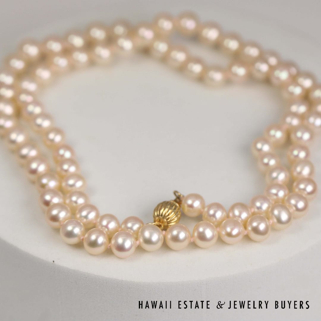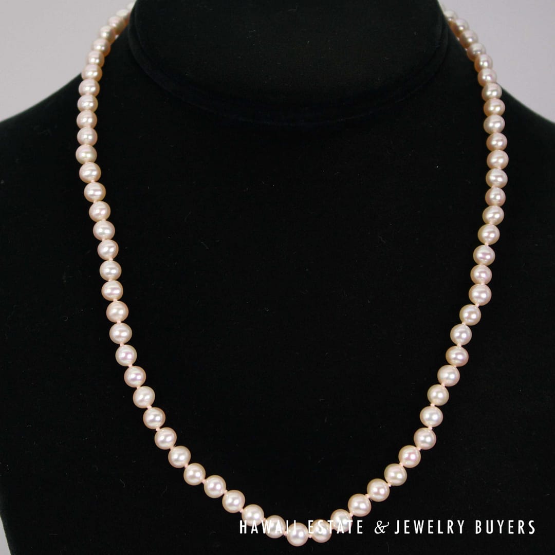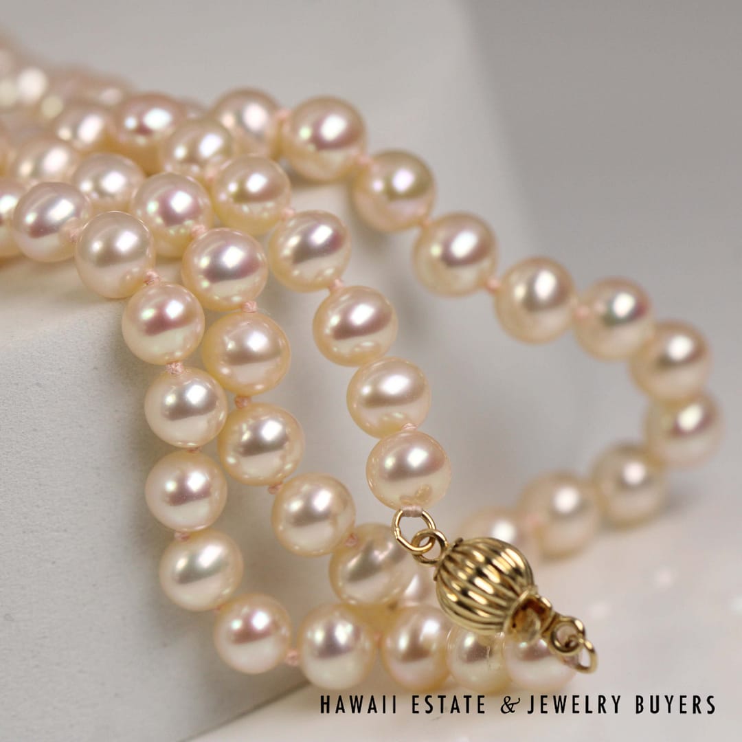 Elegant 18 inch knotted pearl strand featuring 5.5 to 6 millimeter pearls with a 14K yellow gold clasp a graceful and timeless accessory