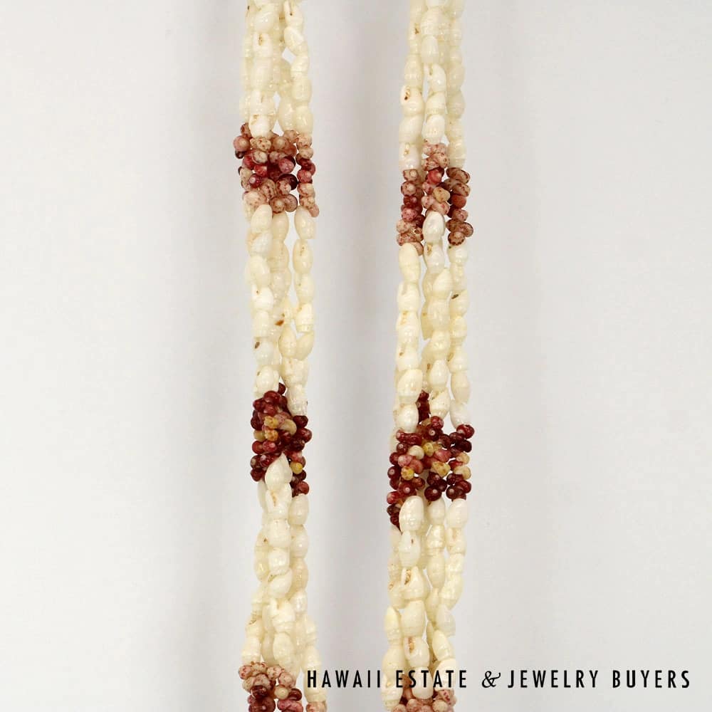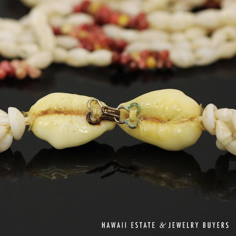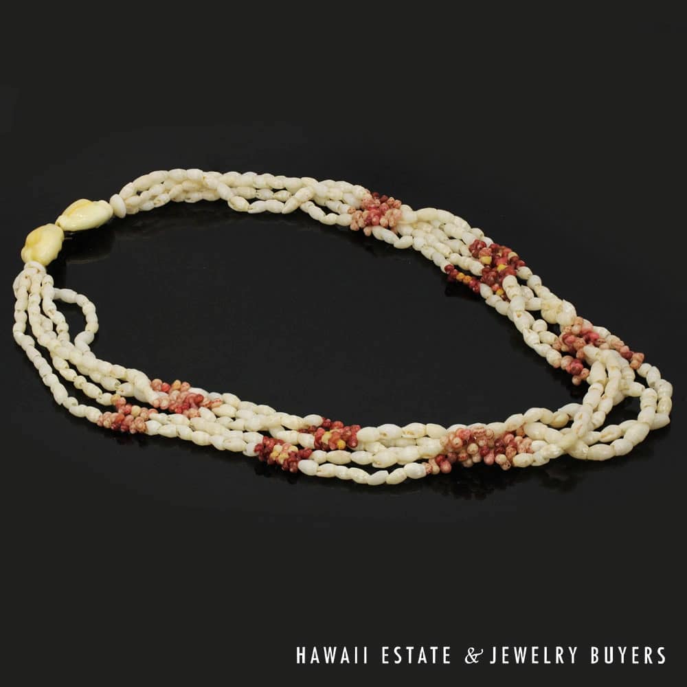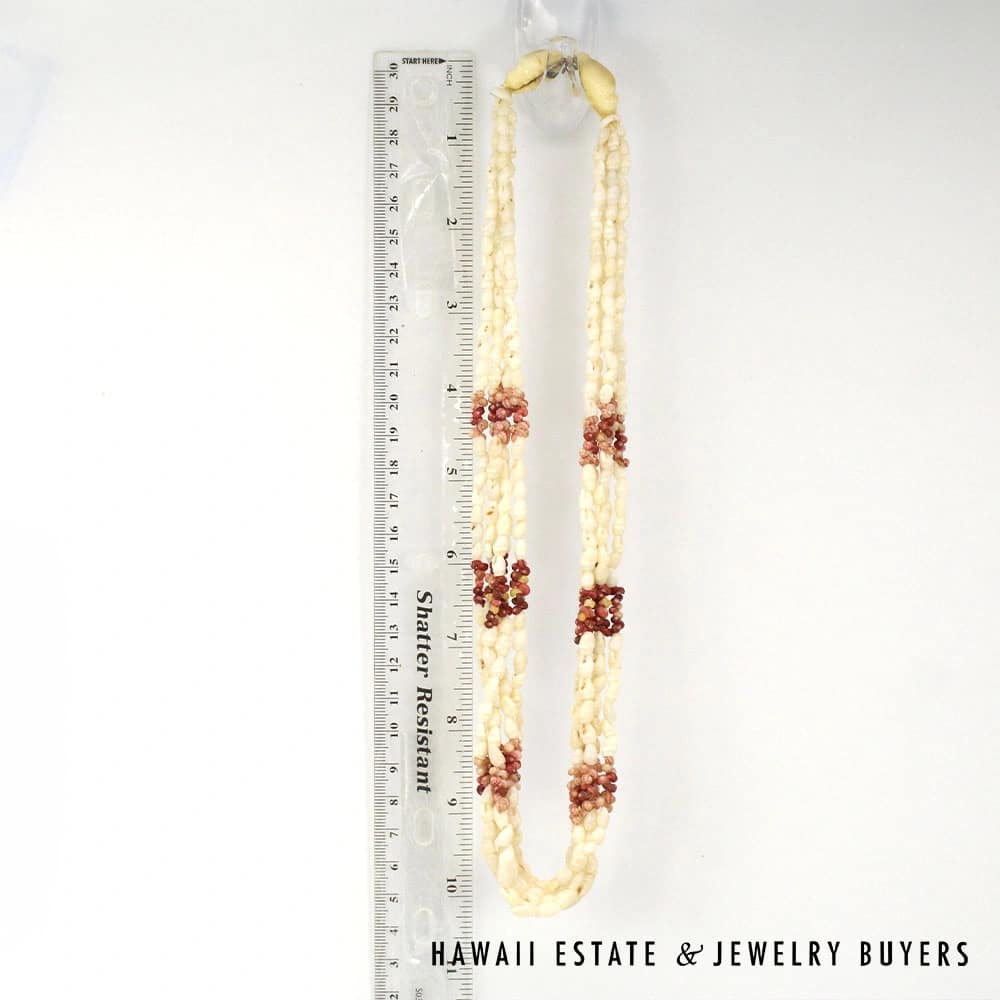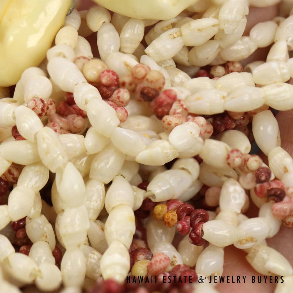 The shells consist of Laiki (rice shells) with a clean Ke’oke’o (white/off-white) color and Kahelelani (turban shells) in shades of Ula Ula (red), Akala Pua (pale pink), Kamoa (yellow/golden), and Maku’e (brown/burgundy).