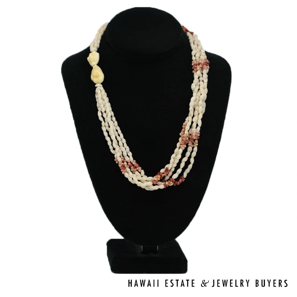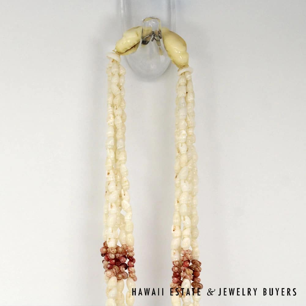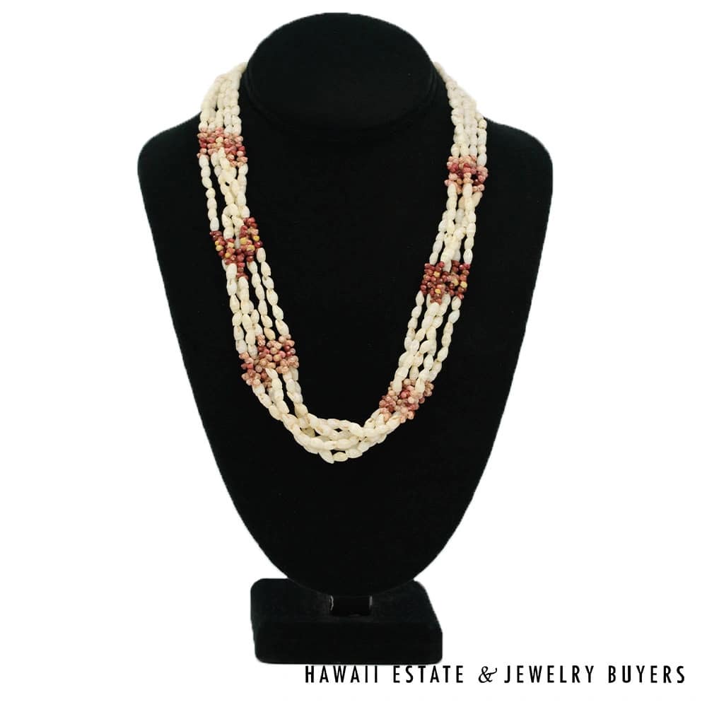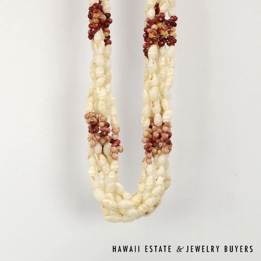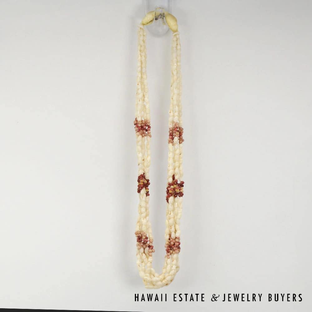 The shells consist of Laiki (rice shells) with a clean Ke’oke’o (white/off-white) color and Kahelelani (turban shells) in shades of Ula Ula (red), Akala Pua (pale pink), Kamoa (yellow/golden), and Maku’e (brown/burgundy).