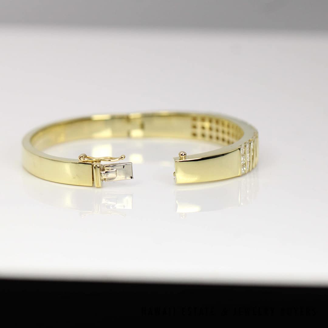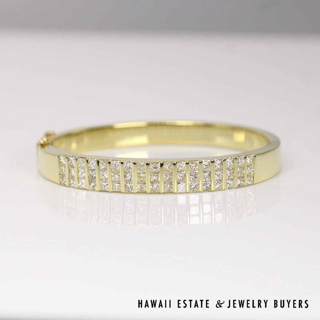 DescriptionDiamonds are VVS-VS clarity, HIJ color. Bracelet measures 8mm at top and 6mm at base of shank.49.7g 18KYG 5ctw PRINCESS CUT DIAMOND BRACELET SIZE 6.25 (011624-01)$8,500.001 in stock5ctw Princess Cut Diamond 18k Yellow Gold Bracelet Size 6.25 quantityAdd to cartBuy withMake OfferSKU: 011624-01Category: Pre-owned Diamond JewelryRelated StylesDiamond White Gold Yellow Gold 14k Ribbon Pendant$1,350.00BEN BRIDGE 14K YELLOW GOLD WHITE GOLD TWO TONE TENNIS BRACELET & EARRINGS W/ BOX$3,000.002.13CTW DIAMOND CLUSTER 14K YELLOW GOLD TREE BRANCH RING W/ GEMOLOGIST APPRAISAL$5,225.00Antique 1920’s European Cut Diamond 8.62ctw Platinum Bracelet$20,000.00