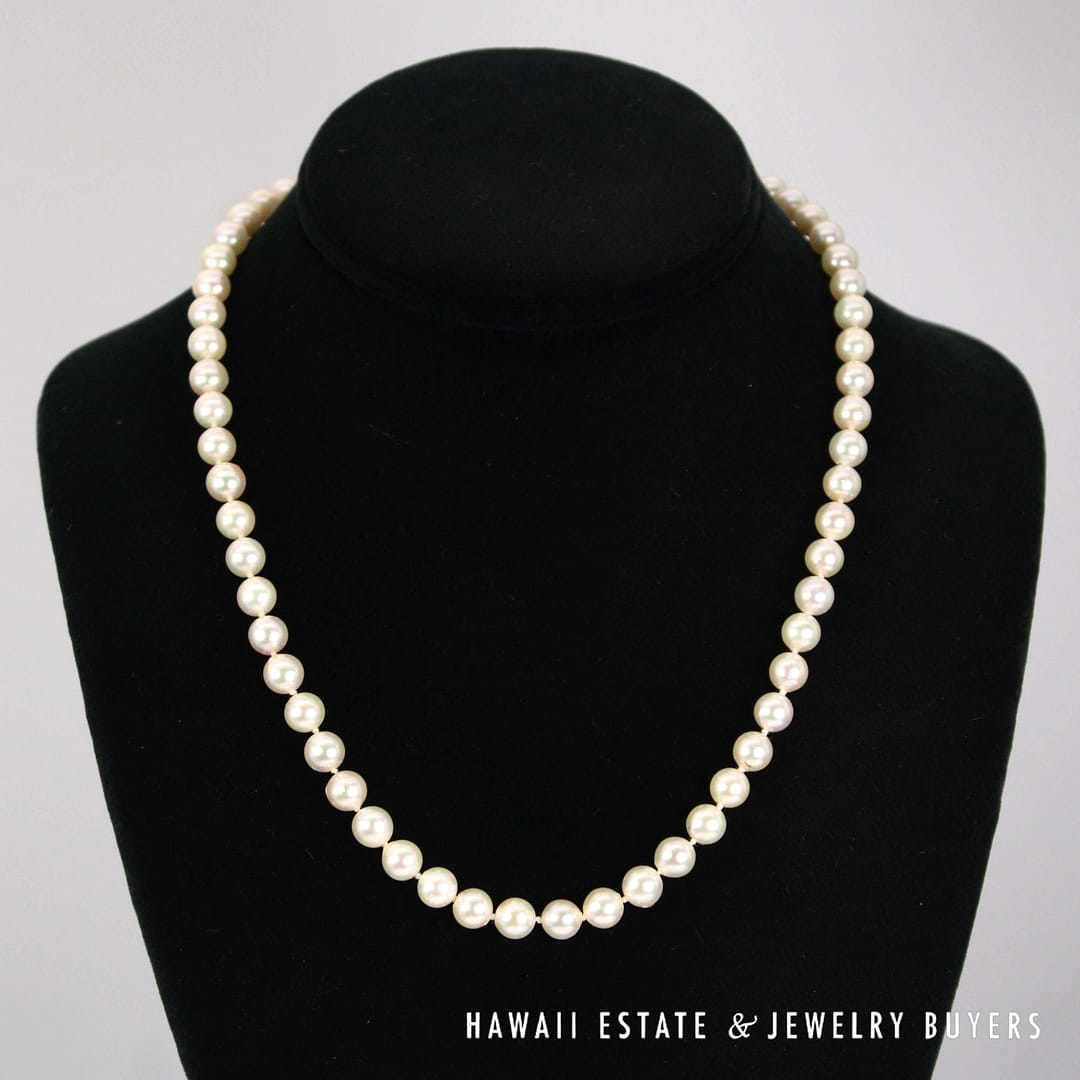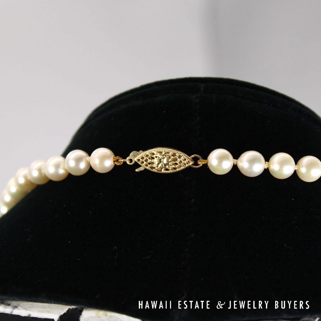 Classic 18 inch strand necklace of 6.5 to 7 millimeter cultured pearls hand knotted with a 14K yellow gold clasp timeless elegance for any occasion.