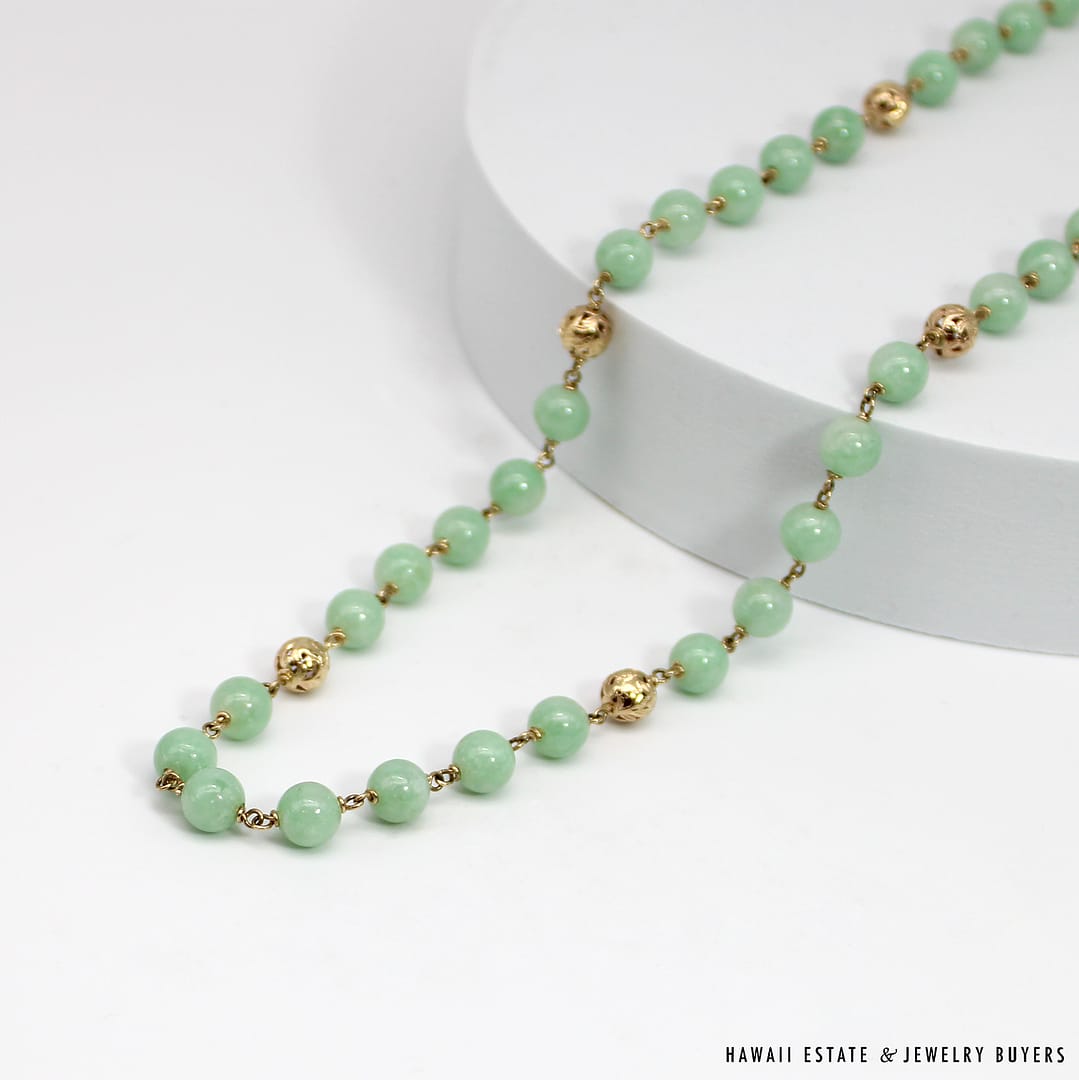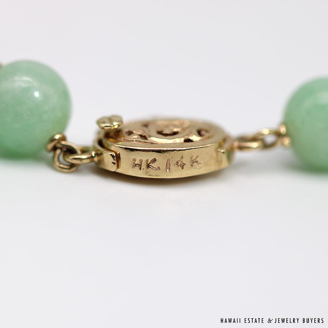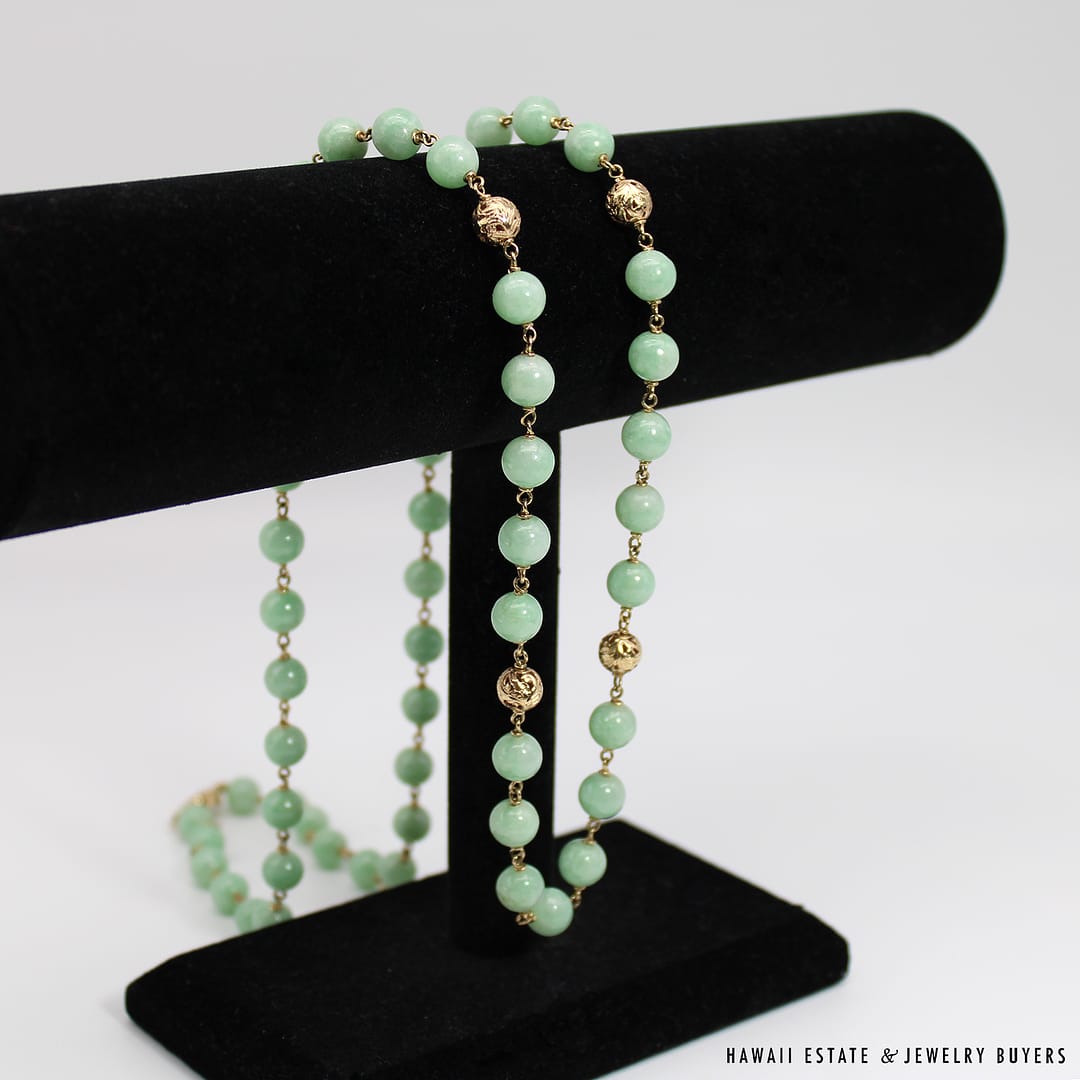 Description14KYG LIGHT GREEN JADE BEAD NECKLACEWEIGHT: APPROX. 66.4gNECKLACE LENGTH: 30 INCHJADE BEADS MEASURE: APPROX. 7.9-8.5mmSTAMPED 14KYG $1,800.00Out of stockSKU: AH071221-01Category: Pre-owned Vintage & Jade JewelryTags: 14k, 14k yellow gold, jade, jade bead necklace, jade necklace, light green jade, NECKLACERelated StylesCertified Grade “A” Lavender Jade Yellow Gold Ring$2,700.00Natural Grade A White Jade Archer Ring$3,800.00Vintage Fire Opal & Diamond 18K Ring$7,000.00Estate Large 18mm South Sea Pearl Necklace$18,000.00