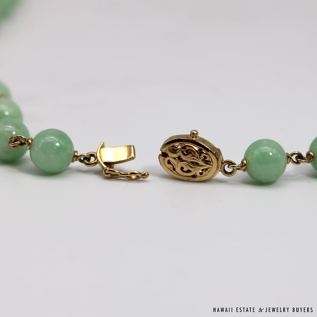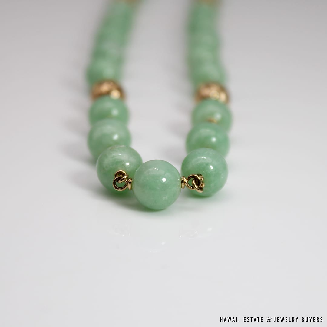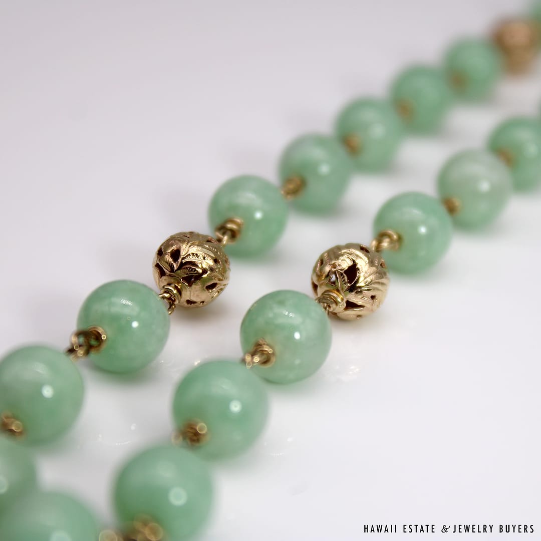 Description14KYG LIGHT GREEN JADE BEAD NECKLACEWEIGHT: APPROX. 66.4gNECKLACE LENGTH: 30 INCHJADE BEADS MEASURE: APPROX. 7.9-8.5mmSTAMPED 14KYG $1,800.00Out of stockSKU: AH071221-01Category: Pre-owned Vintage & Jade JewelryTags: 14k, 14k yellow gold, jade, jade bead necklace, jade necklace, light green jade, NECKLACERelated StylesCertified Grade “A” Lavender Jade Yellow Gold Ring$2,700.00Natural Grade A White Jade Archer Ring$3,800.00Vintage Fire Opal & Diamond 18K Ring$7,000.00Estate Large 18mm South Sea Pearl Necklace$18,000.00