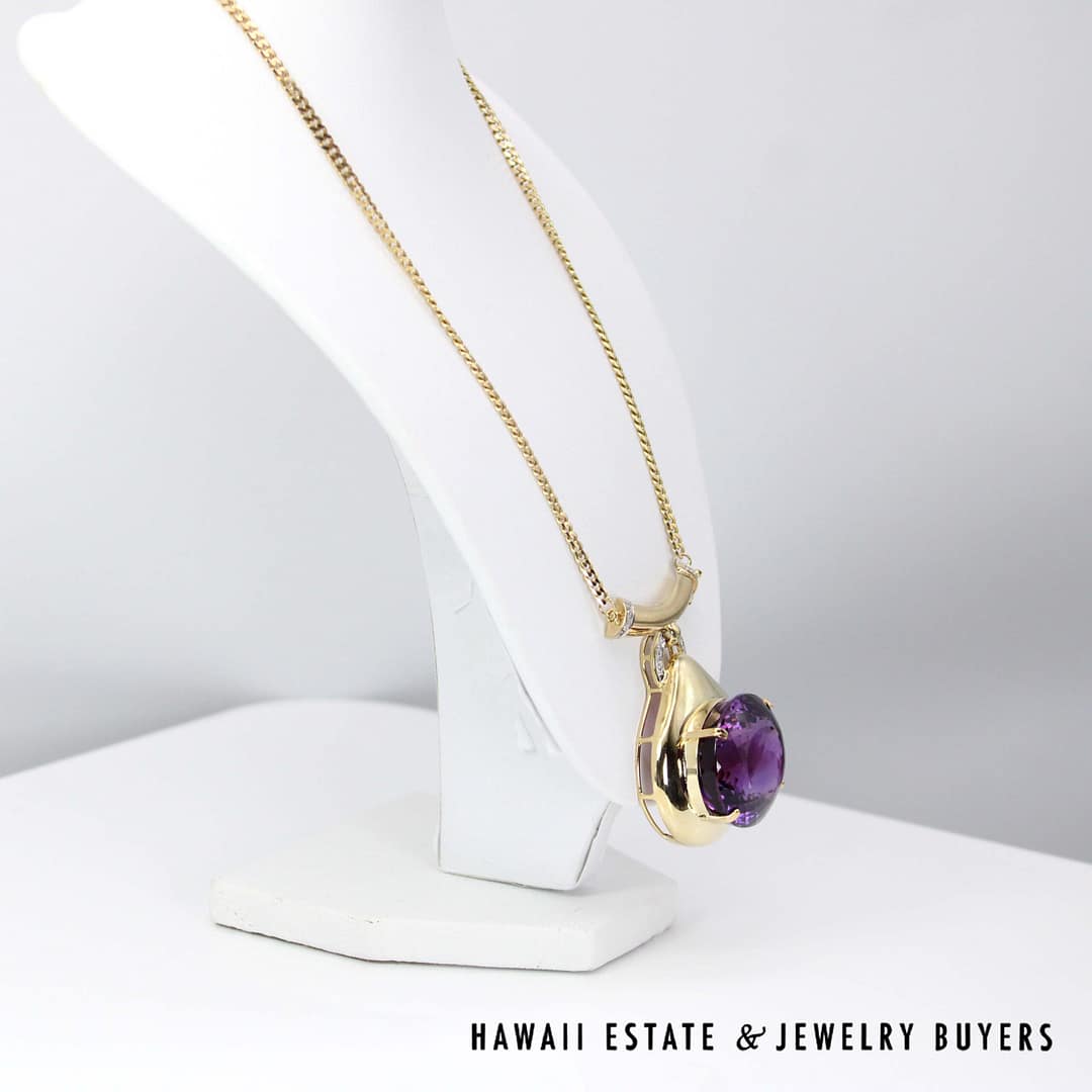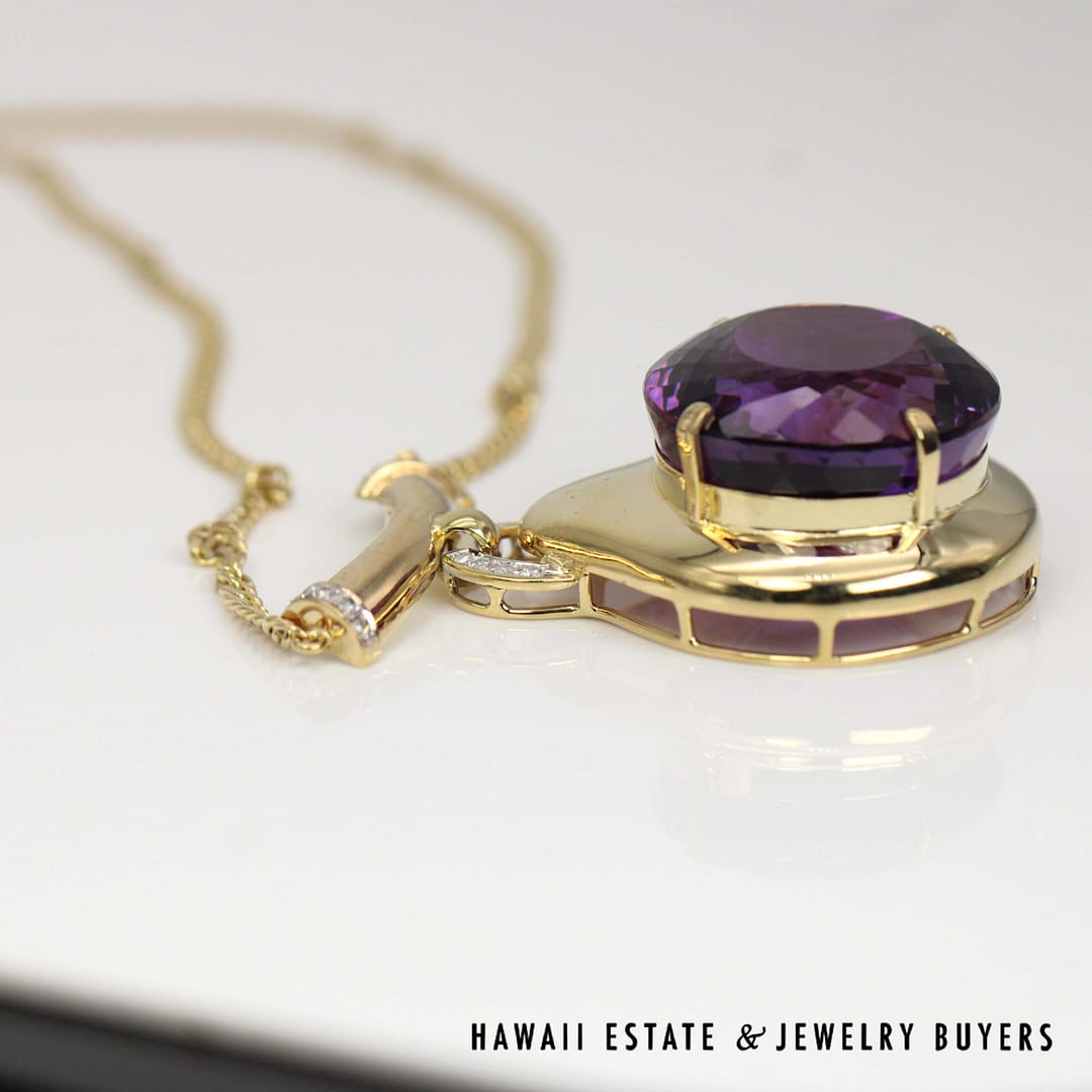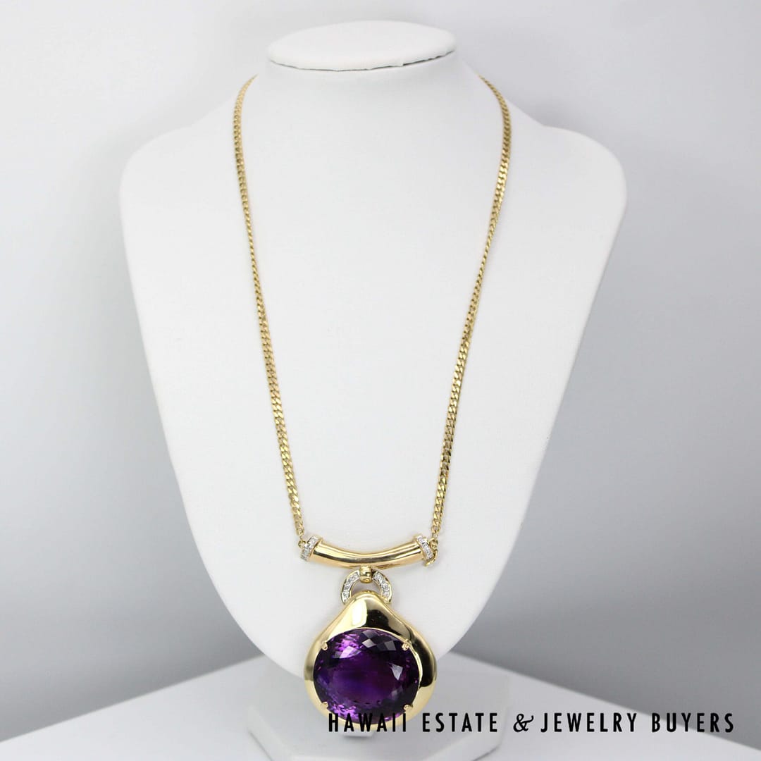 DescriptionStunning LARGE 75ct Amethys is sure to stand out!41g 14KYG 75ct OVAL AMETHYST 0.15ctw SI/GH DIAMOND PENDANT 17" LENGTH (3019-10)$3,300.001 in stock75ct Oval Amethyst 0.15ctw SI/GH 14K Yellow Gold Diamond Pendant 17" Length quantityAdd to cartMake OfferSKU: 3019-10Category: Pre-owned Gemstone JewelryRelated StylesMexican Opal 14K Yellow Gold Leaves Ring Size 8$1,650.0010ctw PINK SAPPHIRE CABOCHON TREE OF LIFE 19.3g 14K YELLOW GOLD PENDANT BROOCH$3,242.408ctw Ruby Hinged Bangle 19K Yellow Gold Bracelet Size 6.5$8,415.00GIA 14.1g 14KWG 24.28ct AQUAMARINE AND 1ctw DIAMOND RING SIZE 7.5$11,000.00