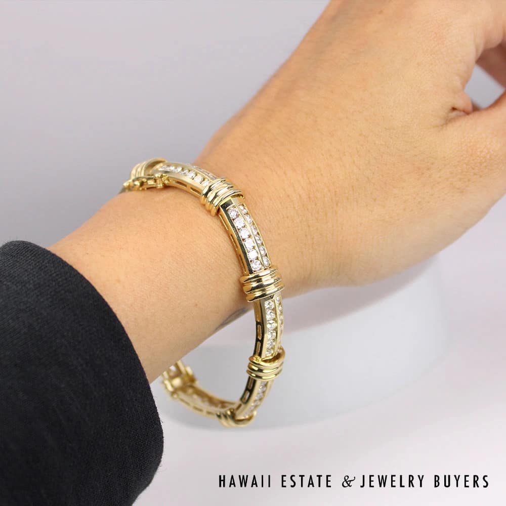 This beautiful vintage diamond and yellow gold bracelet features two rows of shining diamonds in sections. A gorgeous elegant addition to any outfit, unisex and classic!
