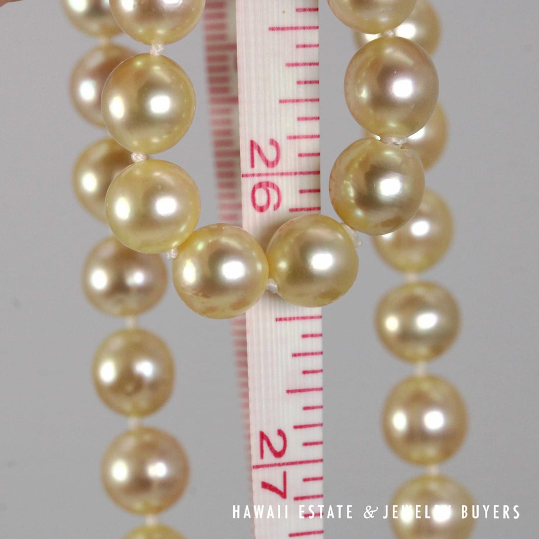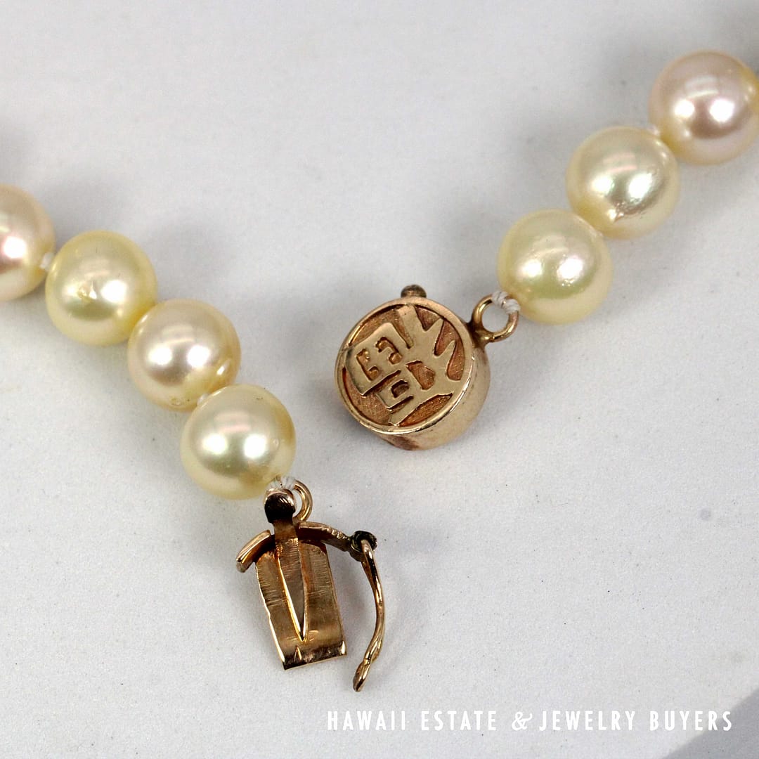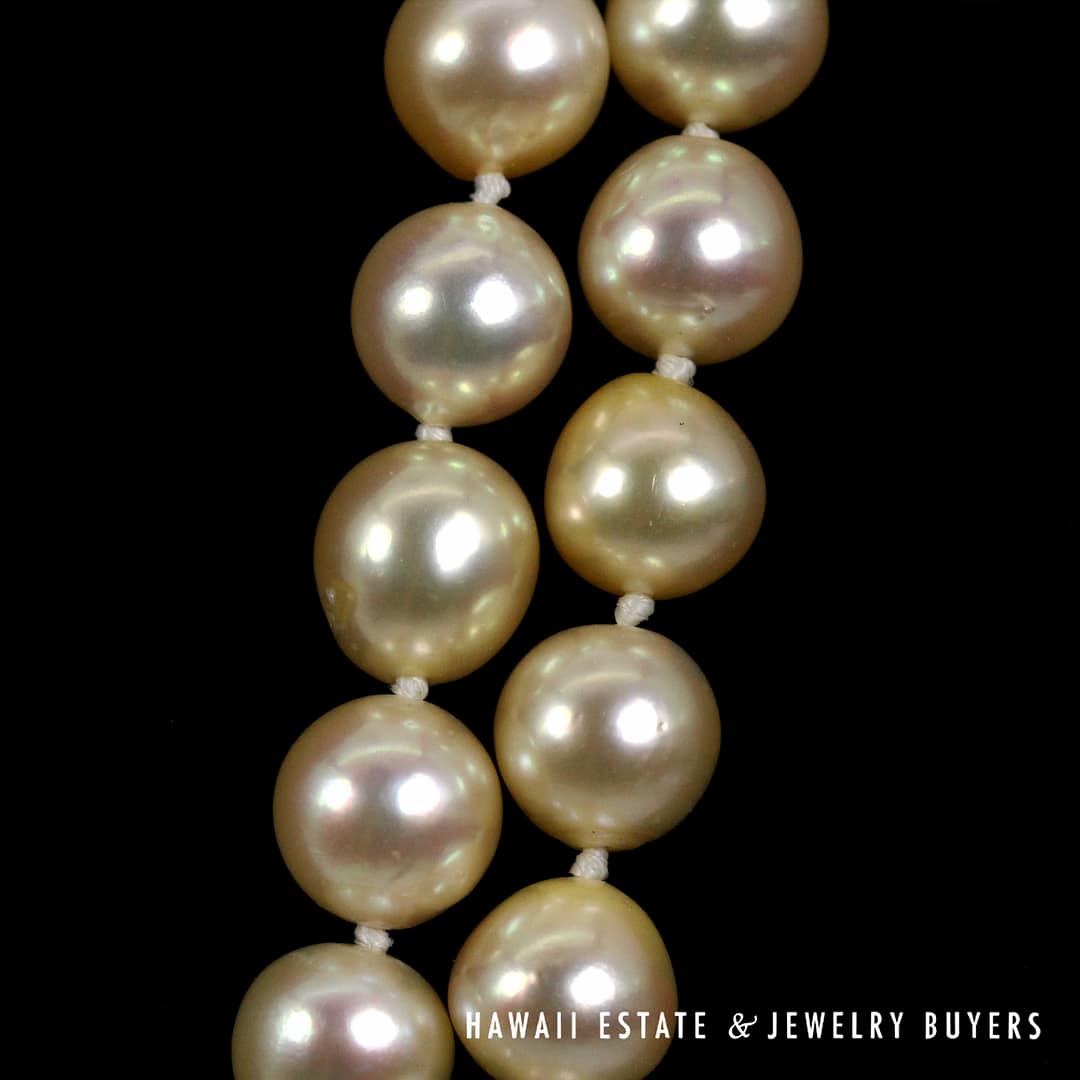 Pearls are cream body color, moderate blemish, good luster, thick even nacre coating.