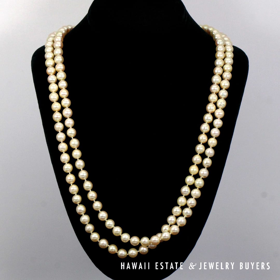 Elegant 53-inch necklace featuring lustrous 8-8.5mm round cultured pearls, finished with a classic 14K yellow gold clasp.