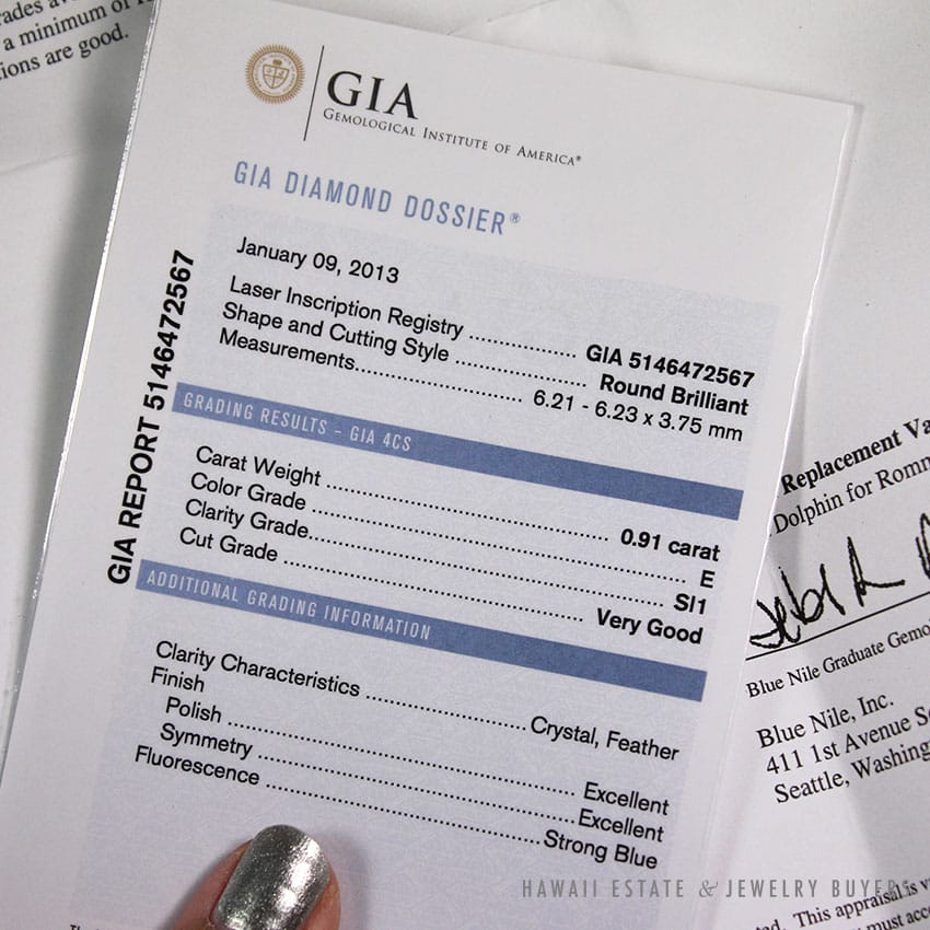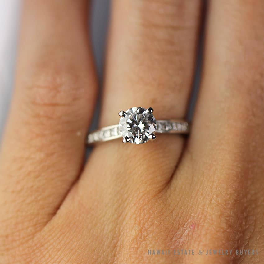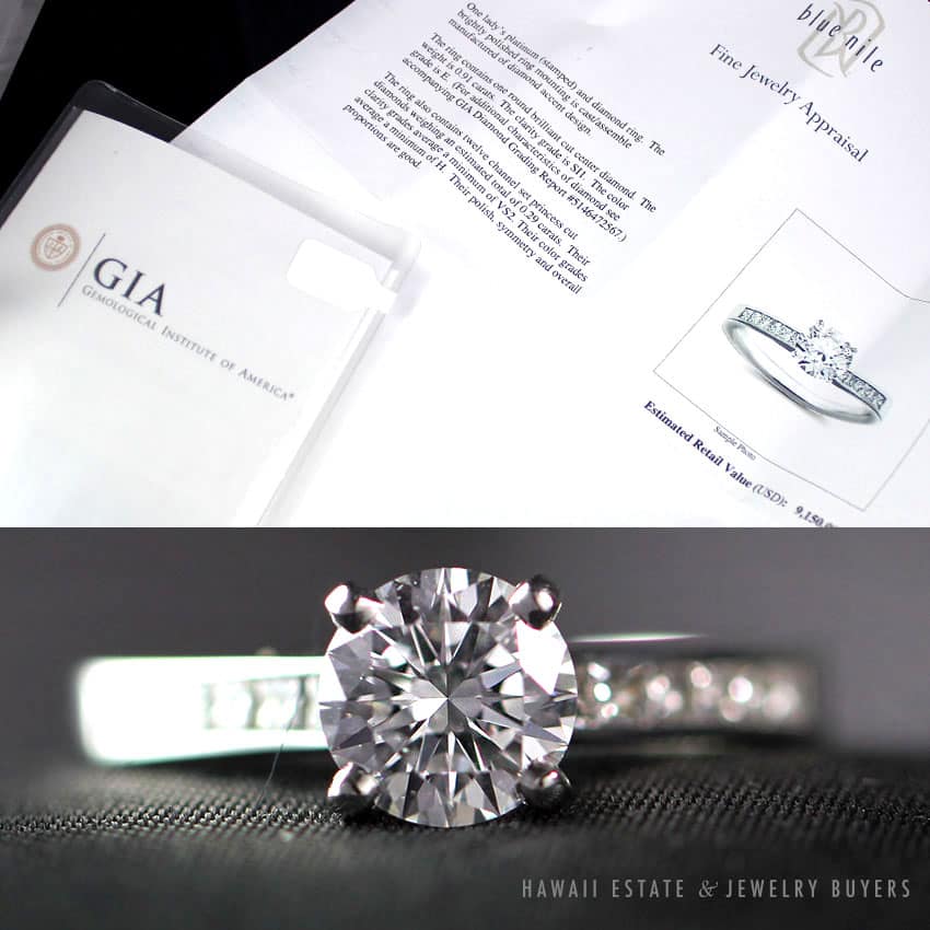 DescriptionComes with BLUE NILE appraisal paper and GIA certificate – please see photos.GIA # 5146472567 .91CT E SI1Additionl .29CTW of channel set princess cut diamonds on setting.ESTIMATE RETAIL VALUE $9,150$4,500.001 in stock.91CT ROUND DIAMOND BLUE NILE PLATINUM ENGAGEMENT .29CTW PRINCESS CUT SETTING RING (SIZE 4) quantityAdd to cartMake OfferSKU: 2006-01Category: Pre-owned Diamond JewelryTag: blue nileRelated Styles0.80CTW ROUND BRILLIANT 14K YELLOW GOLD STUD EARRINGS$1,300.00NATURAL RUBY & 2.23CTW OLD MINE CUT DIAMOND MARQUISE SHAPE 14K YELLOW GOLD RING$9,500.00VICTORIAN OLD MINE DIAMOND 5.48CTW PLATINUM GOLD BROOCH & DIAMOND NECKLACE SET$13,300.001.50CTW PRINCESS CUT 14K YELLOW GOLD MEN’S RING SIZE 8.25$2,500.00