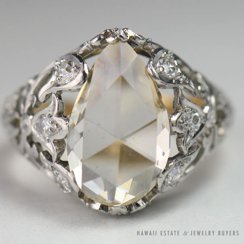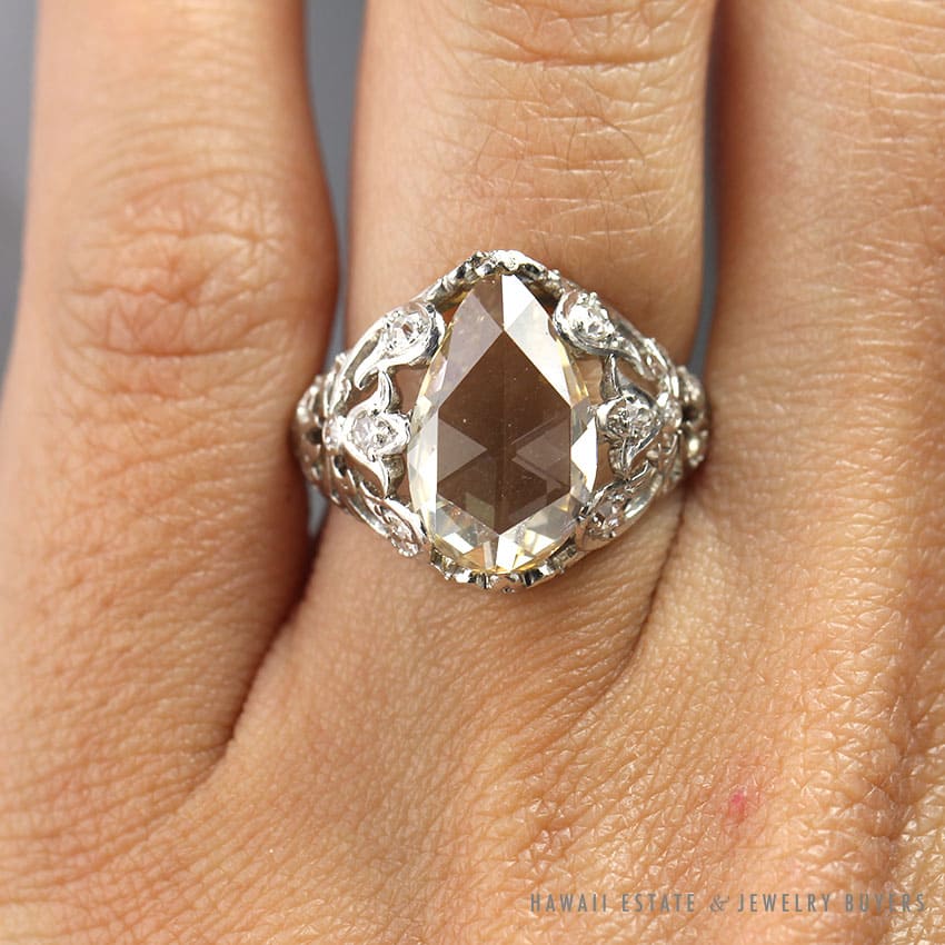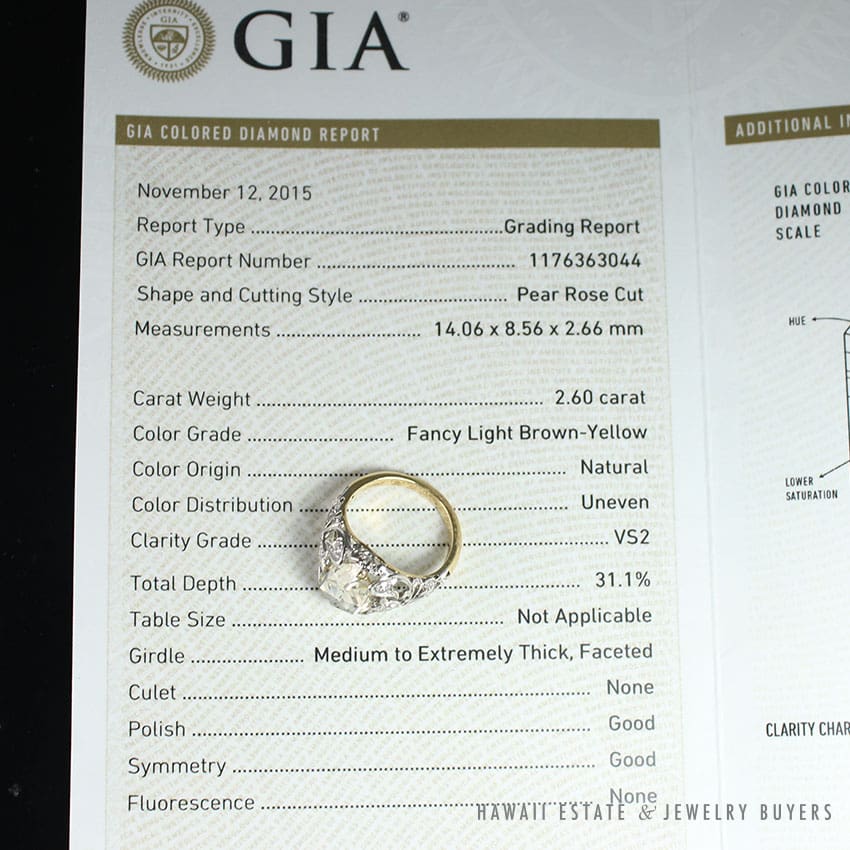DescriptionGIA Report Number: 6167812191SIZE: 5GIA INCLUDED:SHAPE: PEAR ROSE CUT MEASUREMENTS: 14.06 X 8.56 X 2.66MMCARAT WEIGHT: 2.60CTCLARITY: VS2 NATURAL, FANCY LIGHT BROWN- YELLOW, UNEVENSKU: 1620-01$36,000.001 in stockANTIQUE 2.60CT ROSE CUT PEAR DIAMOND - GIA FANCY LIGHT BROWN-YELLOW RING (SZ 5) quantityAdd to cartBuy withMake OfferSKU: 1620-01Category: Pre-owned Diamond JewelryTags: antique, antique diamond, antique diamond ring, antique jewelry, antique ring, certified, certified diamond, DIAMOND, diamond ring, gia, gia ring, gold, gold ring, pear, pear shape diamond, rose cutRelated StylesDIAMOND 14K YELLOW GOLD OPENING DOORS JEWISH MOSES PENDANT & 18K NECKLACE$3,500.001.48CTW DIAMOND LADIES ENGAGEMENT RING SETTING & MATCHING DIAMOND WEDDING BAND SET (SZ. 4.5)$2,500.00VINTAGE BURMESE JADEITE JADE & DIAMOND FLORAL 14K YELLOW GOLD BRACELET W/ GEMOLOGIST APPRAISAL$2,447.50Ruby & Diamond Drop 18k White Gold Earrings$2,300.00