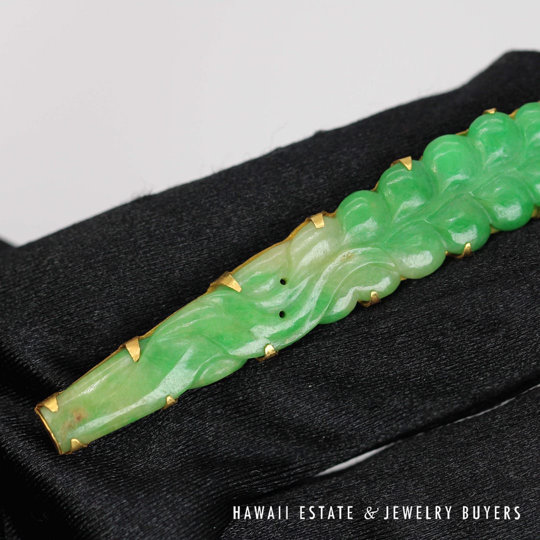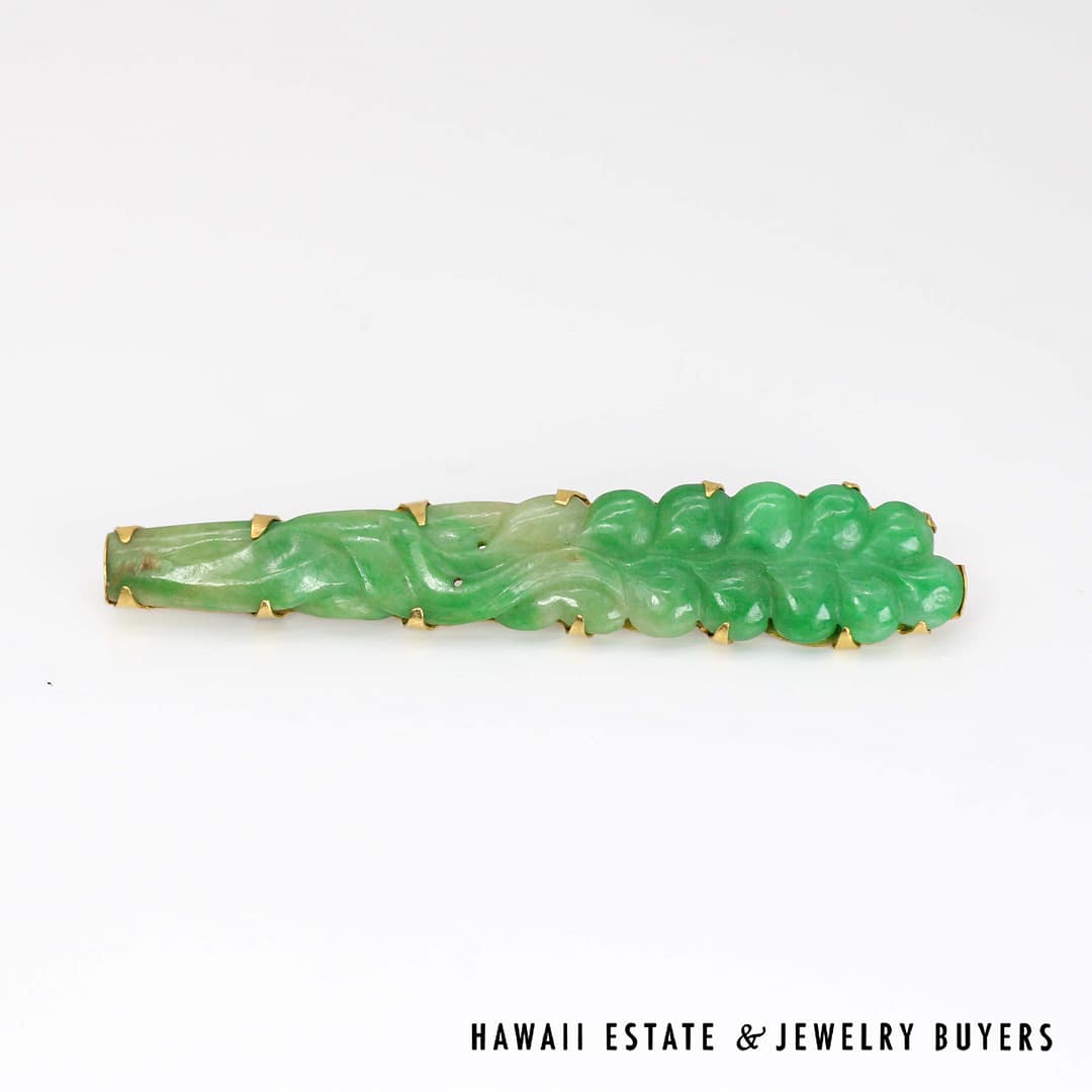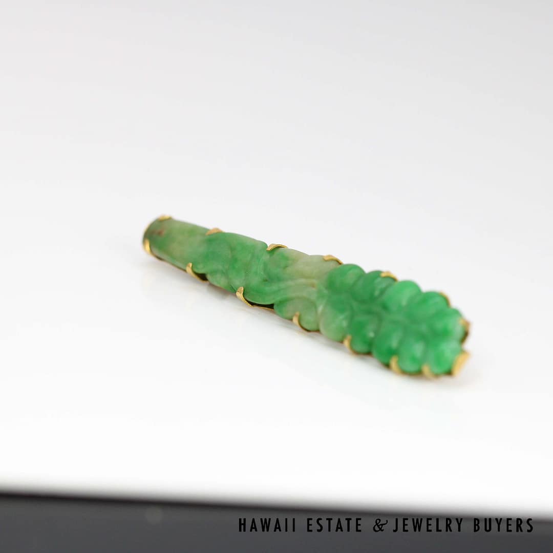 DescriptionBeautiful bar brooch with carved mottled green jade in 14K Yellow Gold.10.6g 14KYG CARVED MOTTLED GREEN JADE BROOCH (101422-23)$1,650.001 in stockAntique Chinese Mottled Green Jade Carved 14K Yellow Gold Brooch quantityAdd to cartMake OfferSKU: 101422-23Category: Pre-owned Jade JewelryRelated StylesMING’S 11g 14KYG LIGHT GRAY JADE BAMBOO PEARL CLUSTER CLIP EARRINGS w/MING’S BOX$2,200.009.3g 14KYG JADE DONUT 16mm DIAMETER CUFFLINKS$1,400.005.4g 14KYG GREEN JADE MARQUISE CABOCHON PENDANT$499.00GIA GREEN-GRAY JADE BANGLE BRACELET SIZE 7.25$4,900.00