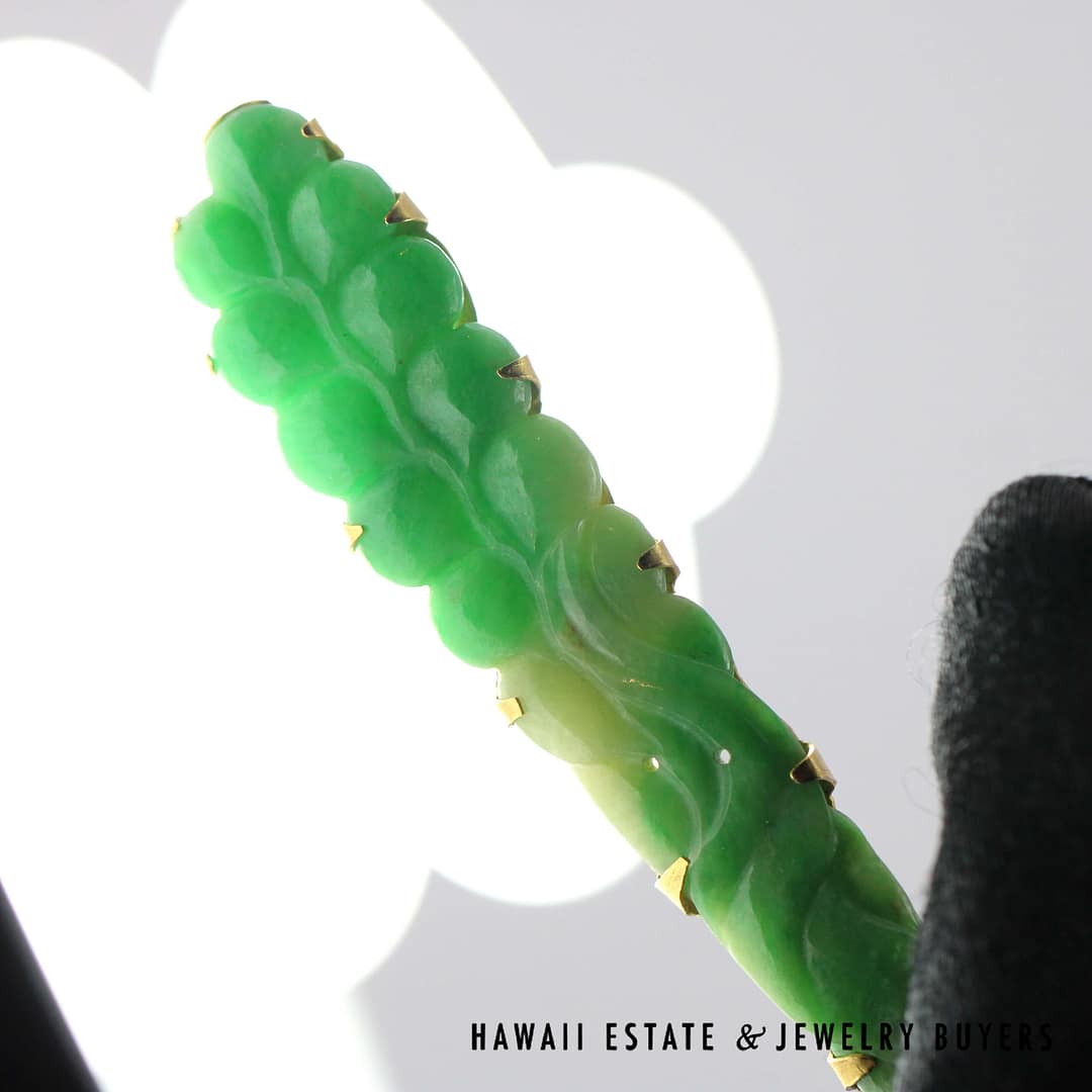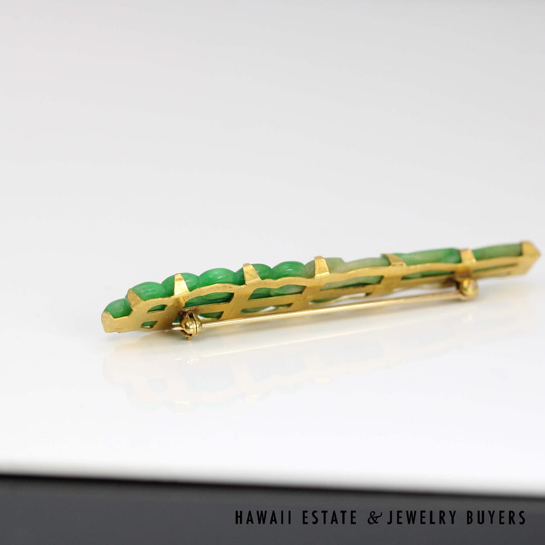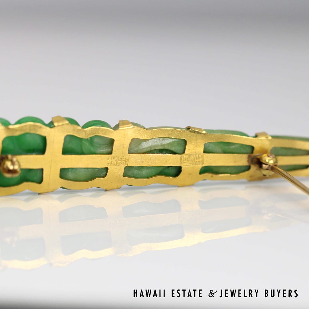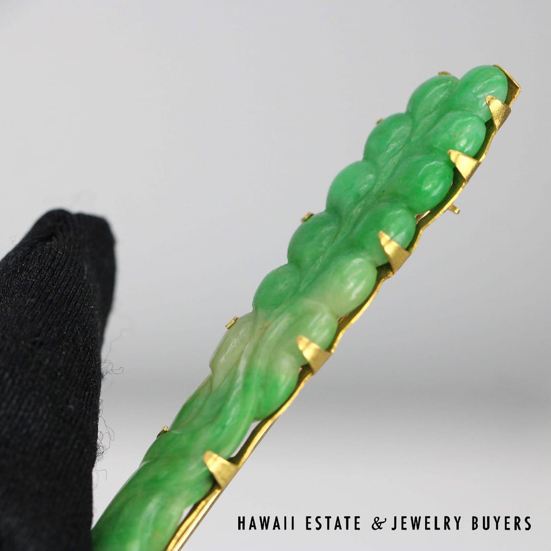 DescriptionBeautiful bar brooch with carved mottled green jade in 14K Yellow Gold.10.6g 14KYG CARVED MOTTLED GREEN JADE BROOCH (101422-23)$1,650.001 in stockAntique Chinese Mottled Green Jade Carved 14K Yellow Gold Brooch quantityAdd to cartMake OfferSKU: 101422-23Category: Pre-owned Jade JewelryRelated StylesMING’S 11g 14KYG LIGHT GRAY JADE BAMBOO PEARL CLUSTER CLIP EARRINGS w/MING’S BOX$2,200.009.3g 14KYG JADE DONUT 16mm DIAMETER CUFFLINKS$1,400.005.4g 14KYG GREEN JADE MARQUISE CABOCHON PENDANT$499.00GIA GREEN-GRAY JADE BANGLE BRACELET SIZE 7.25$4,900.00