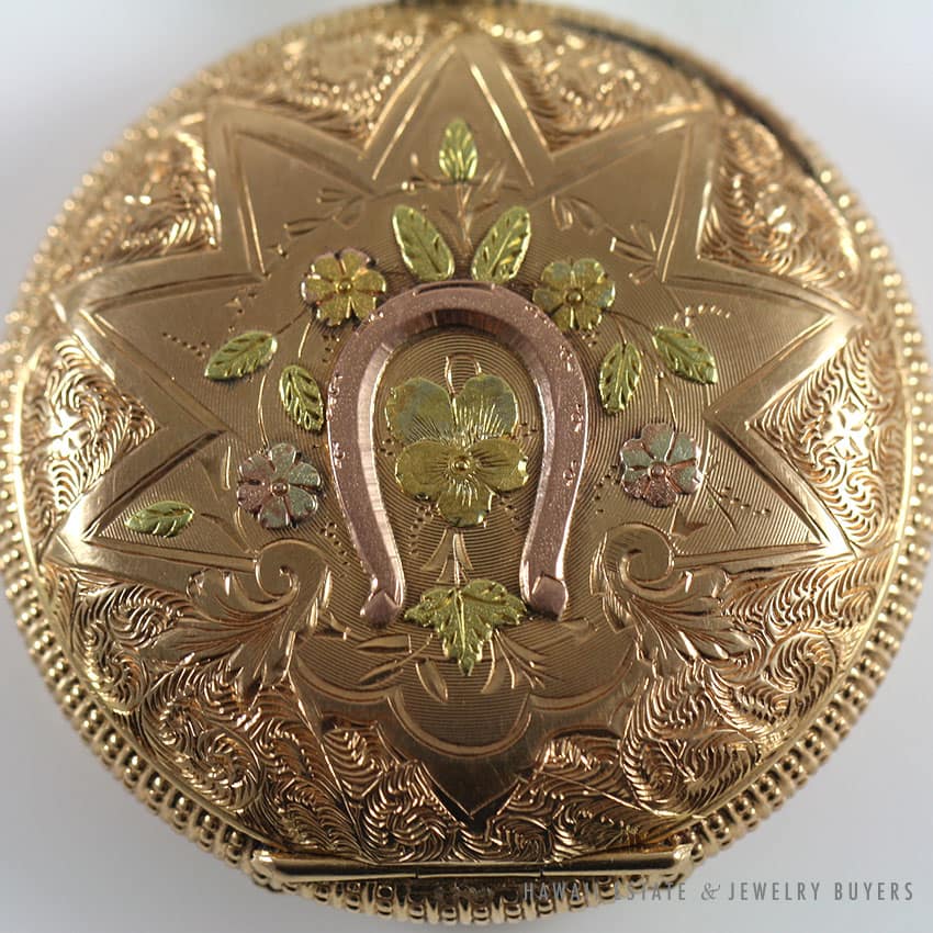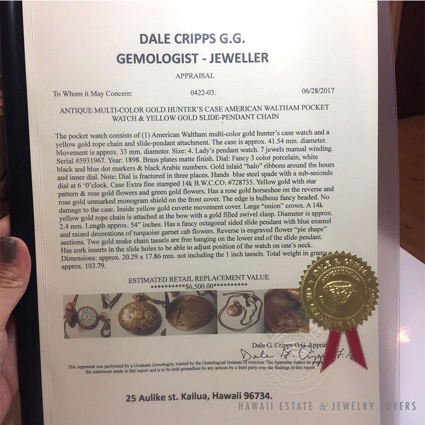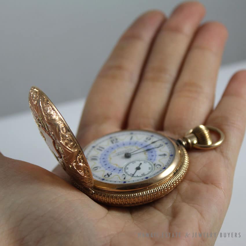 DescriptionComes with gemologist appraisal.– 41.54 mm diameter– Year: 1898– Stamped: 14k. B.W.C. CO. #728735– 7 jewels manual winding– Dial is fractured in 3 places $5,300.001 in stockANTIQUE HUNTER'S CASE AMERICAN WALTHAM POCKET WATCH & GOLD SLIDE-PENDANT CHAIN quantityAdd to cartMake OfferSKU: 0422-03Category: Pre-owned Luxury WatchesTag: Pocket WatchRelated StylesANTIQUE AMERICAN WALTHAM YELLOW GOLD HUNTER’S CASE 18K YELLOW GOLD POCKET WATCH$5,000.00ROLEX DAYTONA 116508 GREEN DIAL YELLOW GOLD 40MM , UNWORN SEPT 2020 CARD+BOX$90,000.00ROLEX RARE VINTAGE BUBBLE BACK 14K YELLOW GOLD OYSTER PERPETUAL WATCH 5015 1945$11,000.00Rolex DateJust Salmon Mid Size Ladies$4,900.00