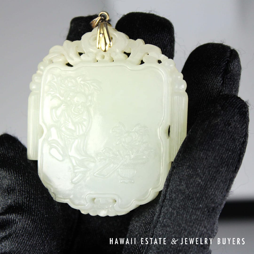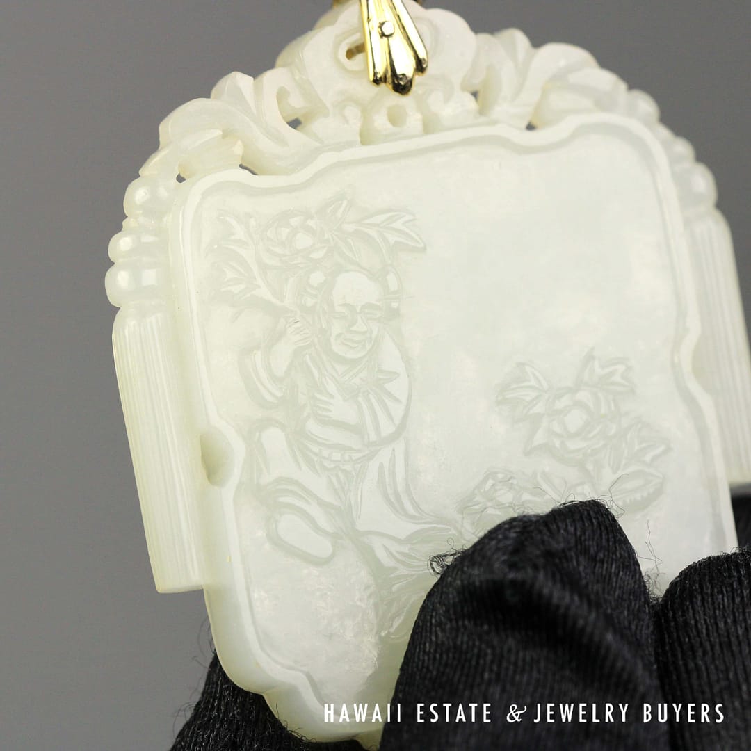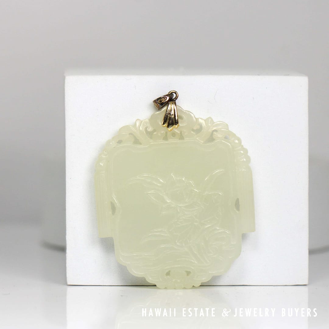 DescriptionRare jade known as 'Mutton Fat' in the trade, featuring a Floral Monk and Scrolls motif.ANTIQUE RARE MUTTON FAT JADE FLOWER & MONK SCROLLS PENDANT MEASURES 54X45mm (2790-03) $7,800.001 in stockAntique Rare Mutton Fat Jade Flower & Monk Scrolls Pendant 54x45mm quantityAdd to cartBuy withMake OfferSKU: 2790-03Category: Pre-owned Jade JewelryRelated StylesGIA 4.2g 14KWG 13x10MM OVAL GREEN CABOCHON JADE 0.50ctw DIAMOND RING SIZE 5$3,100.0011.1g 14KWG ICE JADE 2ctw DIAMOND CLIP ON EARRINGS$7,500.00GIA 68.2g 14KYG MOTTLED GREEN & LIGHT PURPLISH GRAY TYPE A HINGED BANGLE BRACELET SIZE 7.5$8,000.00GIA 58.8g 14KYG ORANGY BROWN & WHITE JADE HINGED BANGLE BRACELET SIZE 8$4,500.00