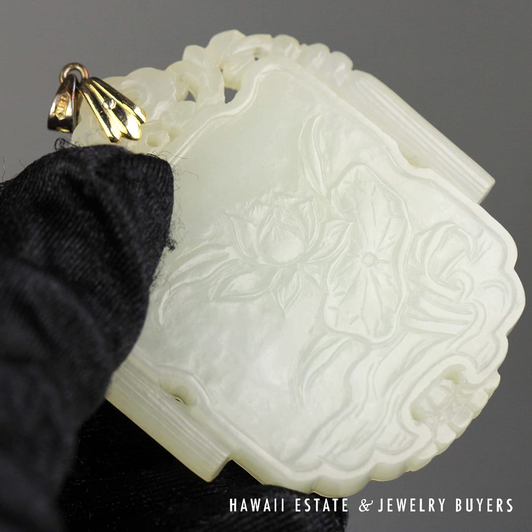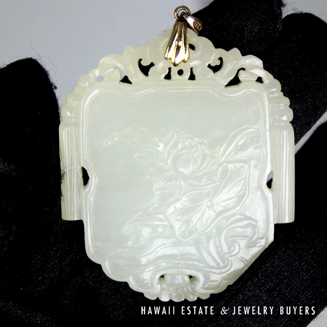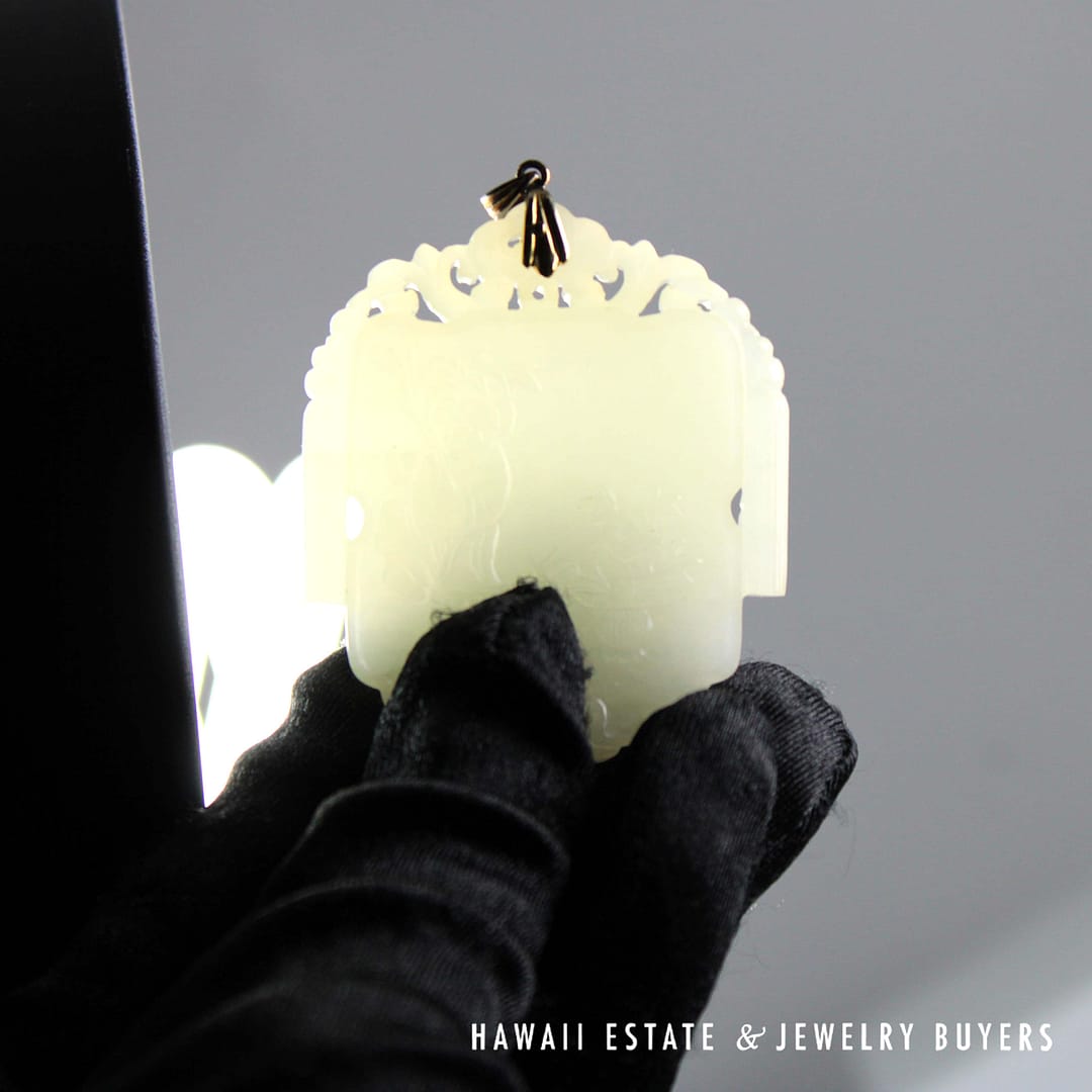 DescriptionRare jade known as 'Mutton Fat' in the trade, featuring a Floral Monk and Scrolls motif.ANTIQUE RARE MUTTON FAT JADE FLOWER & MONK SCROLLS PENDANT MEASURES 54X45mm (2790-03) $7,800.001 in stockAntique Rare Mutton Fat Jade Flower & Monk Scrolls Pendant 54x45mm quantityAdd to cartBuy withMake OfferSKU: 2790-03Category: Pre-owned Jade JewelryRelated StylesGIA 4.2g 14KWG 13x10MM OVAL GREEN CABOCHON JADE 0.50ctw DIAMOND RING SIZE 5$3,100.0011.1g 14KWG ICE JADE 2ctw DIAMOND CLIP ON EARRINGS$7,500.00GIA 68.2g 14KYG MOTTLED GREEN & LIGHT PURPLISH GRAY TYPE A HINGED BANGLE BRACELET SIZE 7.5$8,000.00GIA 58.8g 14KYG ORANGY BROWN & WHITE JADE HINGED BANGLE BRACELET SIZE 8$4,500.00