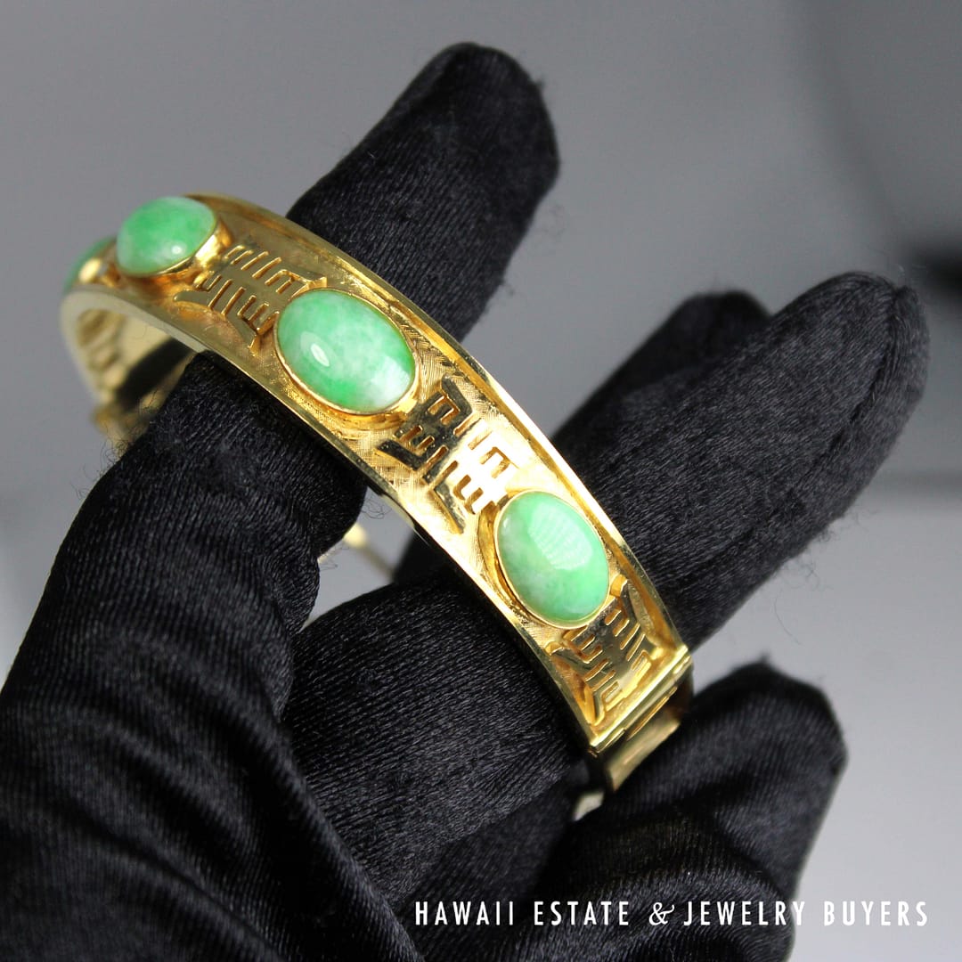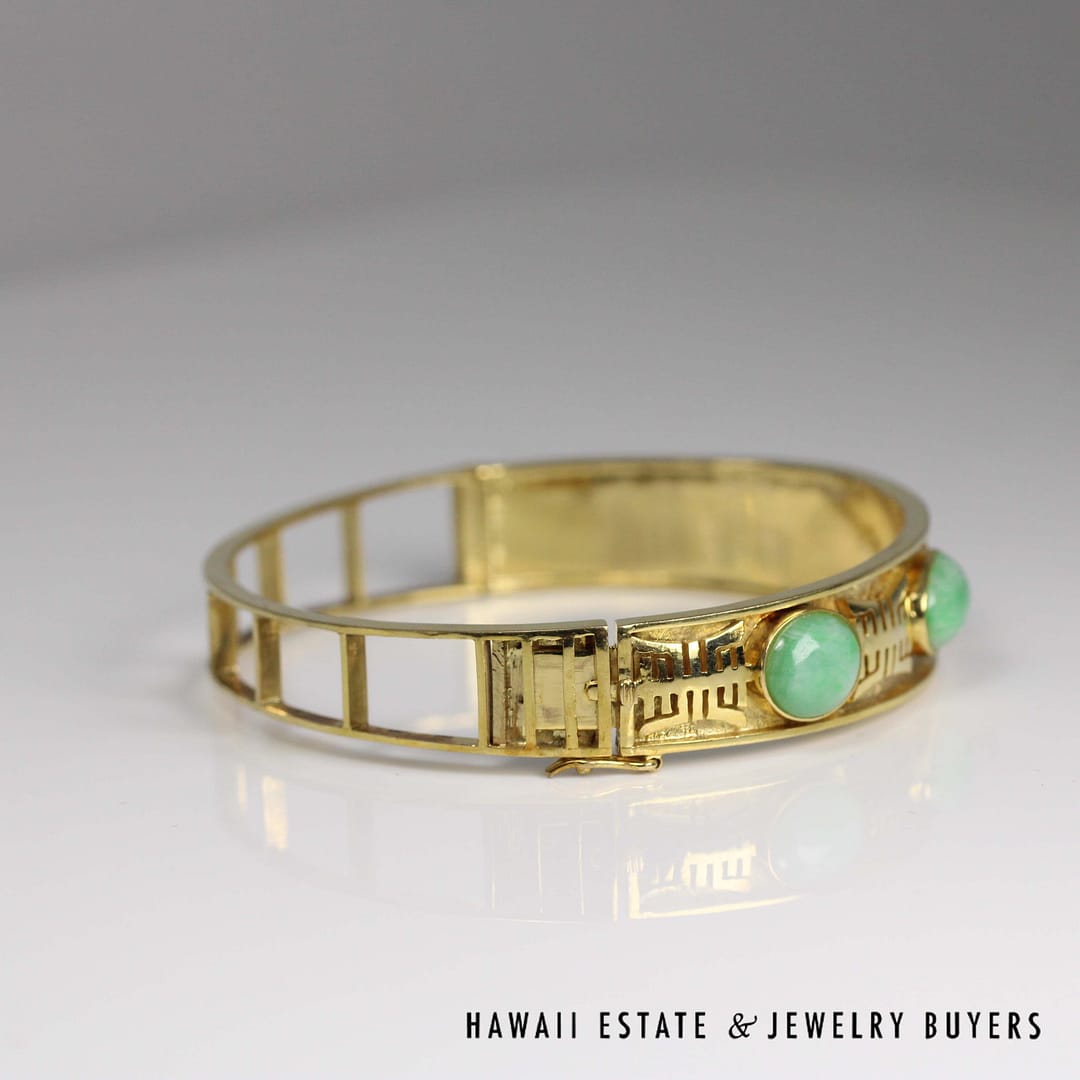 Gorgeous vintage 14K Yellow Gold hinged bangle with beautiful green jade cabochons and Chinese characters. Perfect for any vintage jewelry lover.