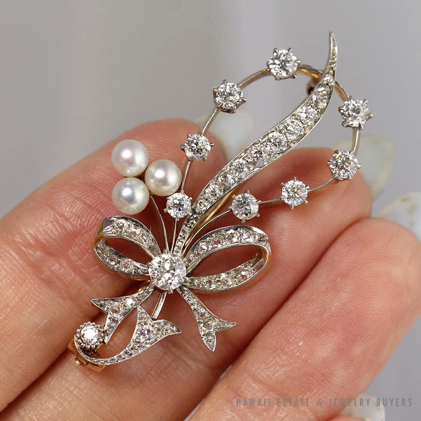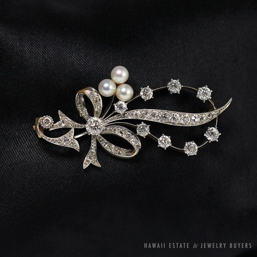The piece is set with very high quality Old European Cut Diamonds, estimated total weight approx. 2.50ctw, and three 4.3mm half drilled round cultured pearls of high luster and low blemish.