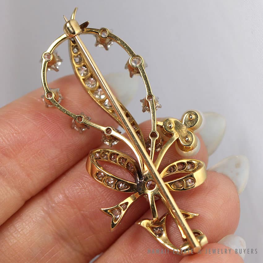 This vintage piece is hand assembled and highly detailed, With the upper portion of the brooch created in platinum, and the lower portion and hinged pin stem of yellow gold acid tested to be 18K.