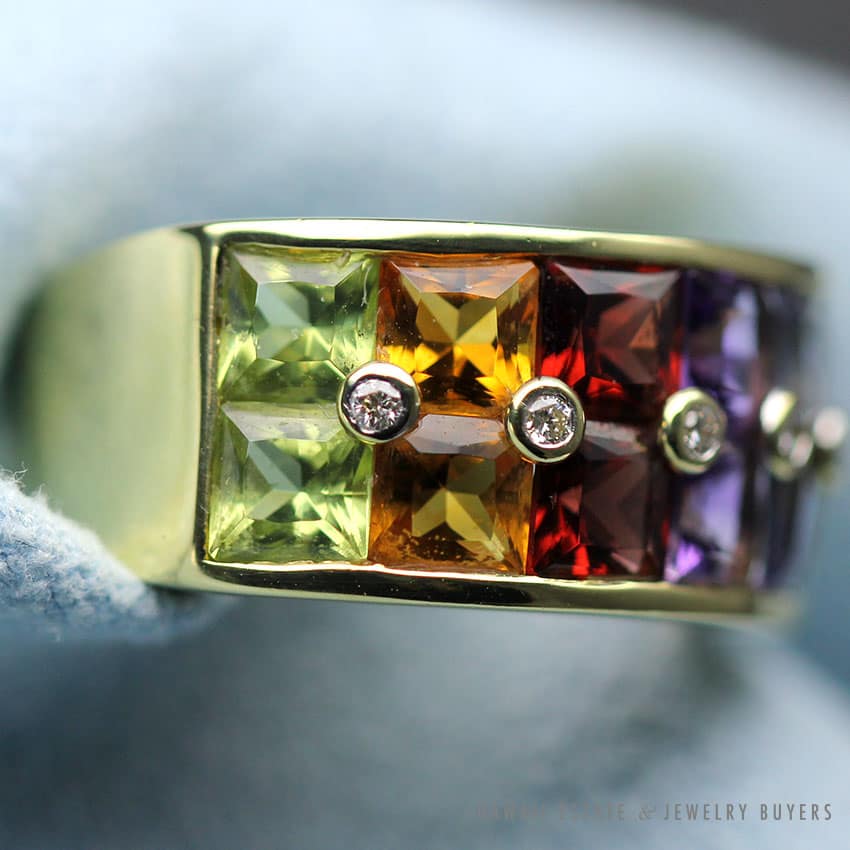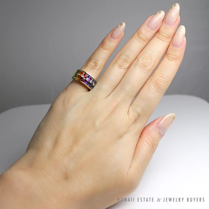 DescriptionH. STERN RAINBOW GEMSTONE DOUBLE ROW RINGTWELVE APPROX 4.2X4.2MM PRINCESS CUT AMETHYST, CITRINE, GARNET, IOLITE, PERIDOT, TOPAZ, AND TOURMALINESTAMPED “750”SIZE 6.5PROFESSIONALLY POLISHED$2,800.00Out of stockSKU: 2316-01Category: Pre-owned Designer JewelryTag: h. sternRelated StylesTIFFANY & CO. 15MM SOUTH SEA CULTURED PEARL PLATINUM ELSA PERETTI PENDANT & NECKLACE 32″ WITH FOLIO, BOX & PAPER$8,000.00Scot Kay .64ct Round Brilliant Rose Gold White Gold Two Tone Engagement Ring (Sz 8.25)$3,800.00Roberto Coin Cento Diamond Ring$3,800.00Michael B. Platinum Eternity Band$1,600.00