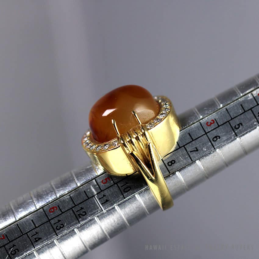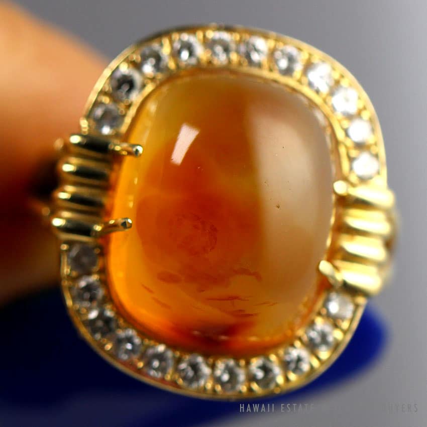 Yellow gold stamped BH 18K is set with a 14.5 x 11.5 x 7mm modified sugarloaf cabochon translucent agate, surrounded by 0.66ctw (estimated) VS/GH clarity/color Full Cut Round Brilliant Diamonds.