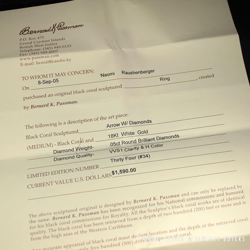 DescriptionSigned, authentic (comes w/ original receipt)Metal: 18K White GoldSize: 6.25SKU: 1765-01$1,900.001 in stockBernard K Passman Black Coral 18K White Gold Diamond Ring quantityAdd to cartBuy withMake OfferSKU: 1765-01Category: Pre-owned Designer JewelryRelated StylesTiffany & Co Platinum Diamond Eternity Band$1,800.00Michael B. Diamond Paris 3 sided diamond Pave Rings$10,000.00VINTAGE MIKIMOTO AAA AKOYA PEARL 14K BROOCH & SCREW BACK EARRINGS SET$4,000.00Roberto Coin Cento Diamond Ring$3,800.00