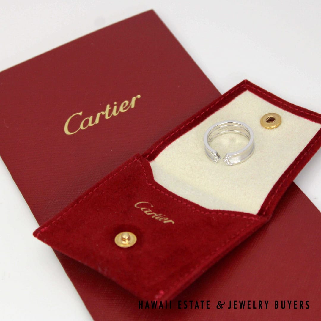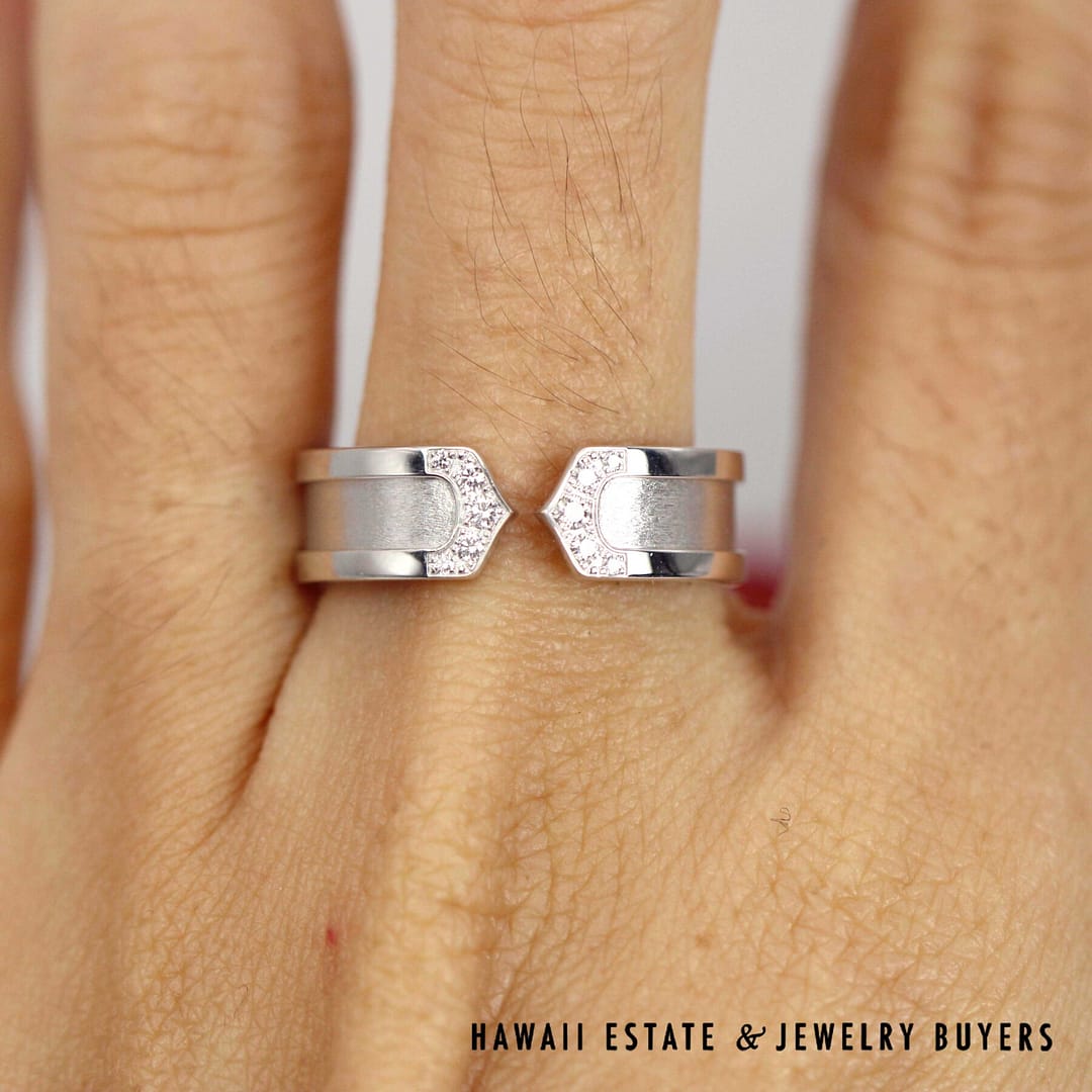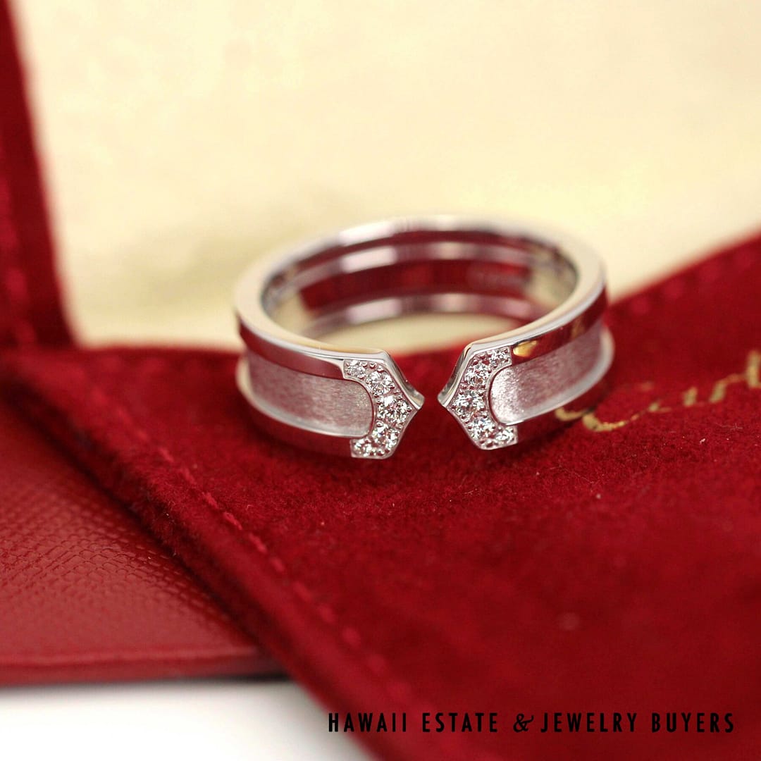 DescriptionRing is 6.5mm width, Serial number is XXX757CARTIER 8.2g 18KWG DOUBLE C DIAMOND RING SIZE 57/8 (101323-01)$1,550.00Out of stockSKU: 101323-01Category: Pre-owned Designer JewelryRelated StylesSTEVEN KRETCHMER ENGAGEMENT RING ETOILE WEDDING BAND SET PLATINUM .98CTW SZ 4.25$9,500.00Bernard K Passman Black Coral 18K White Gold Diamond Ring$1,900.00TIFFANY & CO. NATURAL GIA BLUE SAPPHIRE & .77CTW DIAMOND PLATINUM RING W/ PAPERS SIZE 6$10,000.00GIA 0.57 ROUND BRILLIANT TACORI DANTELA 18K WHITE GOLD ENGAGEMENT RING – E VVS1$5,600.00