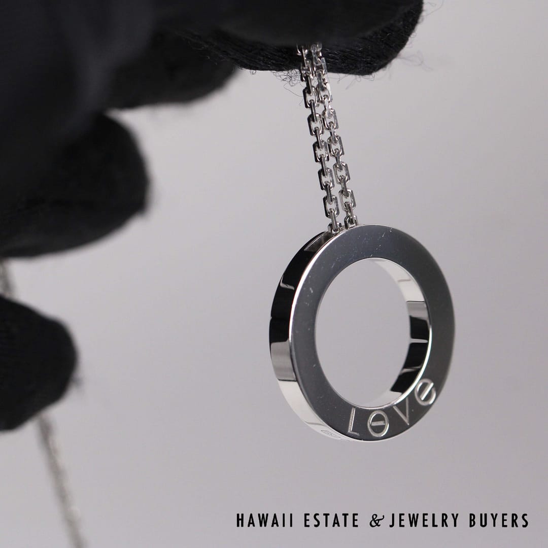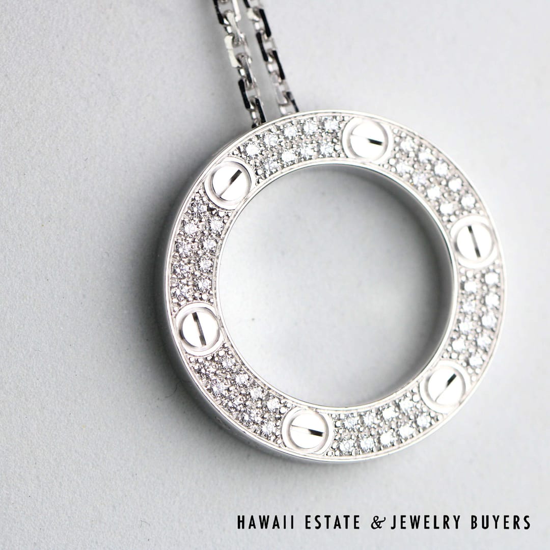 Gorgeous authentic Cartier Love necklace, adorned with diamond pave, in 18K White gold with 16" chain. Comes with iconic original Cartier box and outer box.