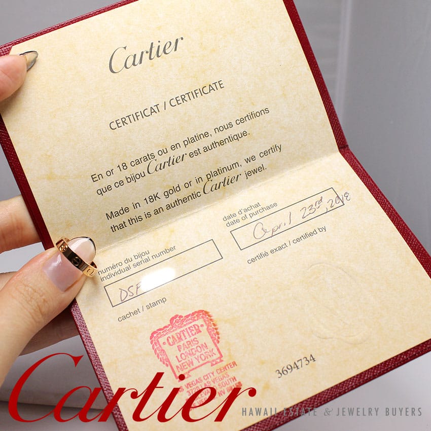 DescriptionCARTIER LOVE COLLECTIONSTAMPED: CARTIER 48 DSXXXX AU750RING SIZE 48 (US 4.5)APPROXIMATELY 3MM THICKCOMES WITH ORIGINAL CARTIER CERTIFICATEPROFESSIONALLY POLISHED$990.00Out of stockSKU: 2442-03Category: Pre-owned Designer JewelryTags: CARTIER, cartier loveRelated StylesCartier Diamond Trinity Ring (SZ 57/US 8 )$14,500.00PANDORA CHARM BRACELET WITH 13 PANDORA CHARMS STERLING SILVER W/ BOX$500.00Roberto Coin Baby O Earrings$16,000.00MIKIMOTO AAA AKOYA PEARL 4-6MM WHITE 14K YELLOW GOLD FLOWER BROOCH PIN & EARRINGS SET$2,000.00