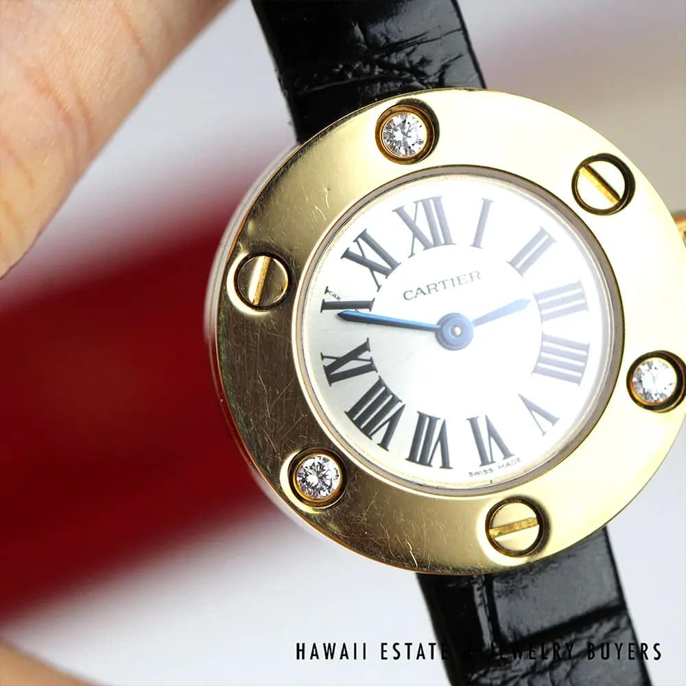DescriptionSTUNNING FIND! Authentic Cartier Diamond Love Watch with a NEW CARTIER CROC BAND! Comes with original red Cartier dust sleeve as shown. CARTIER 18KYG DIAMOND LOVE WATCH REF 3016 WITH NEW CARTIER CROC BAND (2180-01)$3,800.00Out of stockSKU: 2180-01Categories: Pre-owned Designer Jewelry, Pre-owned Luxury WatchesRelated StylesRolex DateJust Salmon Mid Size Ladies$4,900.00BLVGARI WATCH WITH HANDWRITTEN LETTER BY DORIS DUKE to LON BENTLEY W/ ENGRAVING$11,000.00RARE ROLEX SUBMARINER 1680 BLACK NIPPLE DIAL 18K YELLOW GOLD BRACELET WATCH$79,900.00CHOPARD 18K HAPPY DIAMONDS RIBBON WATCH WITH POUCH AND CERTIFICATE$9,500.00