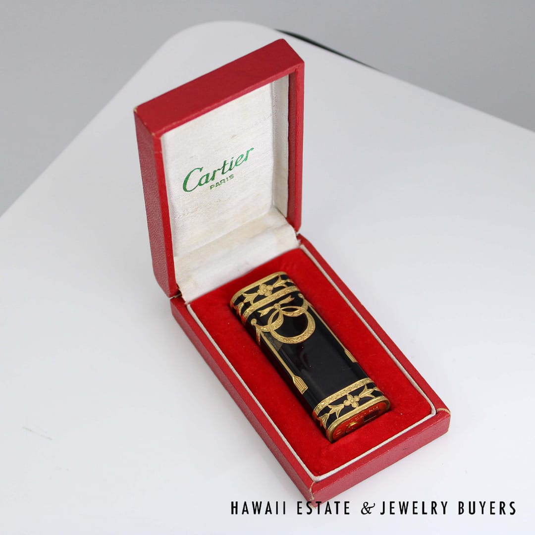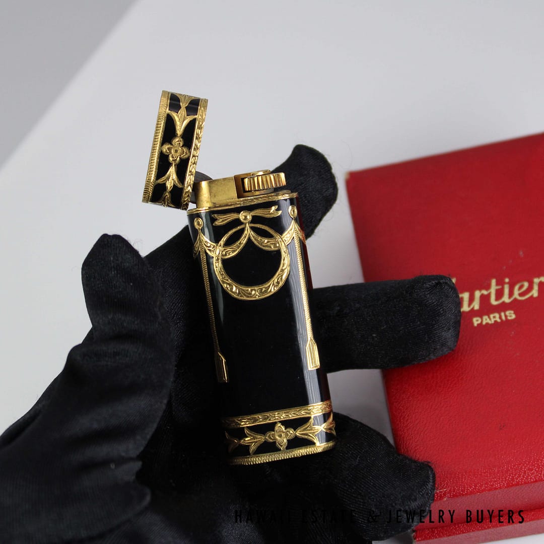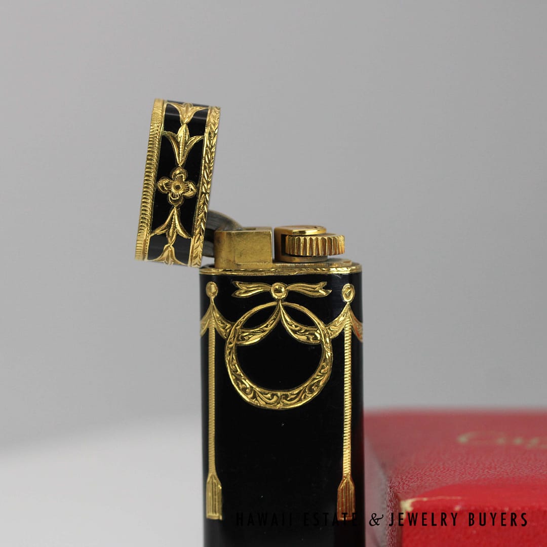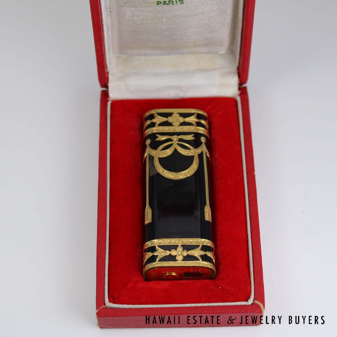 Elevate your collection with this rare Cartier Roy King baroque black and gold lighter, a striking blend of luxury and craftsmanship that comes complete with its original box.