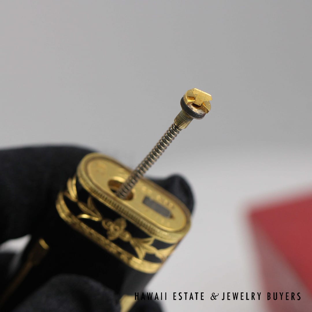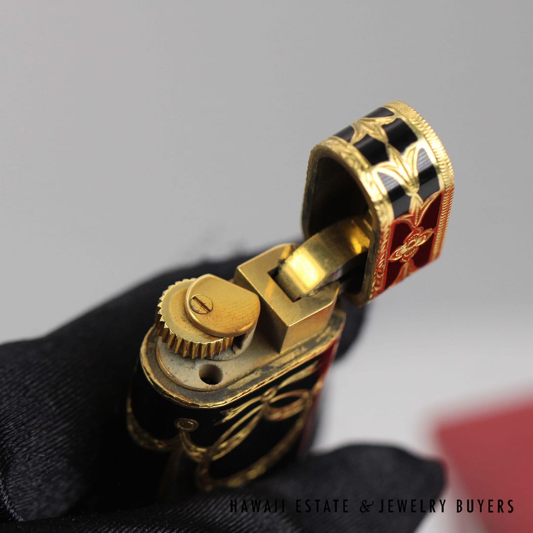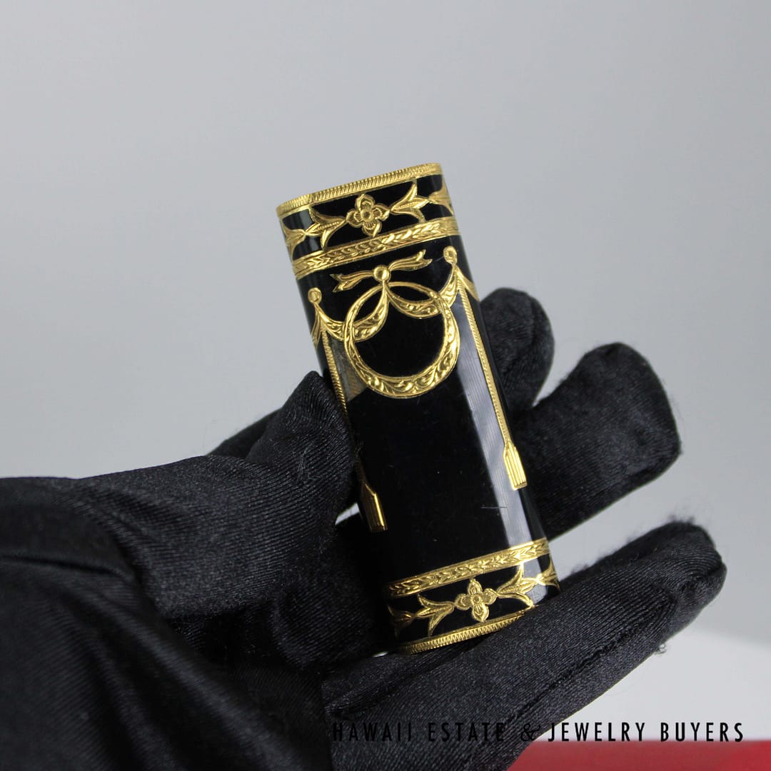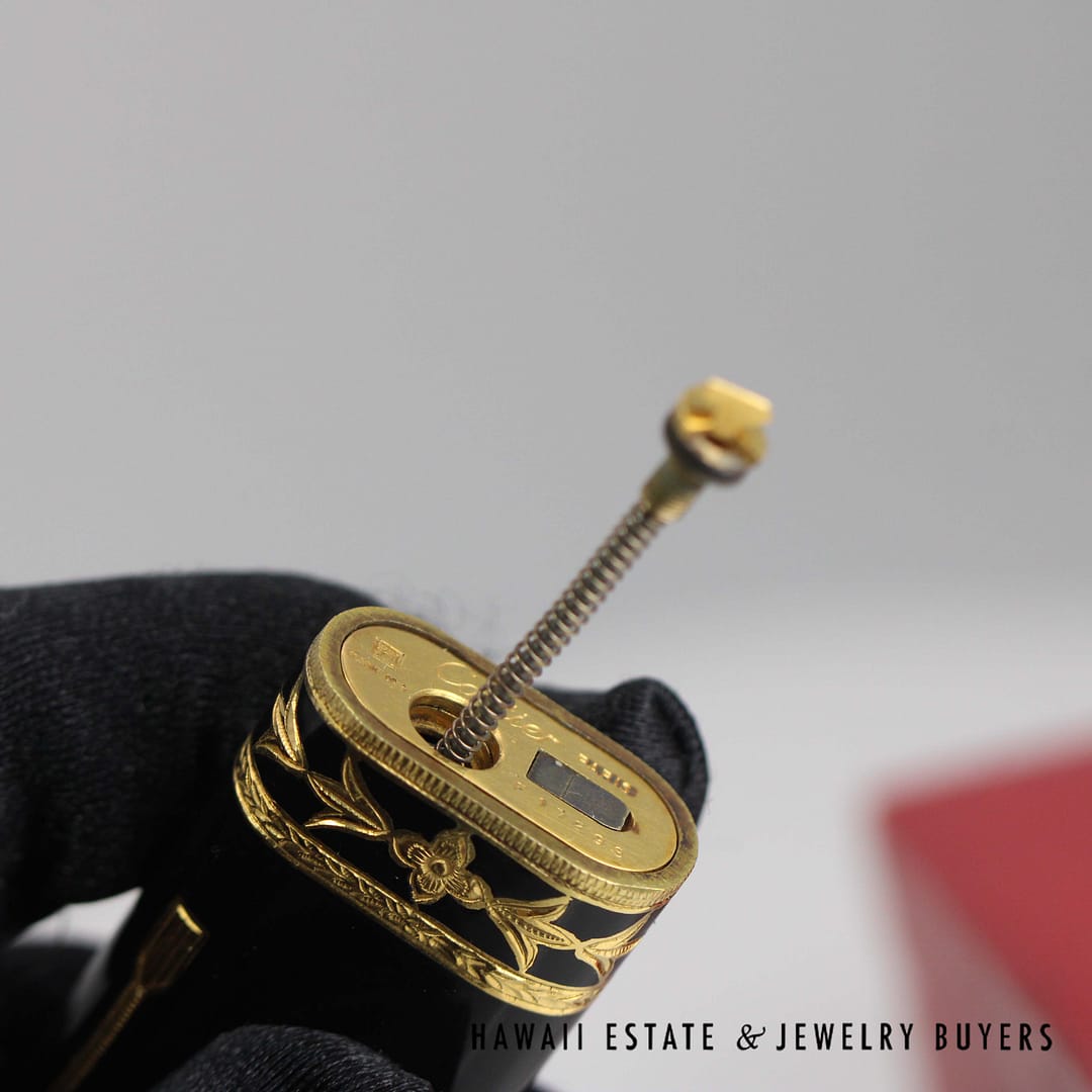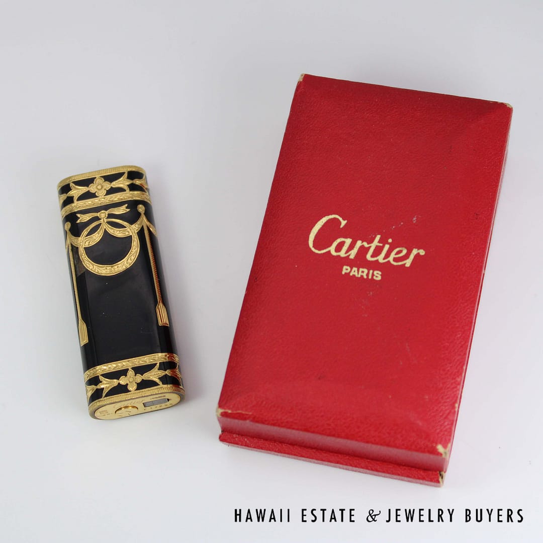 Elevate your collection with this rare Cartier Roy King baroque black and gold lighter, a striking blend of luxury and craftsmanship that comes complete with its original box.