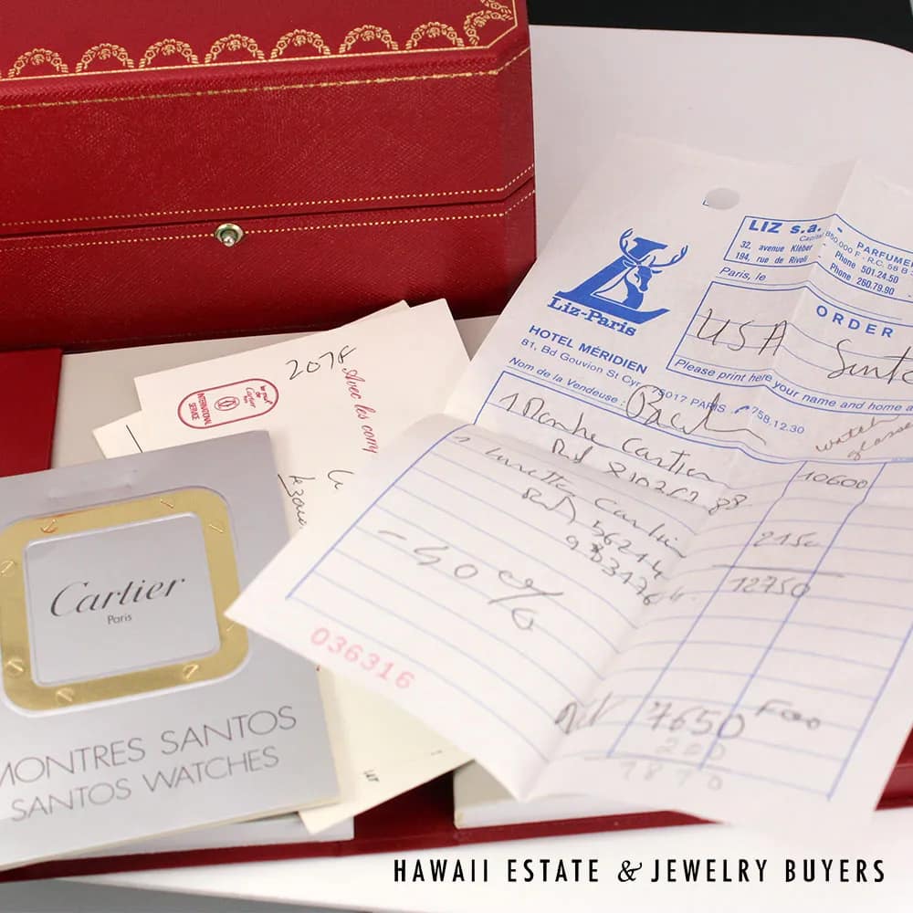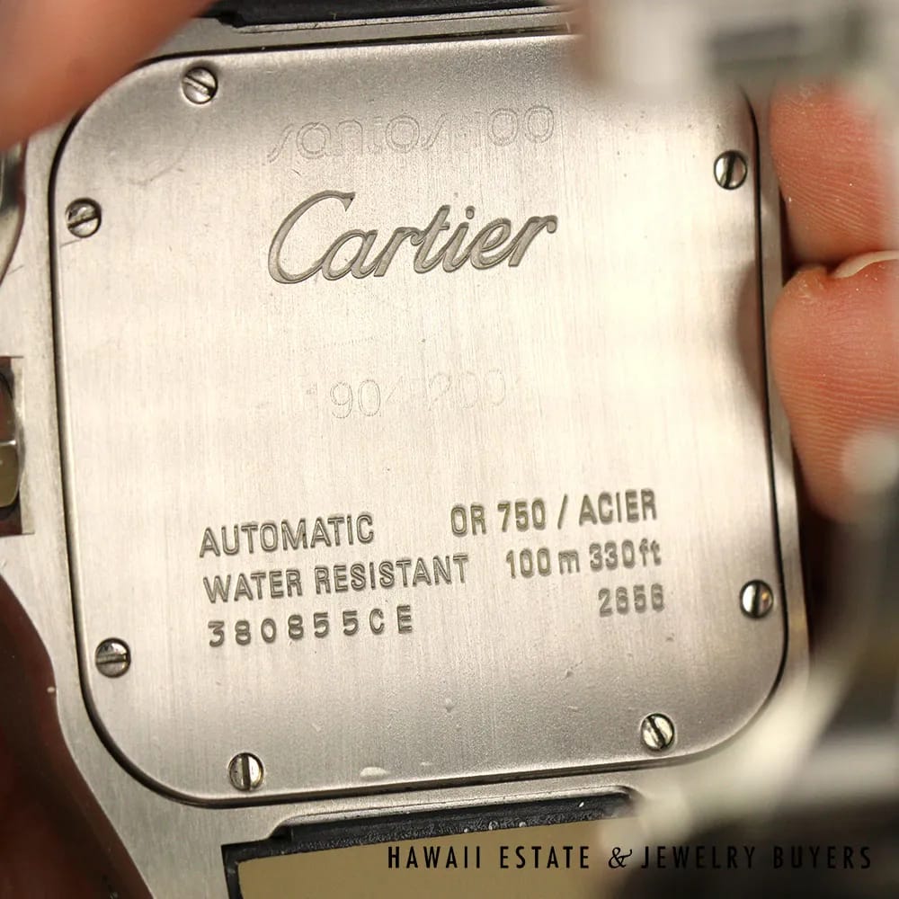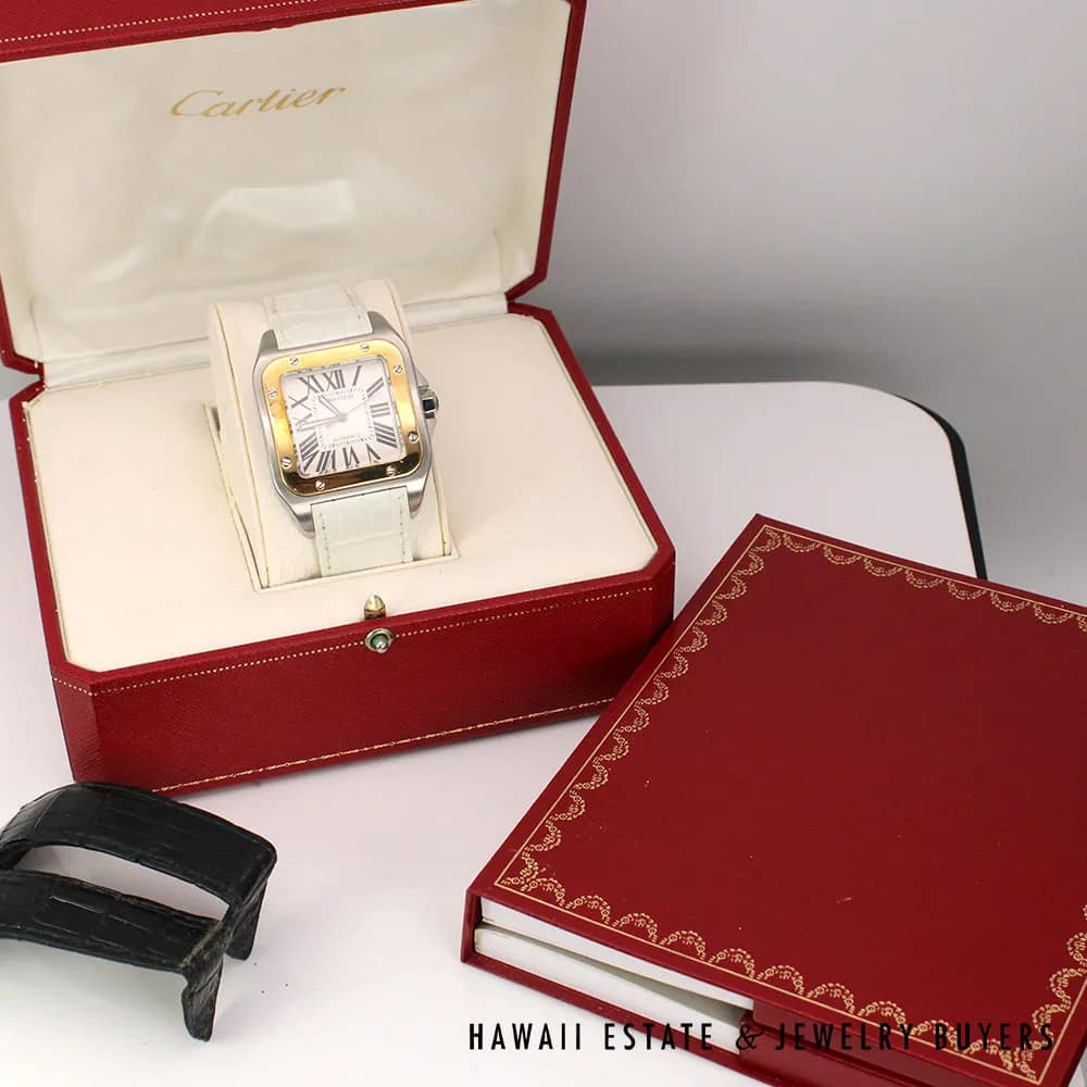 This Cartier Santos XL wristwatch is a stunning timepiece with a two-toned design, it features a white leather strap that adds to its elegant appeal. The watch is automatic and comes with the original Cartier box, including Cartier booklets, papers, making it an excellent gift, comes also with original black bands (with wear).