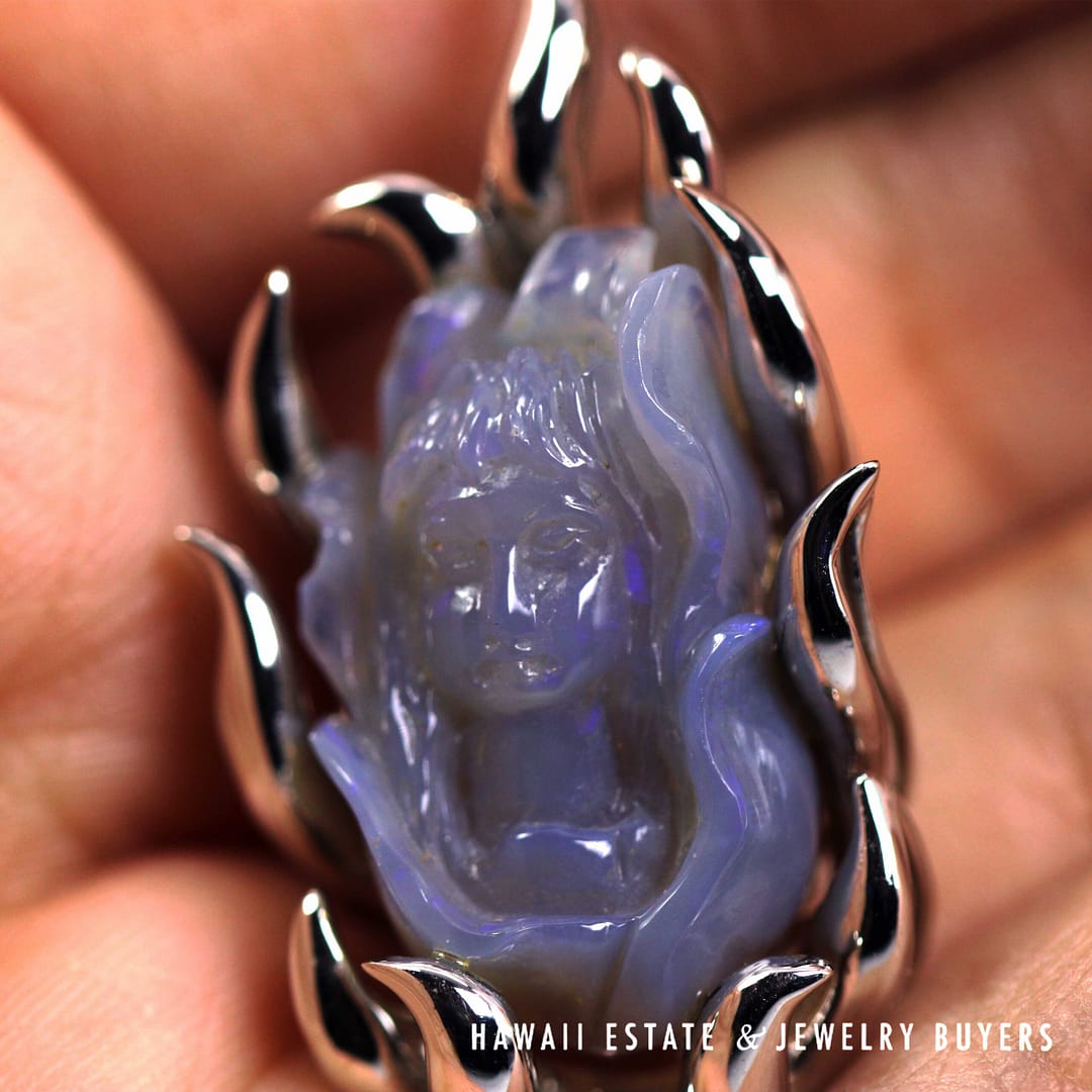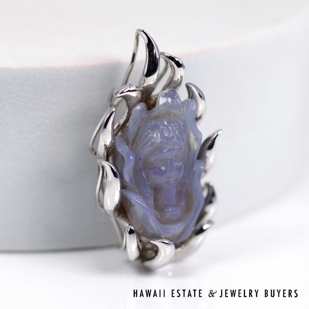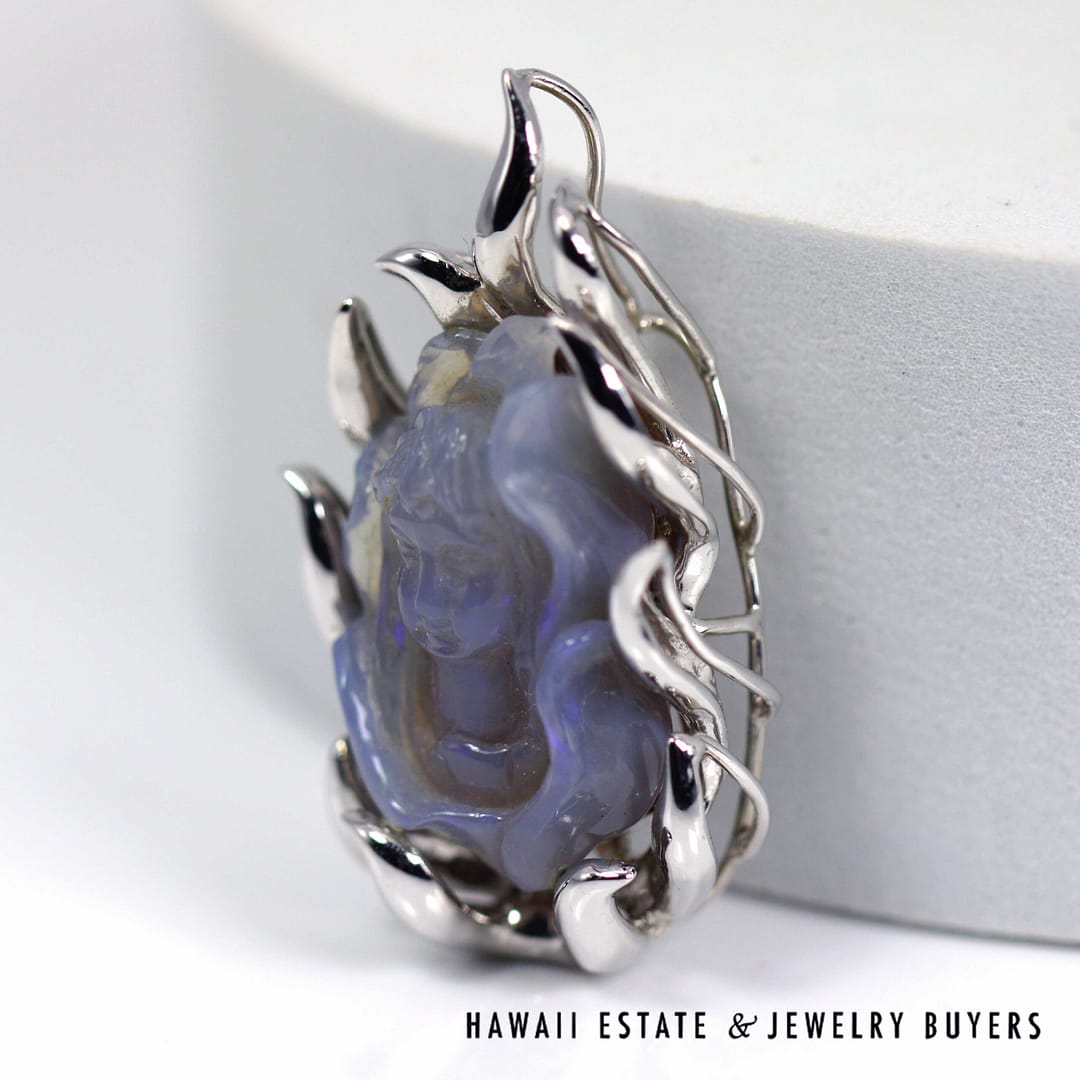 Beautiful hand-carved lavender-blue gemstone figure pendant set in a 18K white gold flame-style mounting, showcasing intricate detail and a luminous, translucent glow.