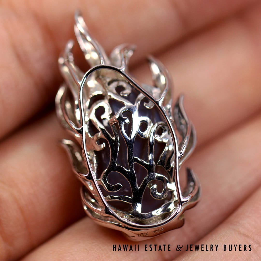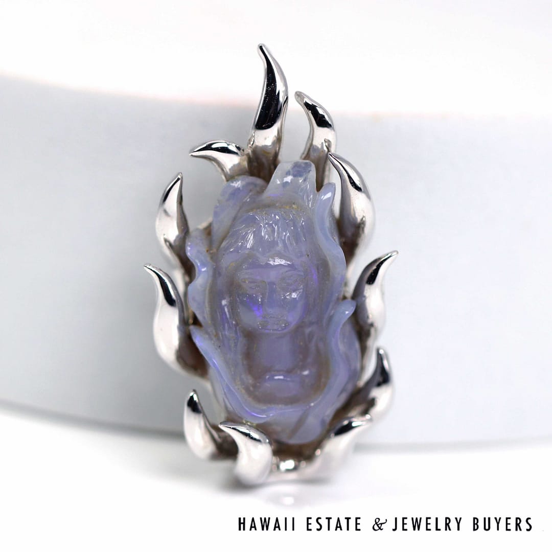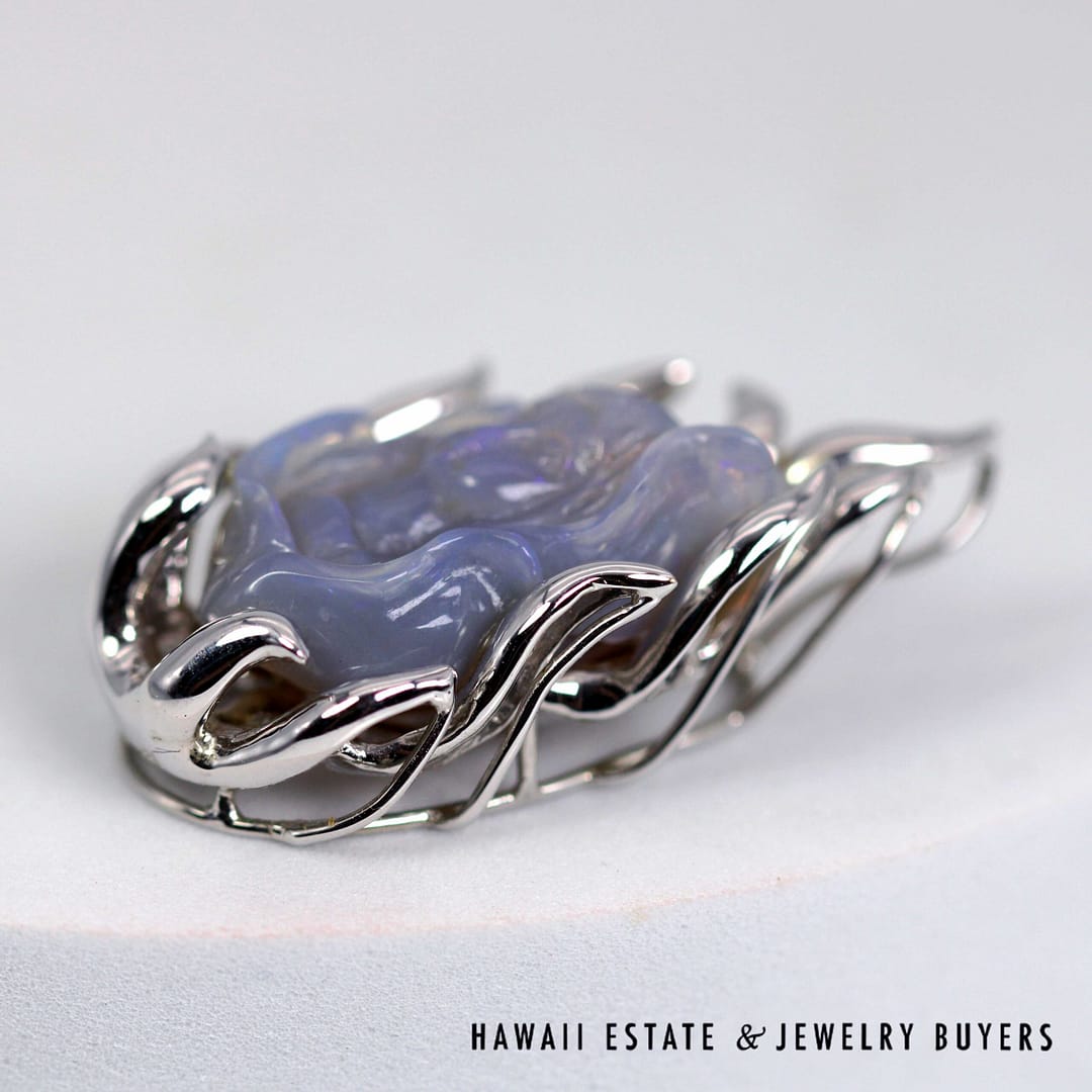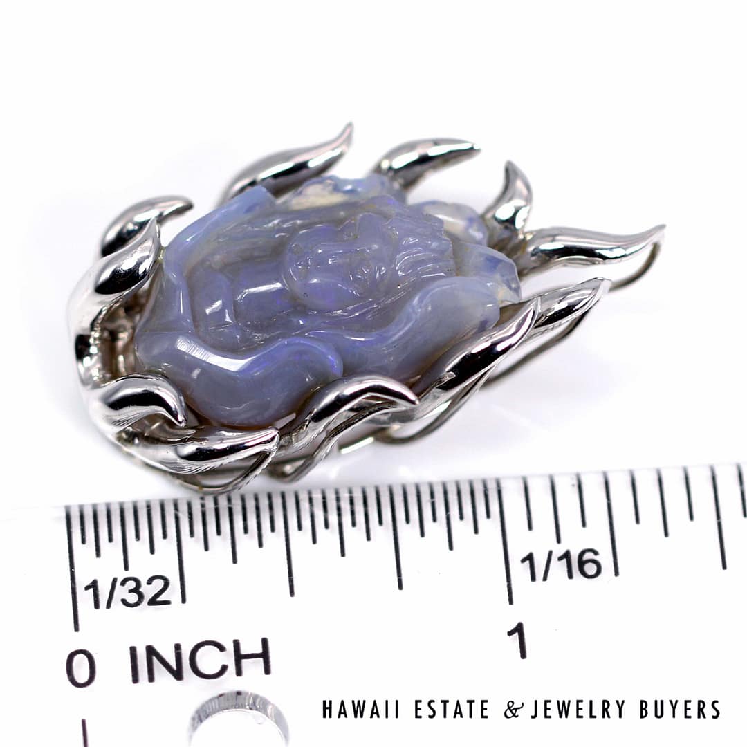 Beautiful hand-carved lavender-blue gemstone figure pendant set in a 18K white gold flame-style mounting, showcasing intricate detail and a luminous, translucent glow.