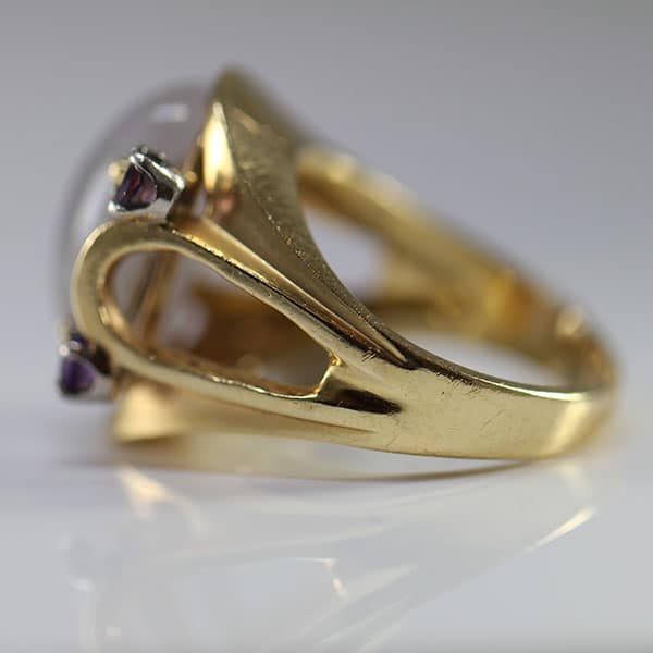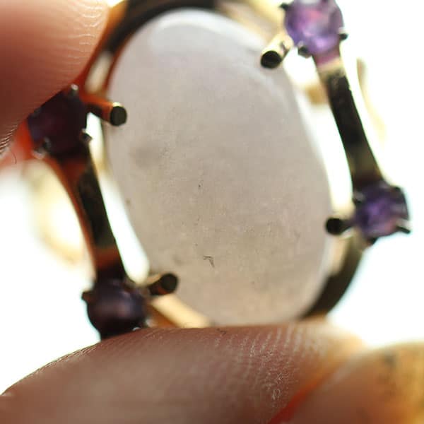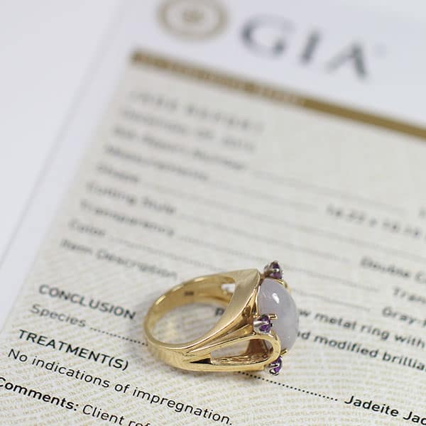 DescriptionSet in a yellow gold ring with four purple round modified brilliants.GIA Report #: 1166813068Shape: Double CabochonTransparency: TranslucentColor: Gray-PurpleSKU: 1726-11$2,700.001 in stockCertified Grade "A" Lavender Jade Yellow Gold Ring quantityAdd to cartBuy withMake OfferSKU: 1726-11Category: Pre-owned Vintage & Jade JewelryRelated StylesNatural Lavender Cabochon Pendant$2,300.001.65ct Natural Pink Sapphire and Diamond Ring$6,500.00GIA Certified Apple Green Jade Donut Drop 14K Earrings$3,100.00GIA CERTIFIED NATURAL GRADE A LAVENDER JADEITE JADE PENDANT W/ DIAMONDS$5,900.00