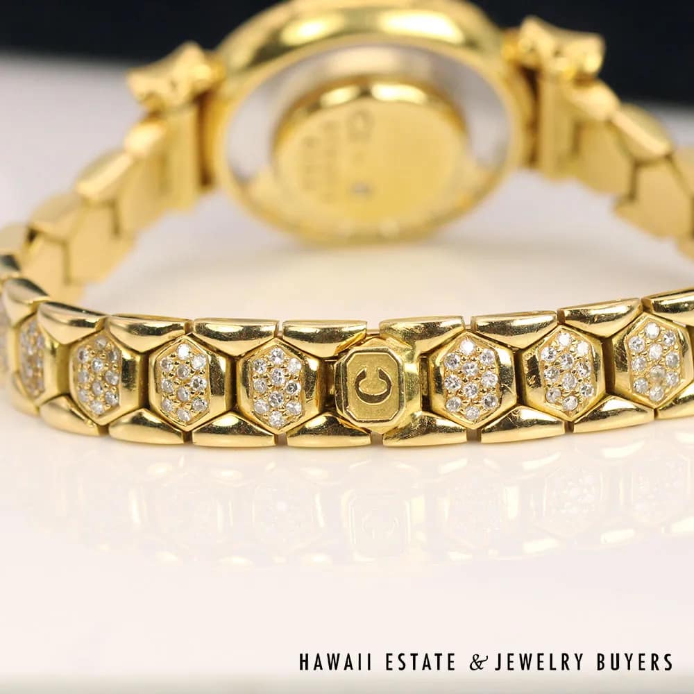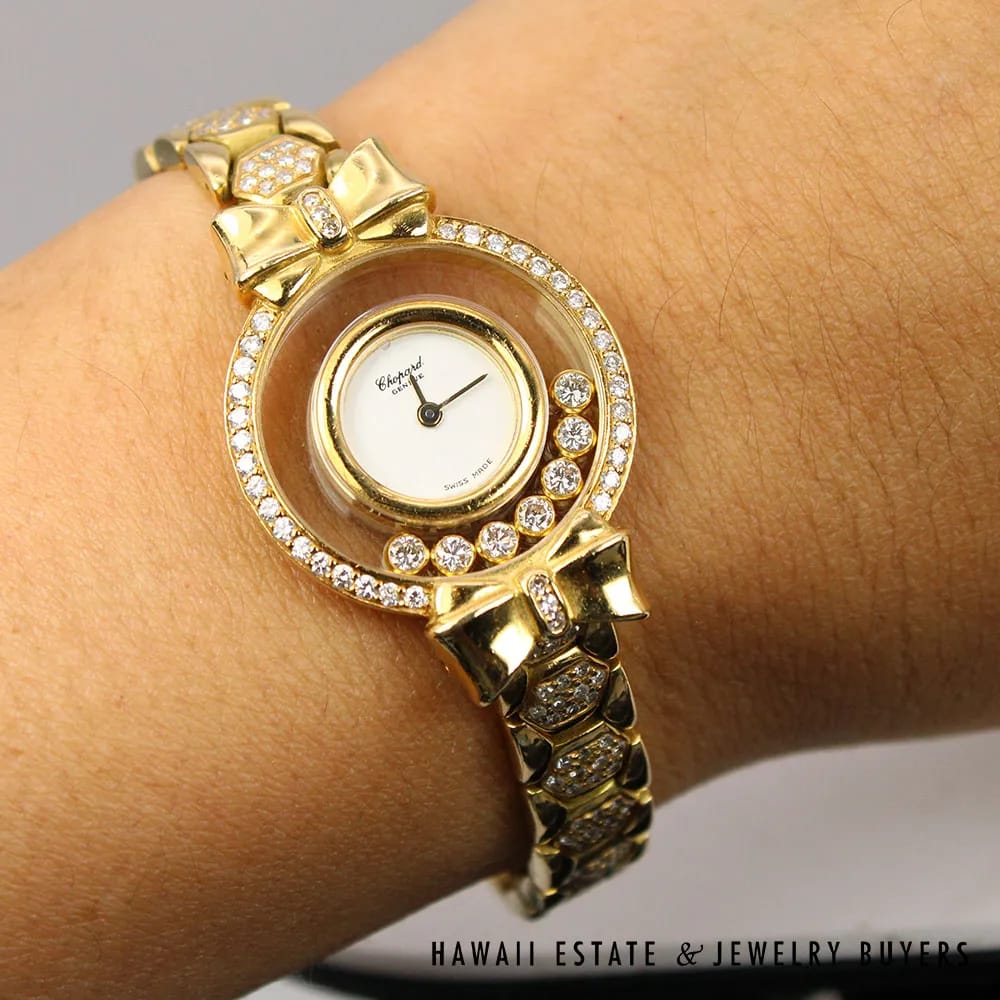 This stunning Chopard wristwatch features diamonds on the band and 5 free-moving bezel set diamonds that move around the face. This listing includes a pouch and certificate card as shown, making it the perfect gift for any watch collector or fashion enthusiast. The double-locking fold-over clasp ensures a secure fit, and the yellow gold case and dial complete the elegant look. Don’t miss out on the opportunity to own this Chopard Happy Diamonds watch. REF. 205336 SIZE 5.25