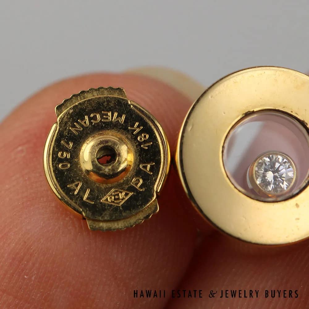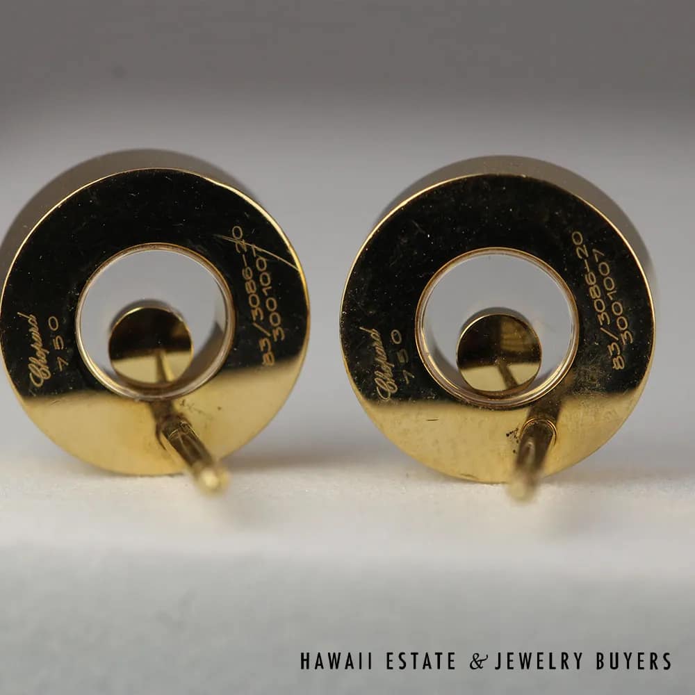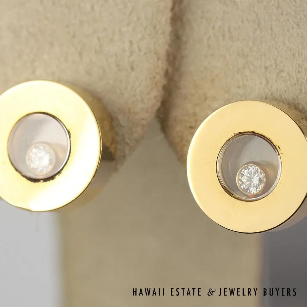 Crafted from 18K yellow gold, these earrings feature a round white diamond contained within crystal windows that move and dance with the slightest movement. The earrings are signed and come with a locking clutch for a secure fit. Perfect for any occasion, these Chopard Happy Diamonds earrings will make a statement that will never go unnoticed.