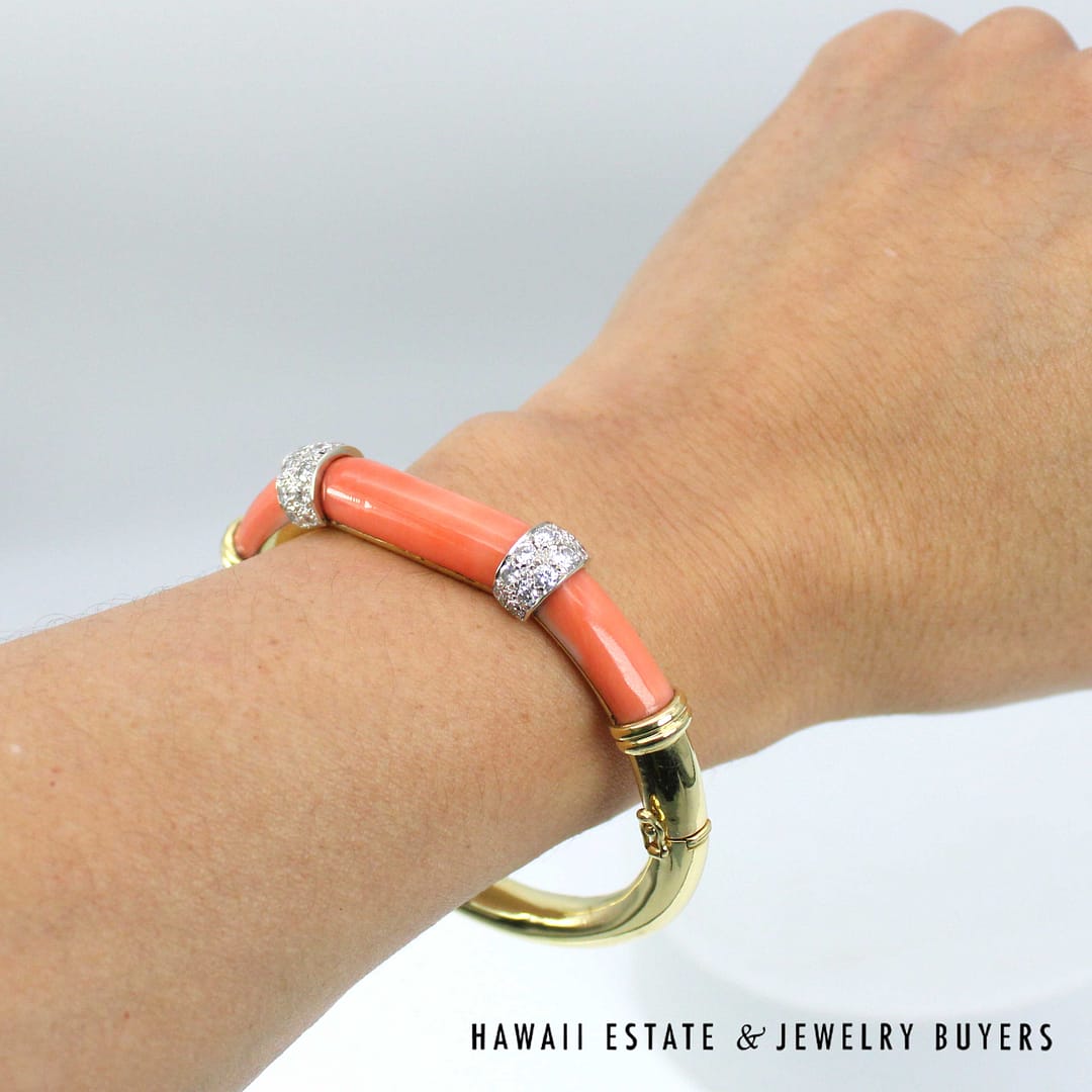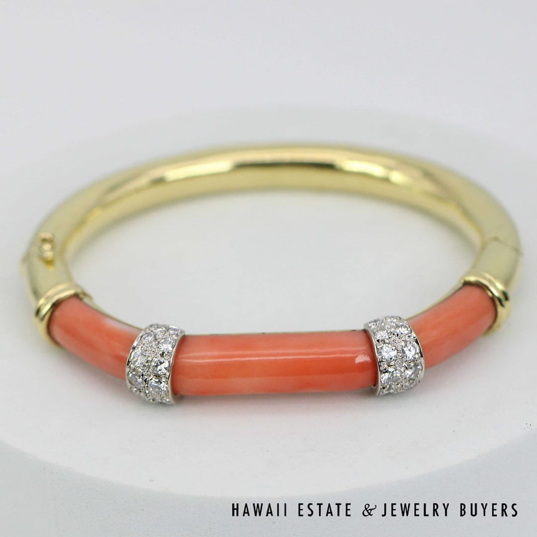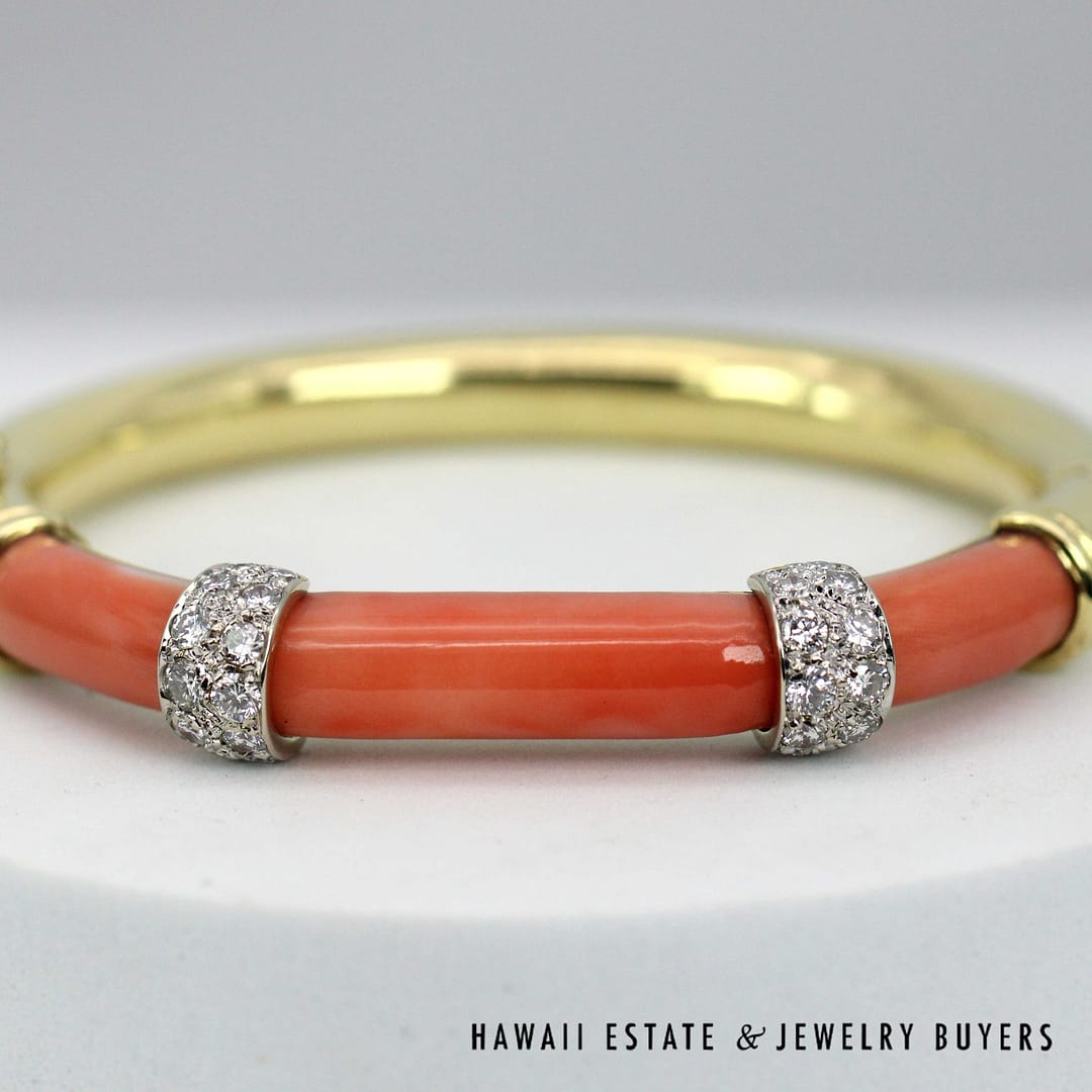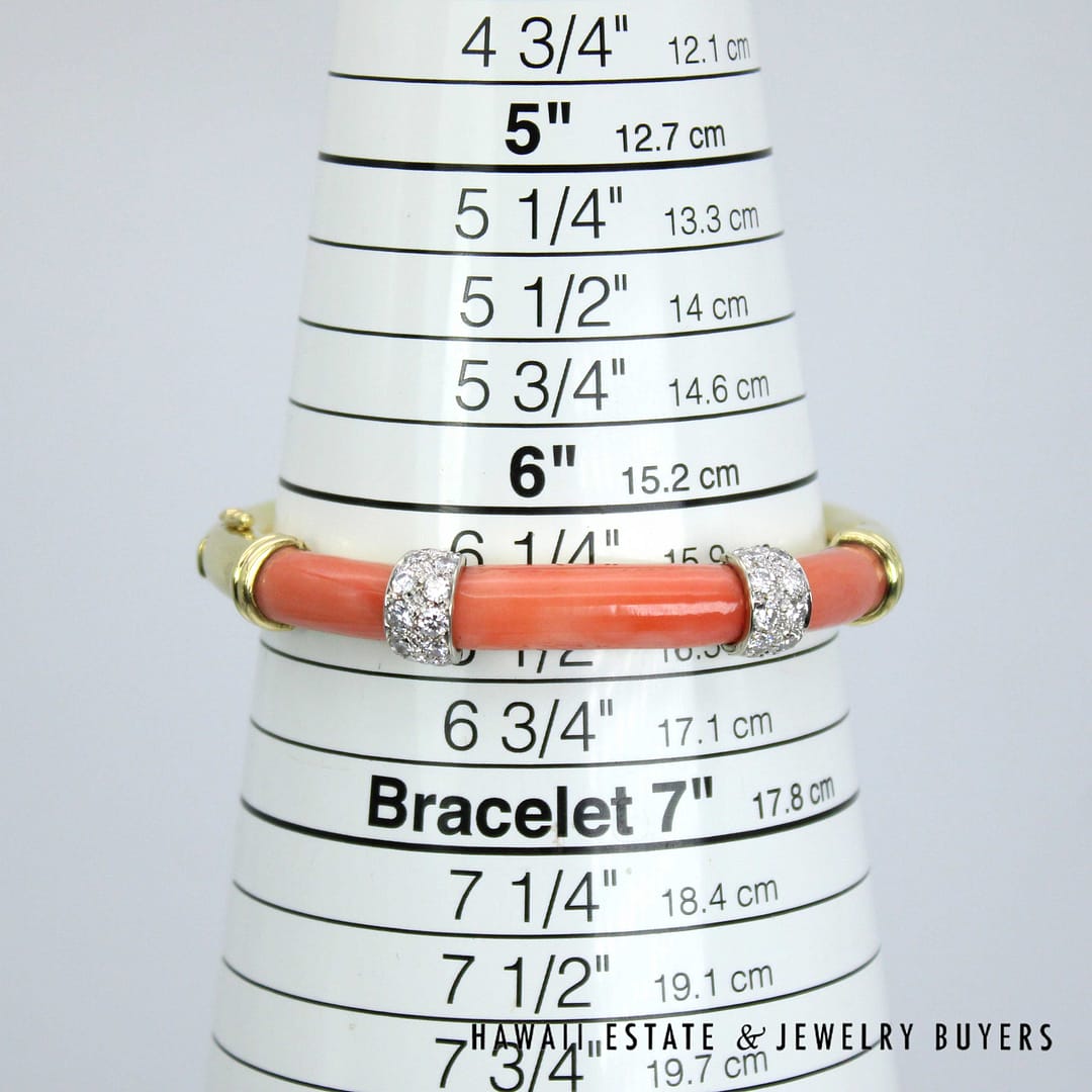 DescriptionElegant 18K yellow gold bangle bracelet featuring vibrant coral inlays accented diamond details for a luxurious and timeless look.46.1g 18KYG CORAL 1ctw DIAMOND BRACELET SIZE 6.25 (2780-11)$6,900.001 in stockCoral with 1ctw Diamond 18K Yellow Gold Braclet Size 6.25 quantityAdd to cartMake OfferSKU: 2780-11Categories: Pre-owned Diamond Jewelry, Pre-owned Gemstone JewelryRelated Styles2CTW PRINCESS CUT DIAMOND HEAVY 36.9g 18K YELLOW GOLD HINGED BANGLE BRACELET$5,400.002.13CTW DIAMOND CLUSTER 14K YELLOW GOLD TREE BRANCH RING W/ GEMOLOGIST APPRAISAL$5,225.000.80CTW ROUND BRILLIANT 14K YELLOW GOLD STUD EARRINGS$1,300.00NATURAL RUBY & 2.23CTW OLD MINE CUT DIAMOND MARQUISE SHAPE 14K YELLOW GOLD RING$9,500.00