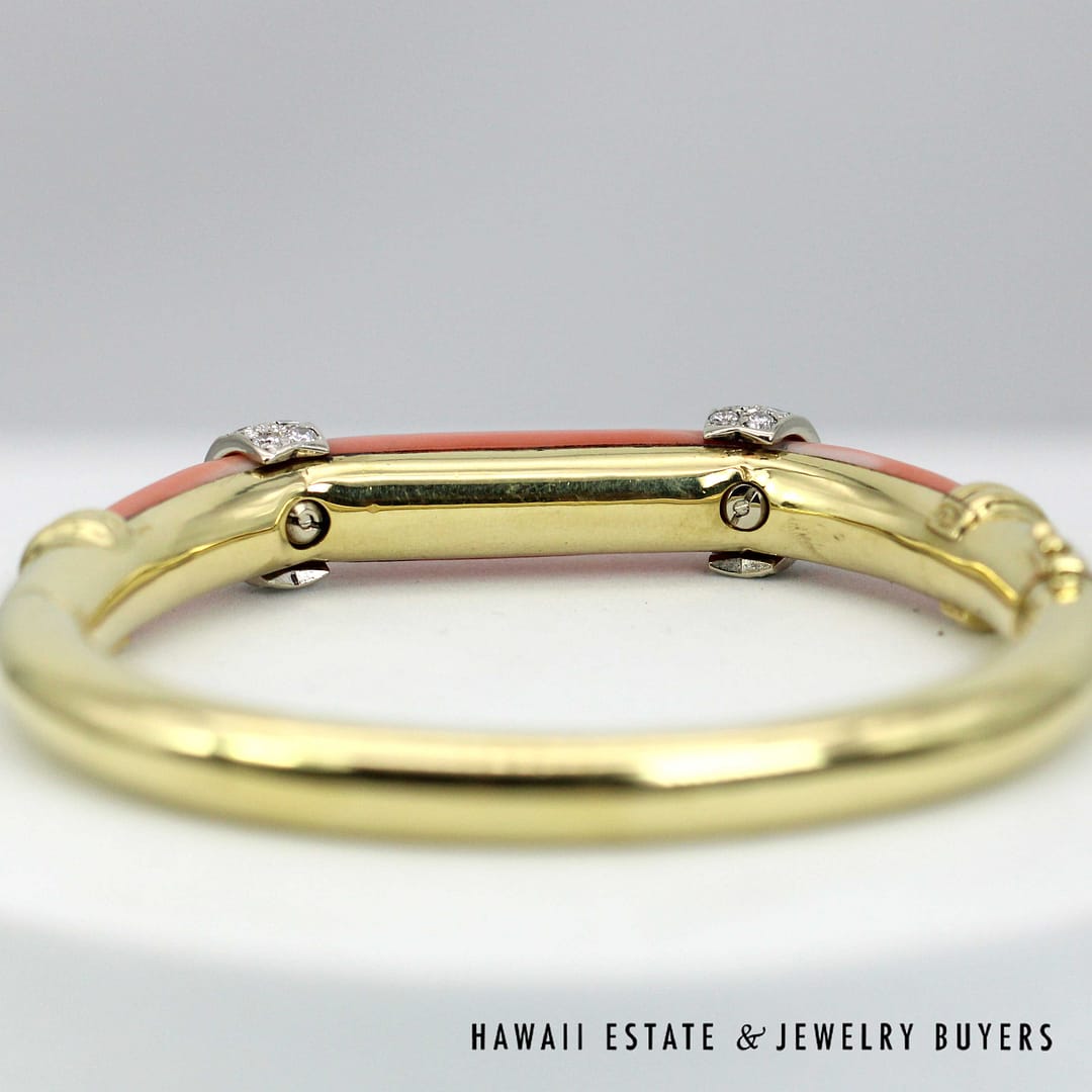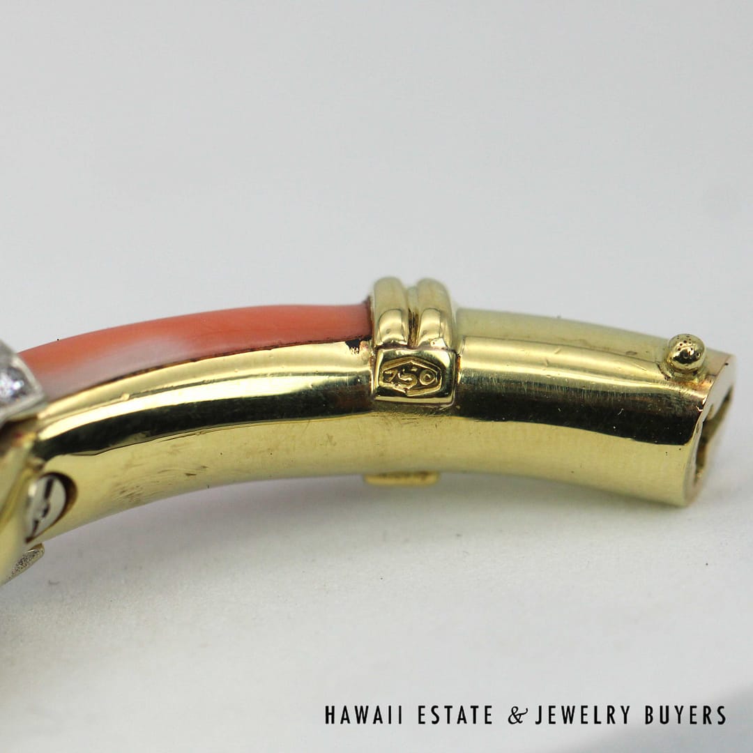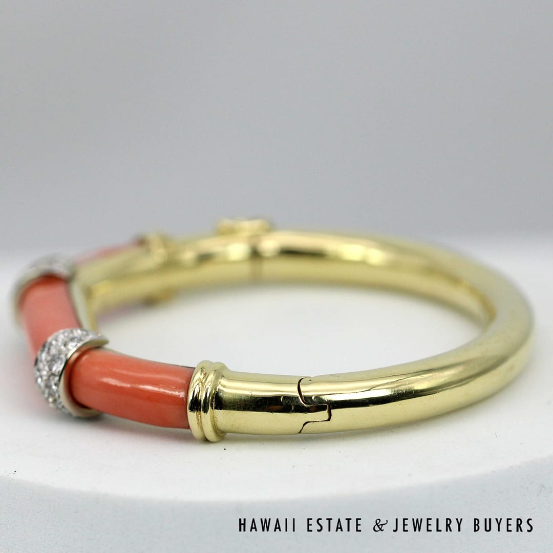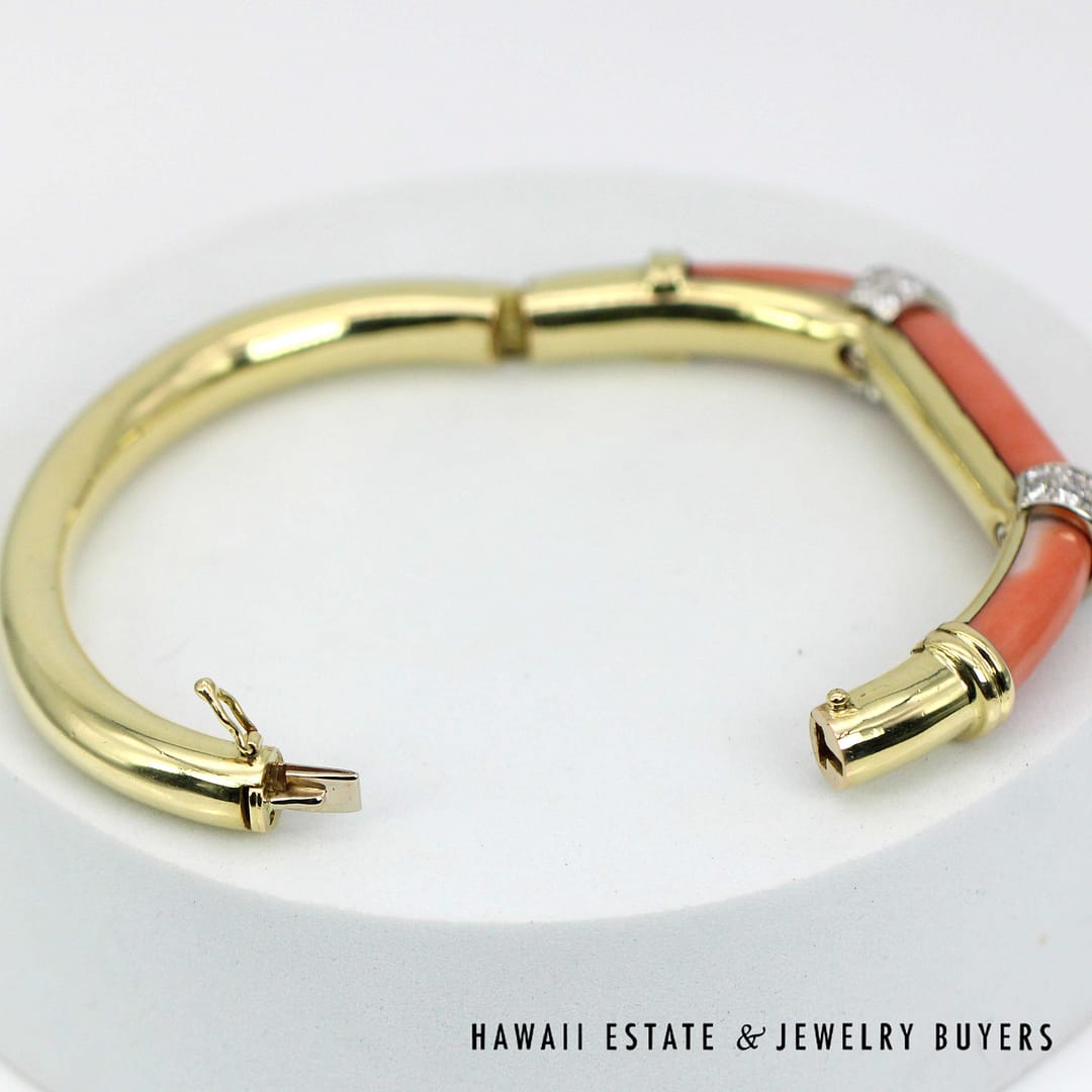 DescriptionElegant 18K yellow gold bangle bracelet featuring vibrant coral inlays accented diamond details for a luxurious and timeless look.46.1g 18KYG CORAL 1ctw DIAMOND BRACELET SIZE 6.25 (2780-11)$6,900.001 in stockCoral with 1ctw Diamond 18K Yellow Gold Braclet Size 6.25 quantityAdd to cartMake OfferSKU: 2780-11Categories: Pre-owned Diamond Jewelry, Pre-owned Gemstone JewelryRelated Styles2CTW PRINCESS CUT DIAMOND HEAVY 36.9g 18K YELLOW GOLD HINGED BANGLE BRACELET$5,400.002.13CTW DIAMOND CLUSTER 14K YELLOW GOLD TREE BRANCH RING W/ GEMOLOGIST APPRAISAL$5,225.000.80CTW ROUND BRILLIANT 14K YELLOW GOLD STUD EARRINGS$1,300.00NATURAL RUBY & 2.23CTW OLD MINE CUT DIAMOND MARQUISE SHAPE 14K YELLOW GOLD RING$9,500.00