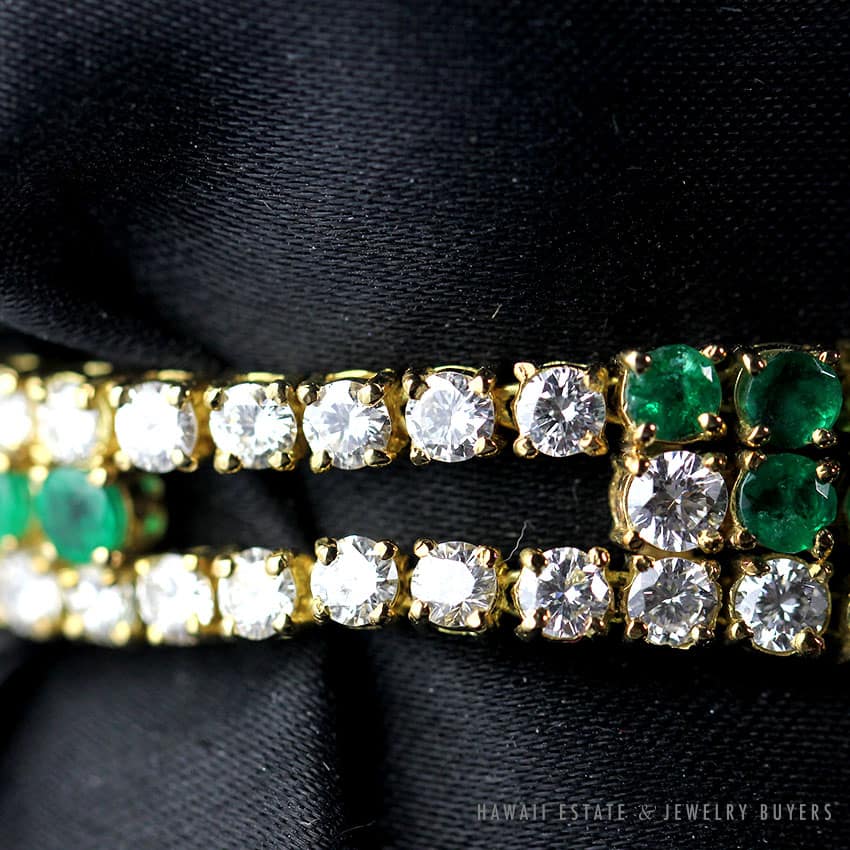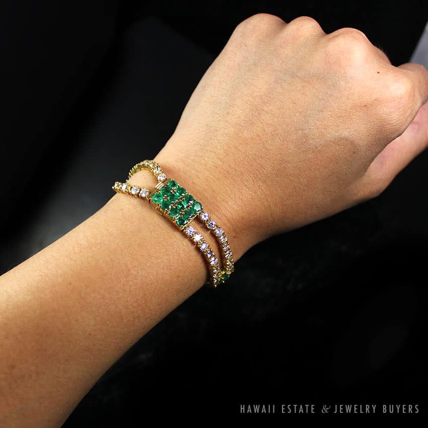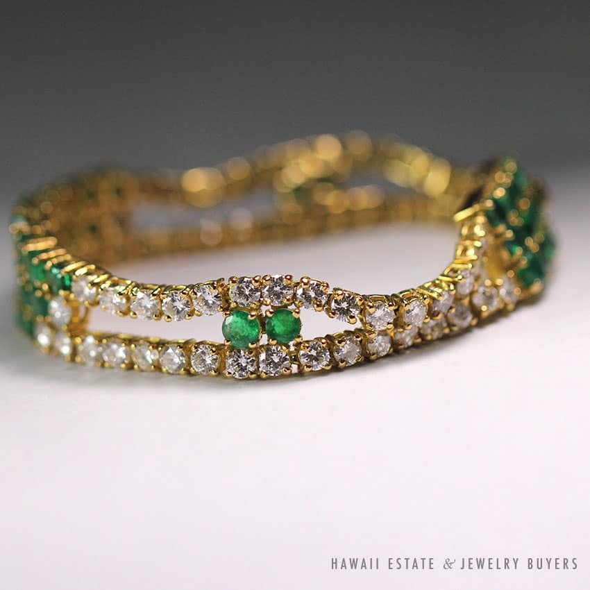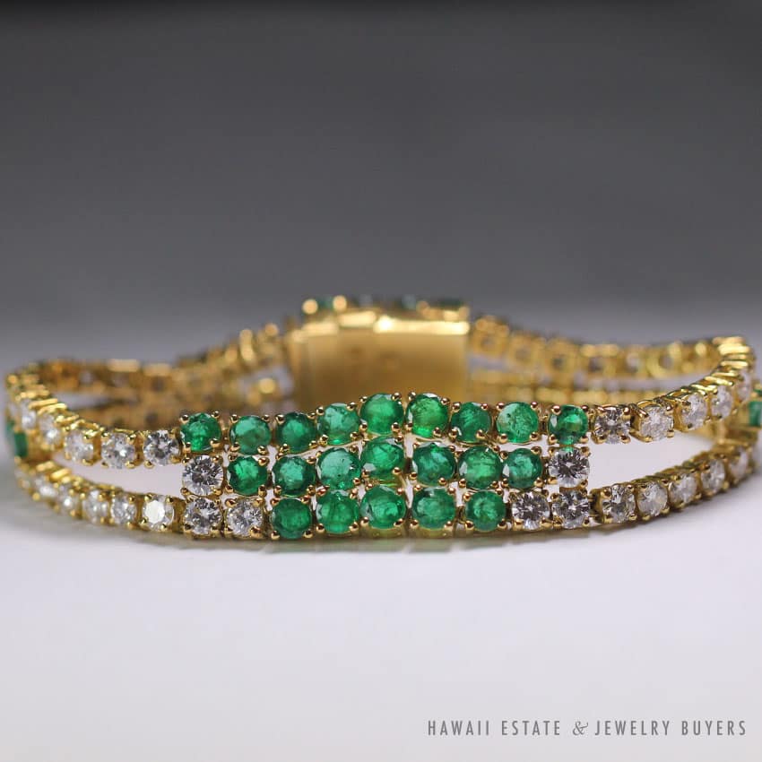 DescriptionSTAMPED: 18K HURTIG– Bracelet by Bernard Hurtig Honolulu– approx 8.04CTW diamonds– 6.46ctw emeralds-inside circumference 6.22″, width .55″ESTIMATED RETAIL: $11,500 $7,999.001 in stockDESIGNER EMERALD & 8.04CTW DIAMOND 18K YELLOW GOLD BRACELET quantityAdd to cartBuy withMake OfferSKU: 1962-02Category: Pre-owned Diamond JewelryRelated StylesDiamond Drop Bezel Set Pendant & Rolo 14K White Gold Italy Designer Necklace$3,200.00VINTAGE BURMESE JADEITE JADE & DIAMOND FLORAL 14K YELLOW GOLD BRACELET W/ GEMOLOGIST APPRAISAL$2,447.501.50CTW PRINCESS CUT 14K YELLOW GOLD MEN’S RING SIZE 8.25$2,500.00VICTORIAN OLD MINE DIAMOND 5.48CTW PLATINUM GOLD BROOCH & DIAMOND NECKLACE SET$13,300.00