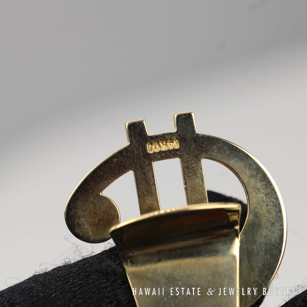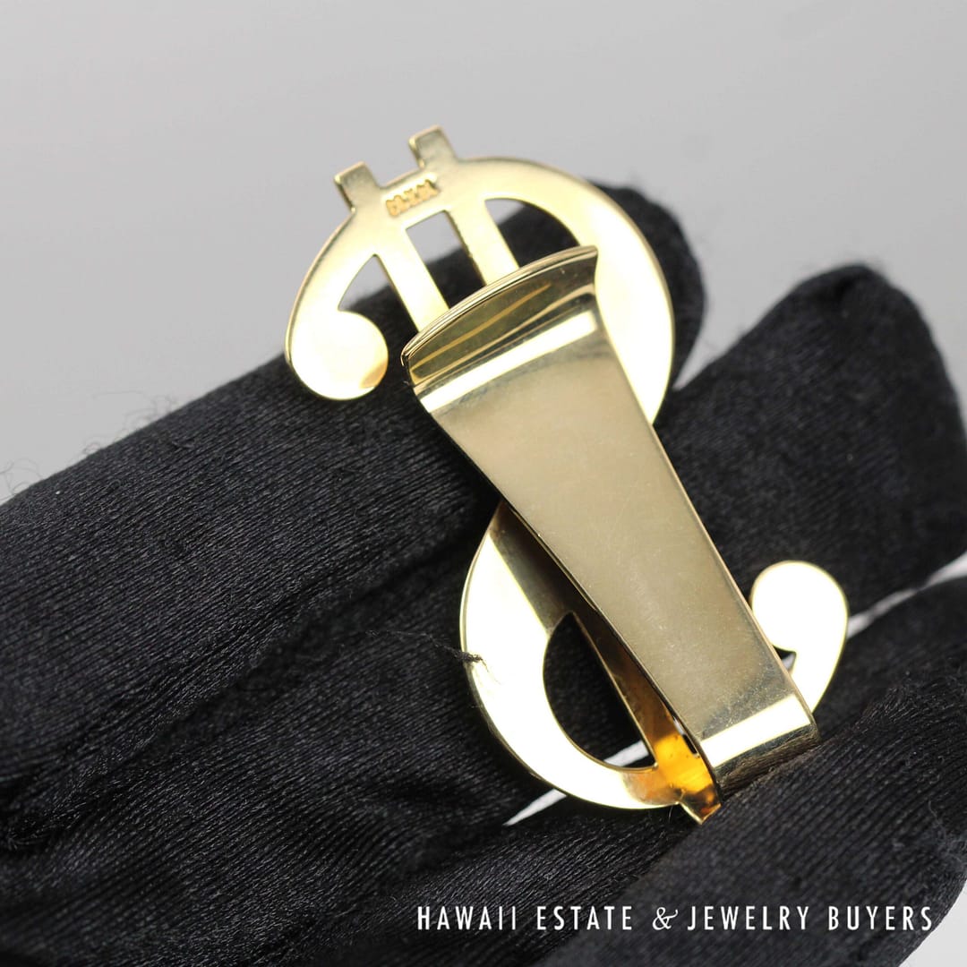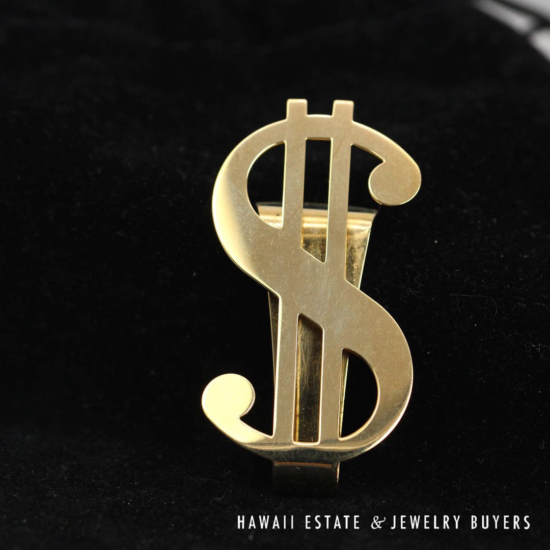 DescriptionDollar Sign money clip is stamped 14KGI and measures approx. 50 X 26mm10.8g 14KYG DOLLAR SIGN MONEY CLIP (2491-03)$1,100.001 in stockDollar Sign 10.8g 14K Yellow Gold Money Clip quantityAdd to cartBuy withMake OfferSKU: 2491-03Category: Pre-owned gold jewelryRelated StylesGIA 16.5g 14KWG 38.10ct AQUAMARINE AND DIAMOND RING SIZE 9$18,000.00MING’S 9.6g 14KYG BIRD IN PLUM 20mm BUTTON EARRING WITH PIERCED OMEGA CLIPS AND BOX$2,900.006.2g 14KYG 1.50ct OPAL AND 0.10ctw DIAMOND RING SIZE 7.75$900.00MING’S 3.4g 14KYG ENGRAVED 8mm BAND SIZE 5$1,025.00