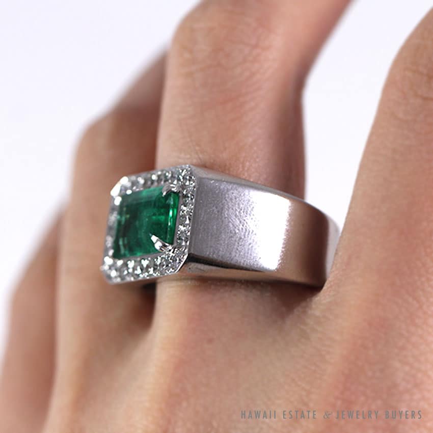 The emerald is set in four corner prongs in the rectangular octagonal ring.