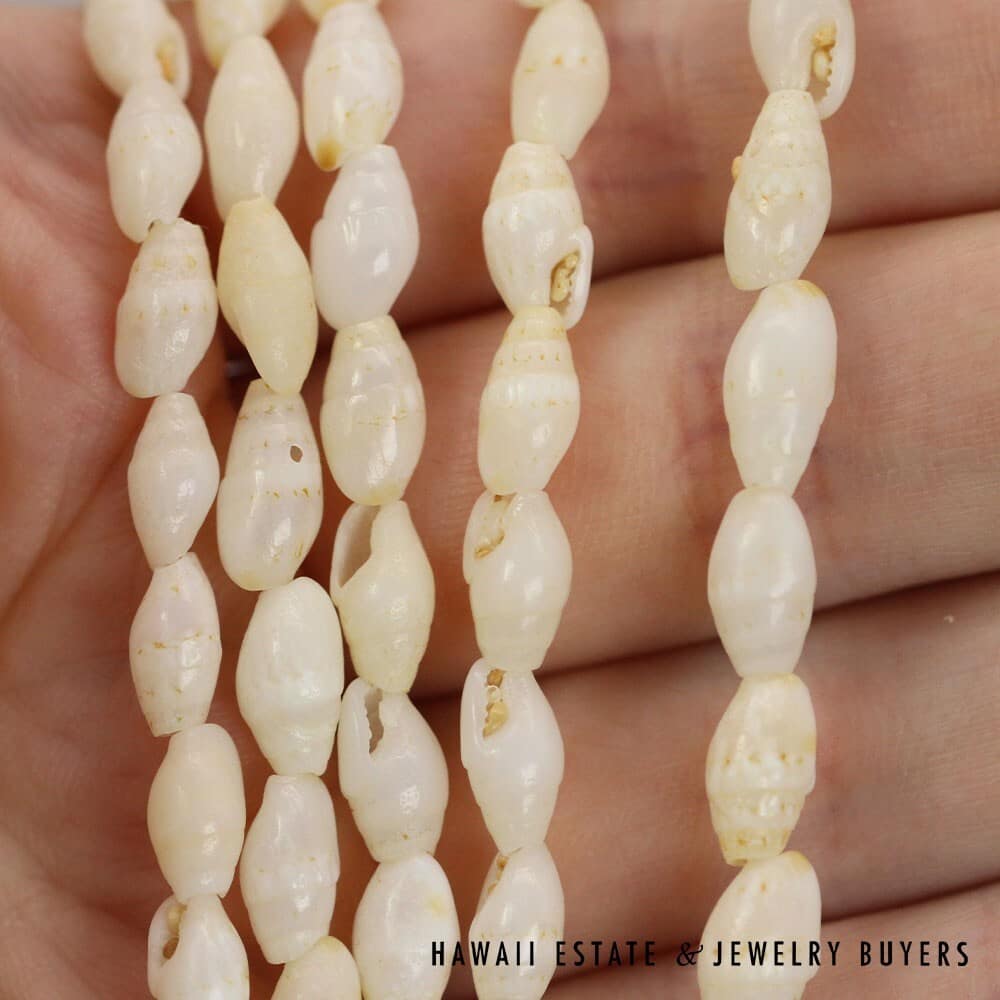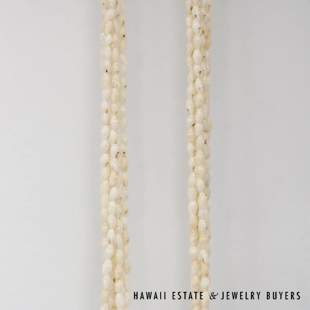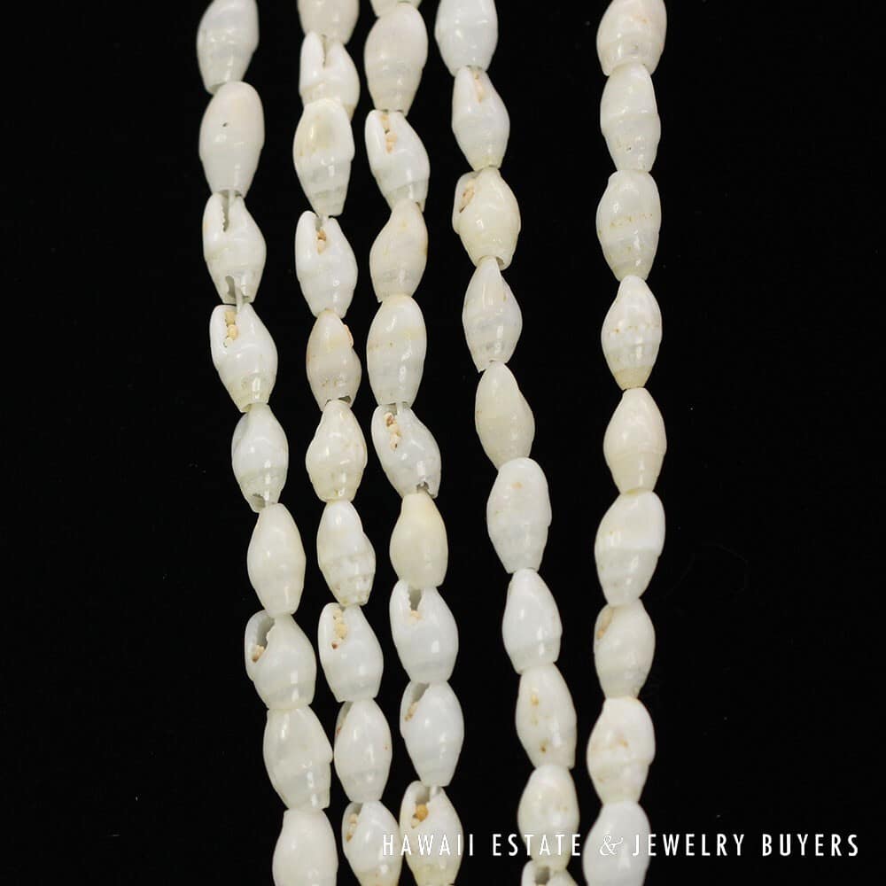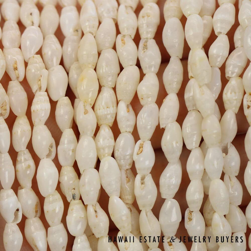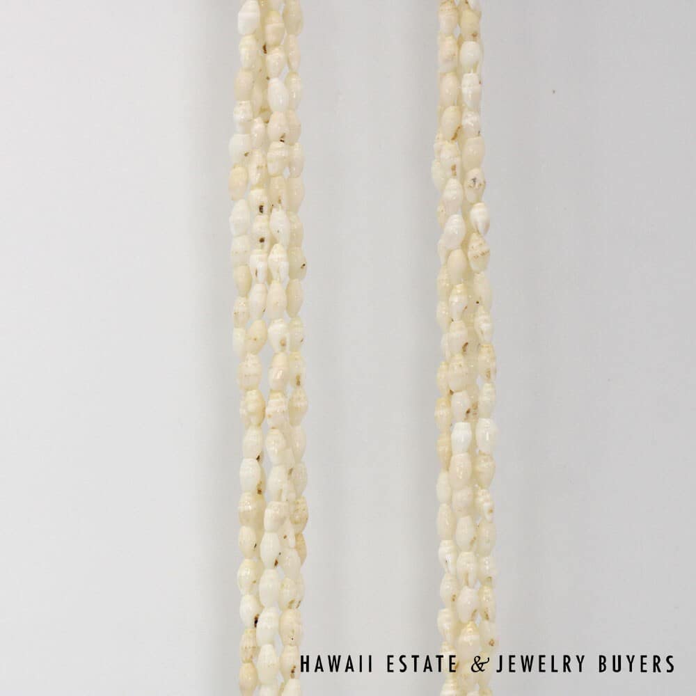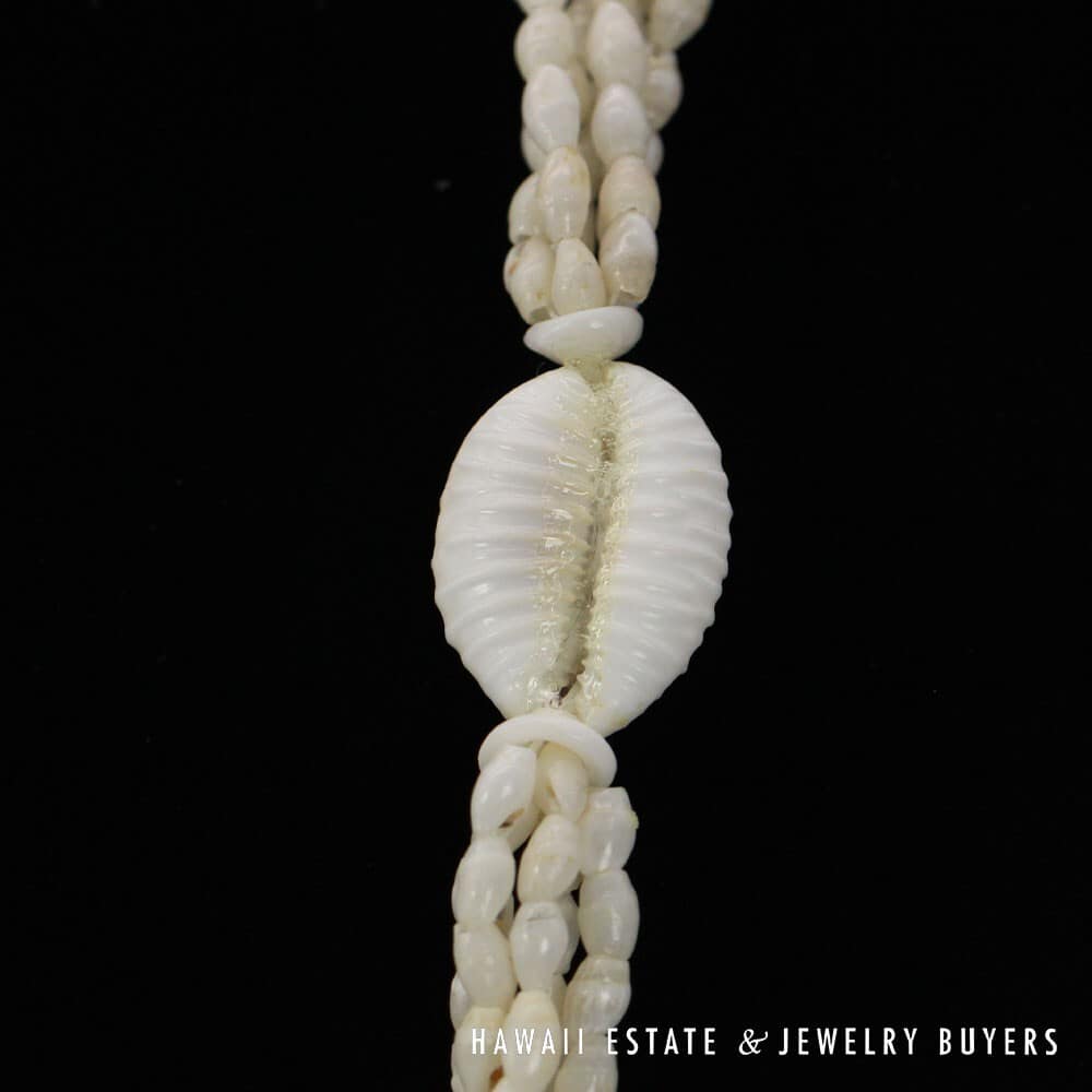 This piece has five strands of Laiki (rice shells) strung together in the Pololei (stacked end-to-end) style. The shells are of the Ke'oke'o (pure white) coloration and are connected by a Pōlehole Āpu'upu'u (bumpy cowry shell) that measures approximately 26mm long by 19mm wide.