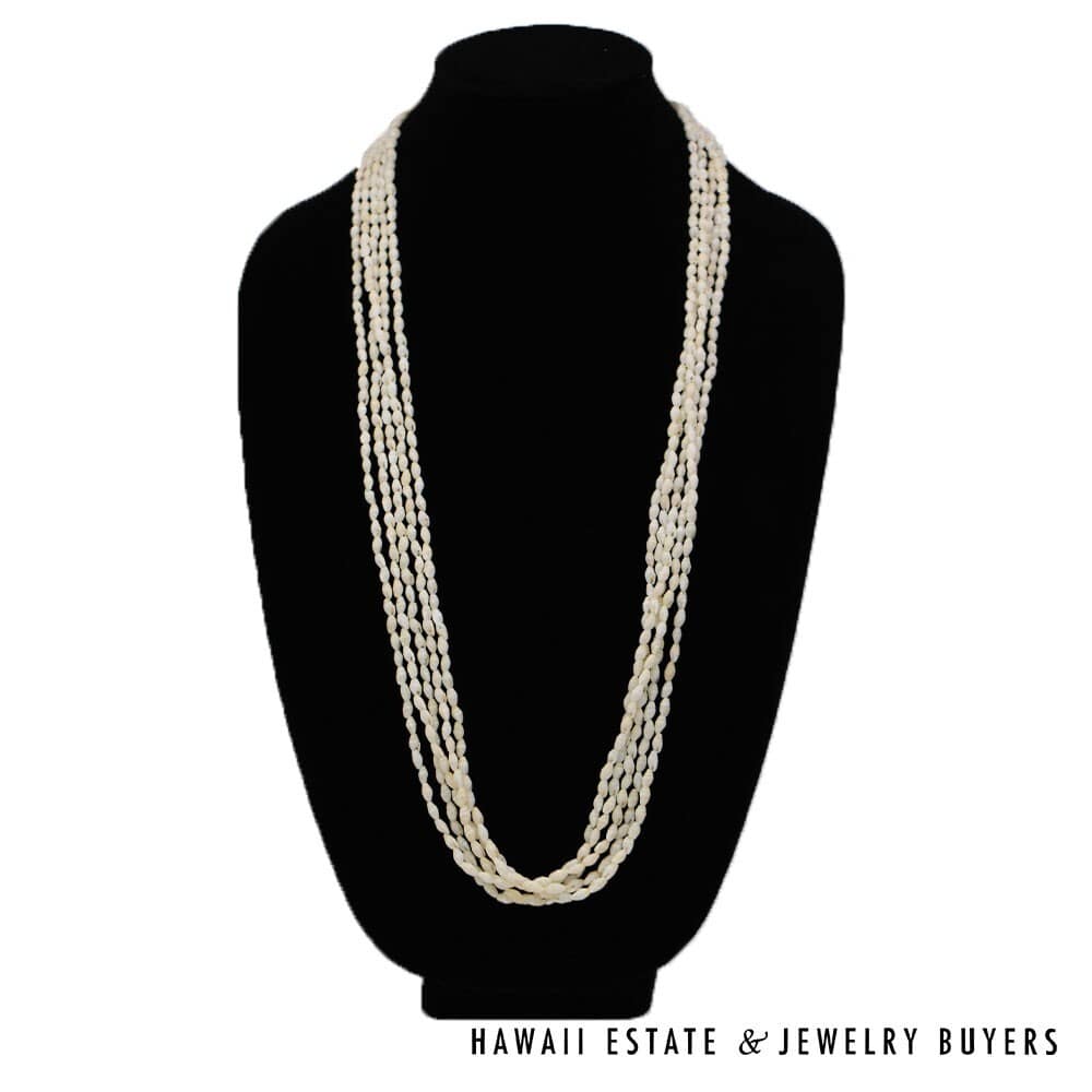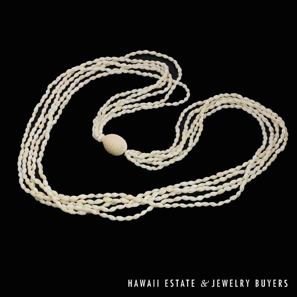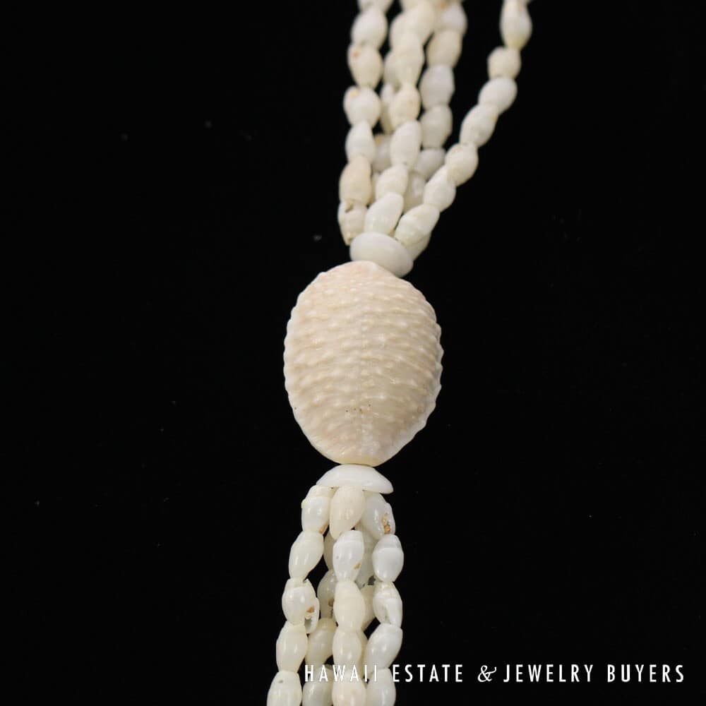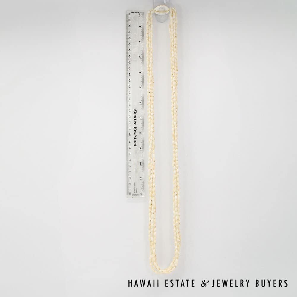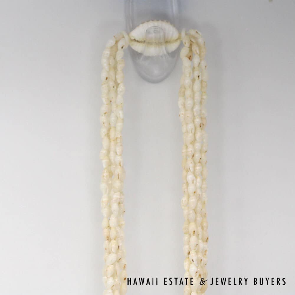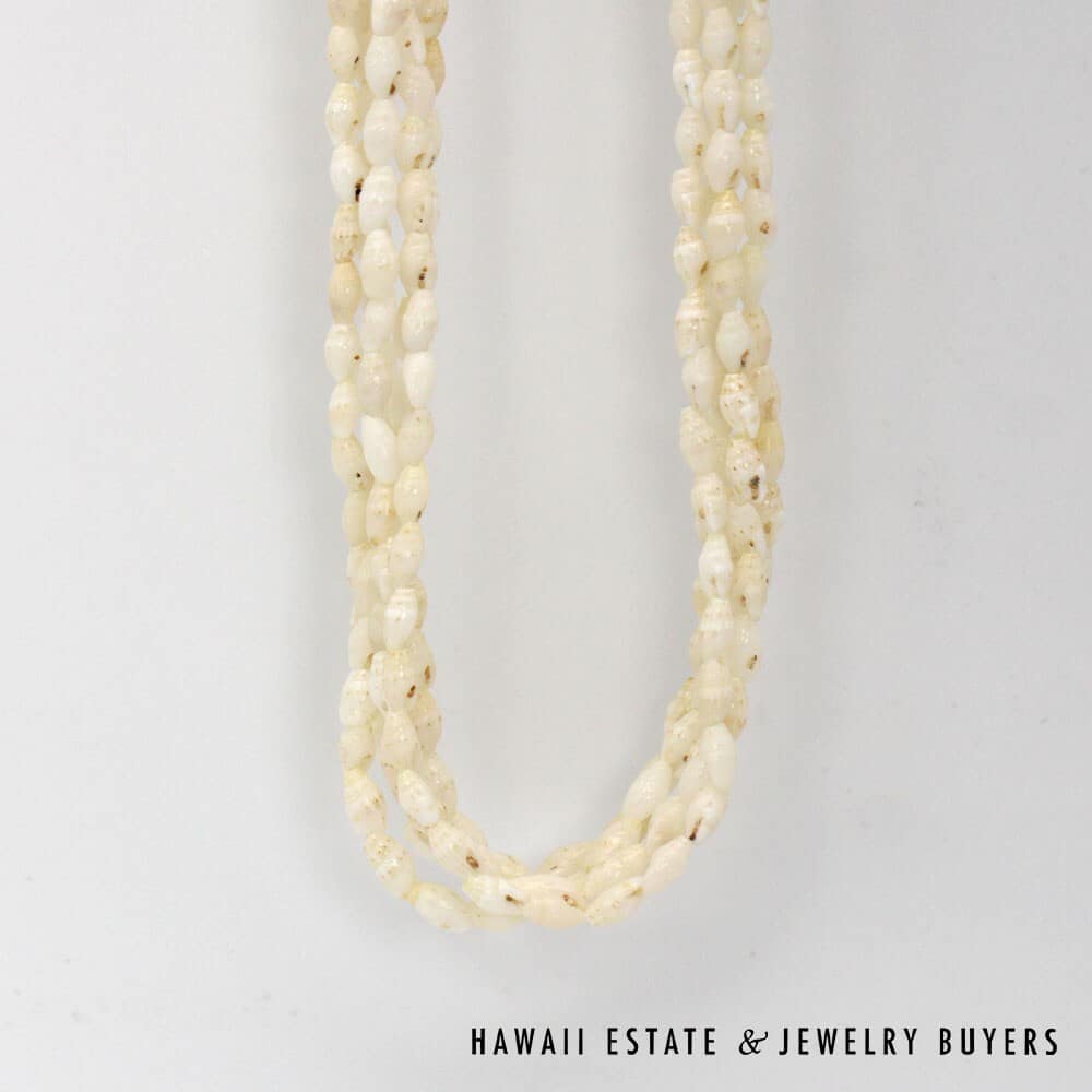 This piece has five strands of Laiki (rice shells) strung together in the Pololei (stacked end-to-end) style. The shells are of the Ke'oke'o (pure white) coloration and are connected by a Pōlehole Āpu'upu'u (bumpy cowry shell) that measures approximately 26mm long by 19mm wide.