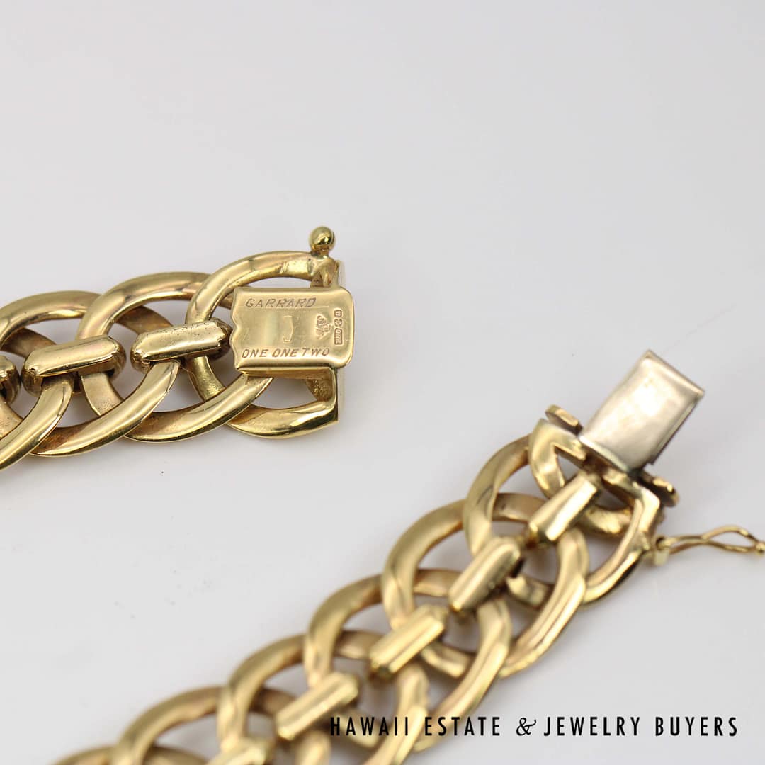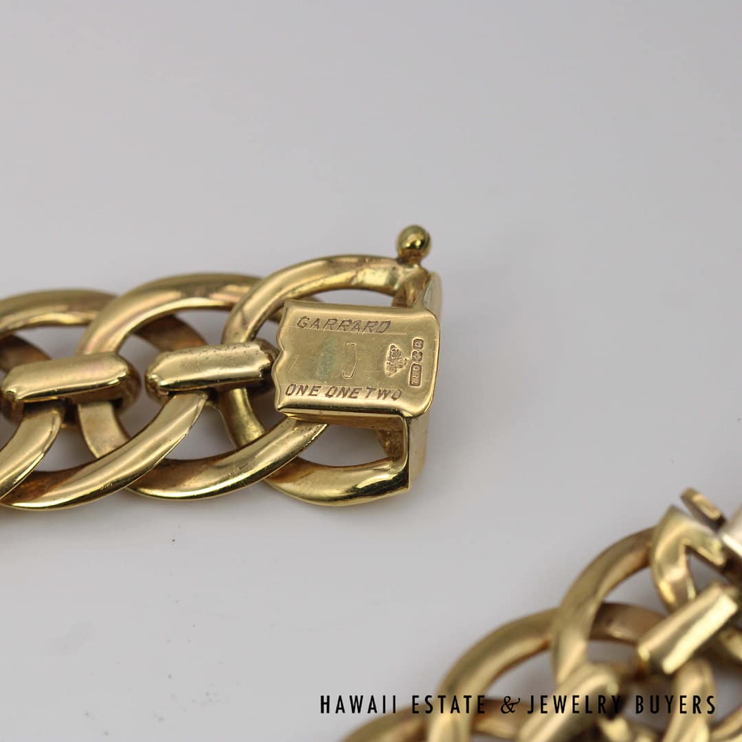 From Garrard's One One One Collection, this 17-inch necklace is crafted in 18K yellow gold with a striking 15mm width, blending bold design with refined British craftsmanship.