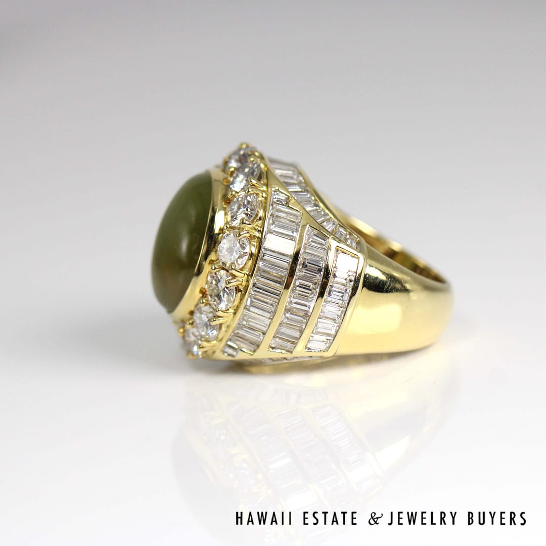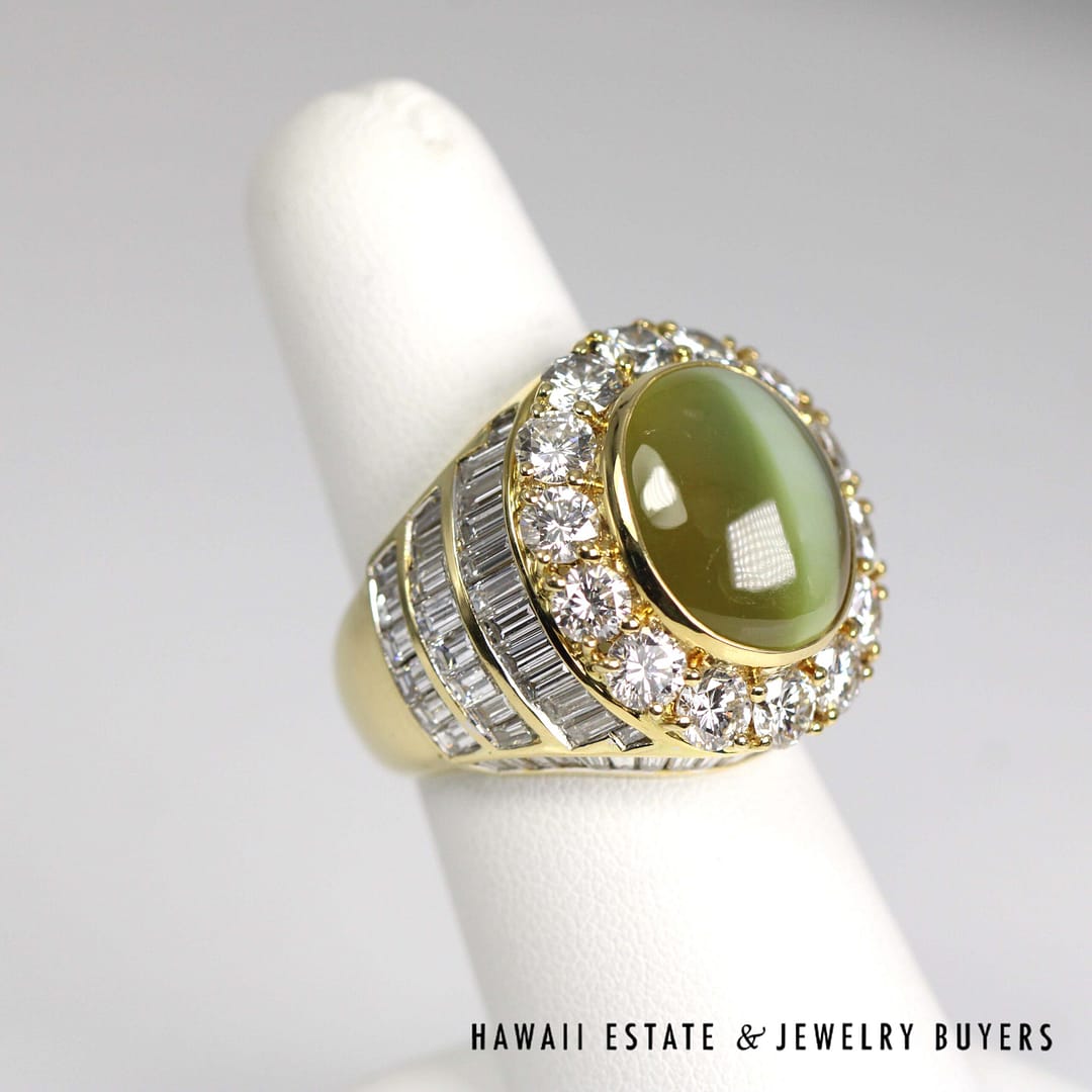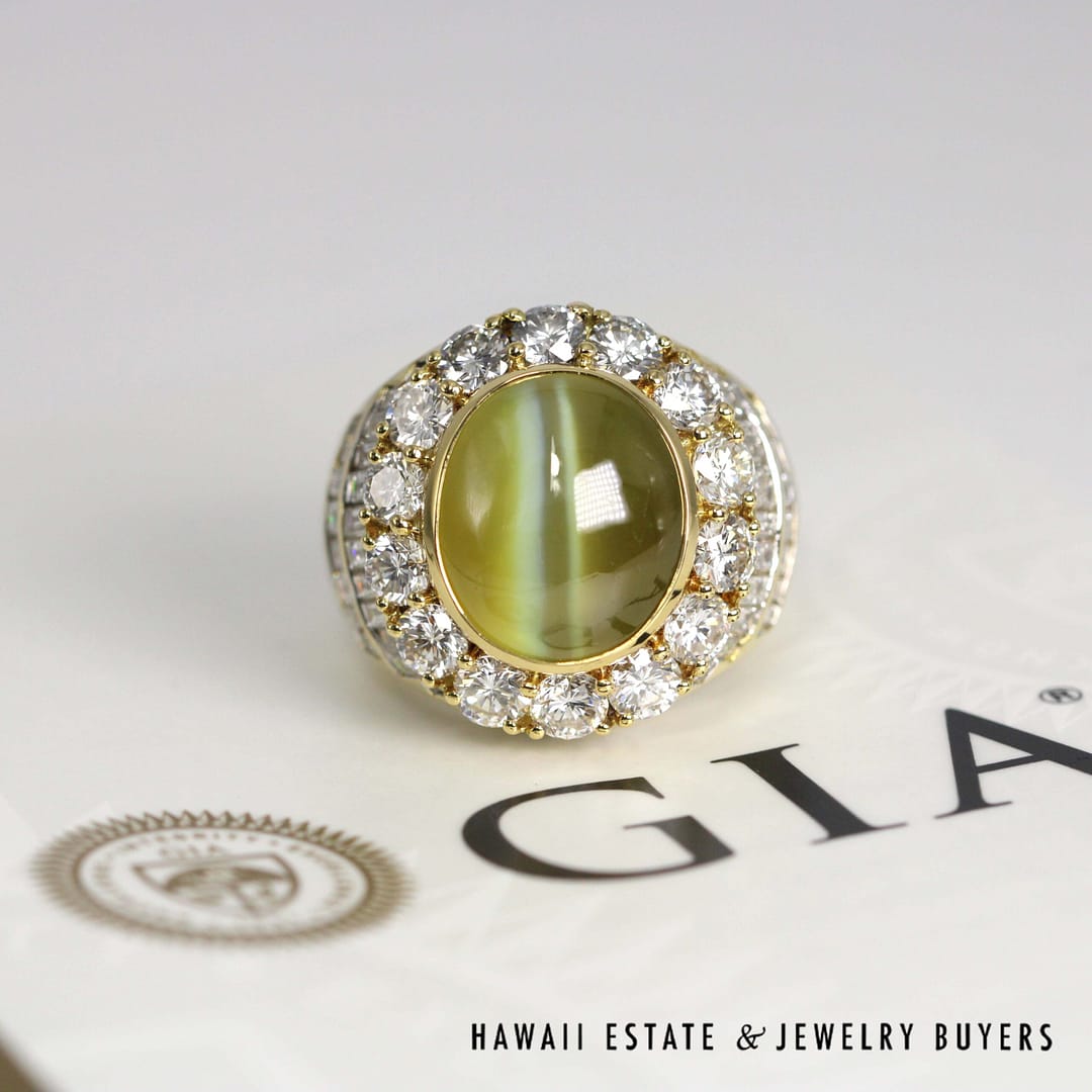 GIA 21g 18KYG 17.87ct CAT’S EYE CHRYSOBERYL 8.67ctw BAGUETTE DIAMOND GENTS RING SIZE 7.5 WITH APPRAISAL (3126-03)