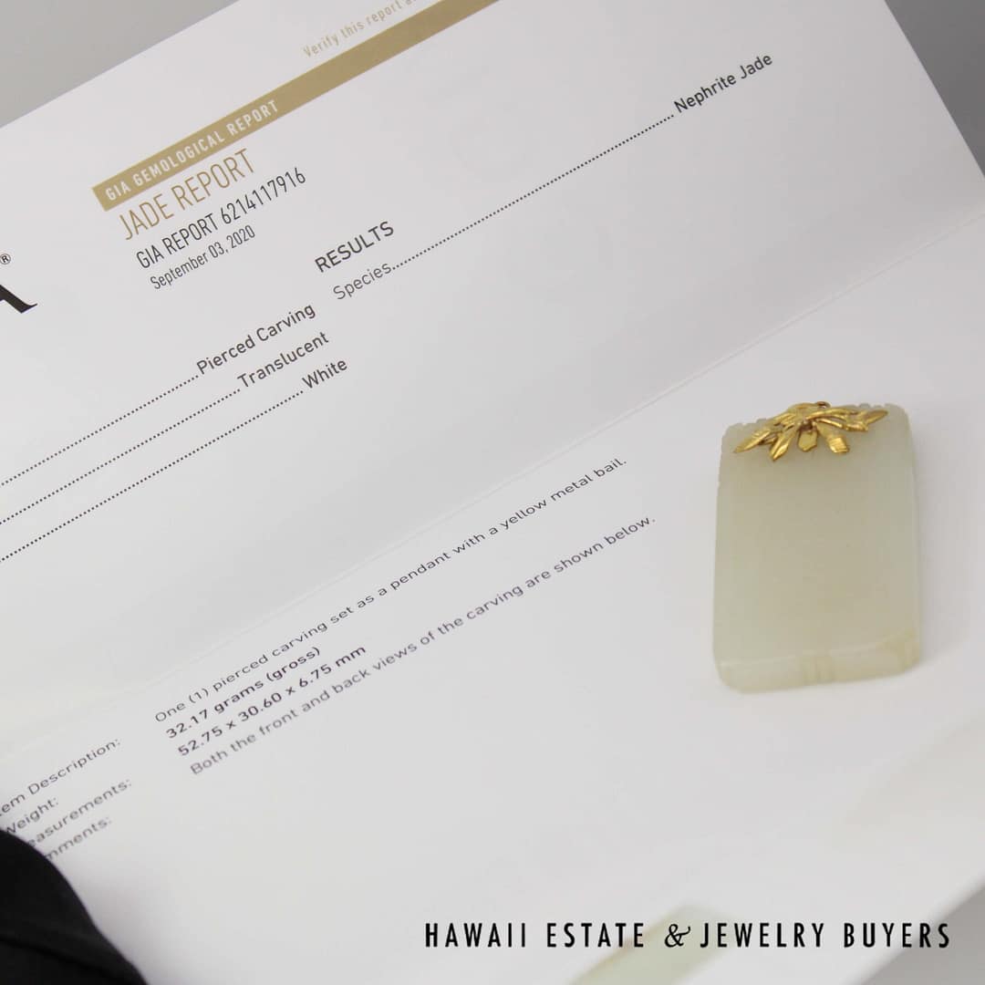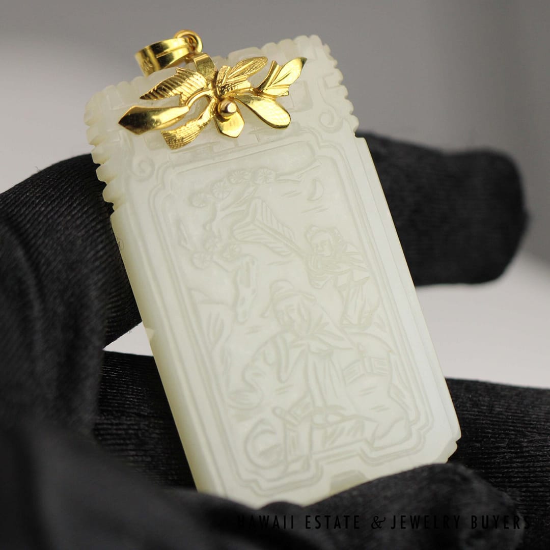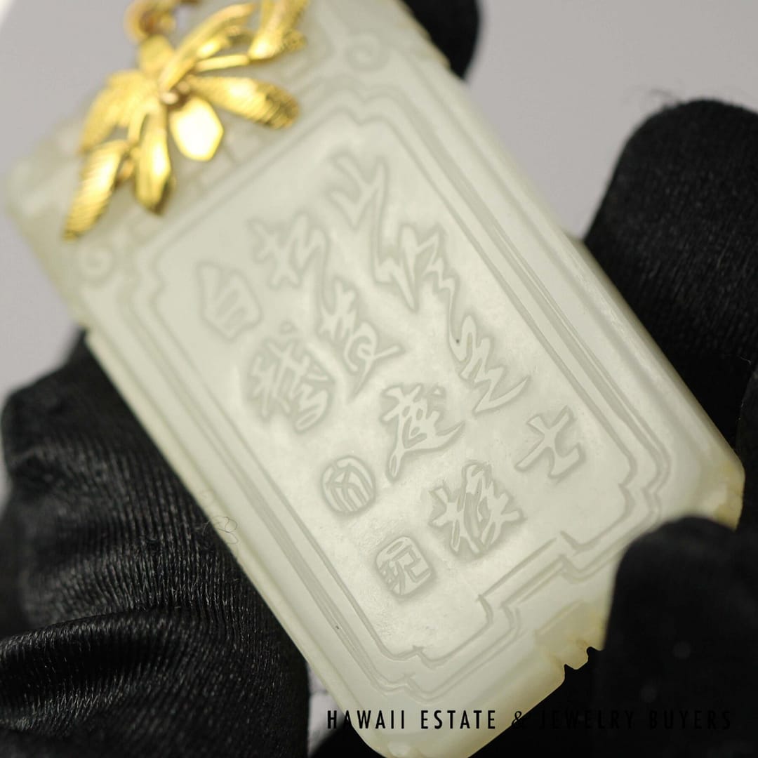 DescriptionGIA report 621411791 – Nephrite JADE 52.75 X 30.60 X 6.75MMGIA 18th CENTURY 32.1g NEPHRITE JADE CARVED TABLET with 14KYG BAIL (2446-59)$9,100.001 in stockGIA 18th Century Nephrite Carved Tablet w/ 14K Yellow Gold Bail quantityAdd to cartMake OfferSKU: 2446-59Category: GIARelated StylesGIA Grade A Green NATURAL Jadeite Jade 0.66ctw Diamond 18K Yellow Gold Brooch$4,500.00GIA Natural Jadeite Jade Grade A 14K Yellow Gold Carved Pendant$2,500.00GIA Grade A Fei Cui Natural Green Jadeite Jade Pendant 14K Yellow Gold$3,500.00GIA Grade A Mottled Green Jadeite Jade Marquise 4.2g 18K Yellow Gold Ring$1,900.00