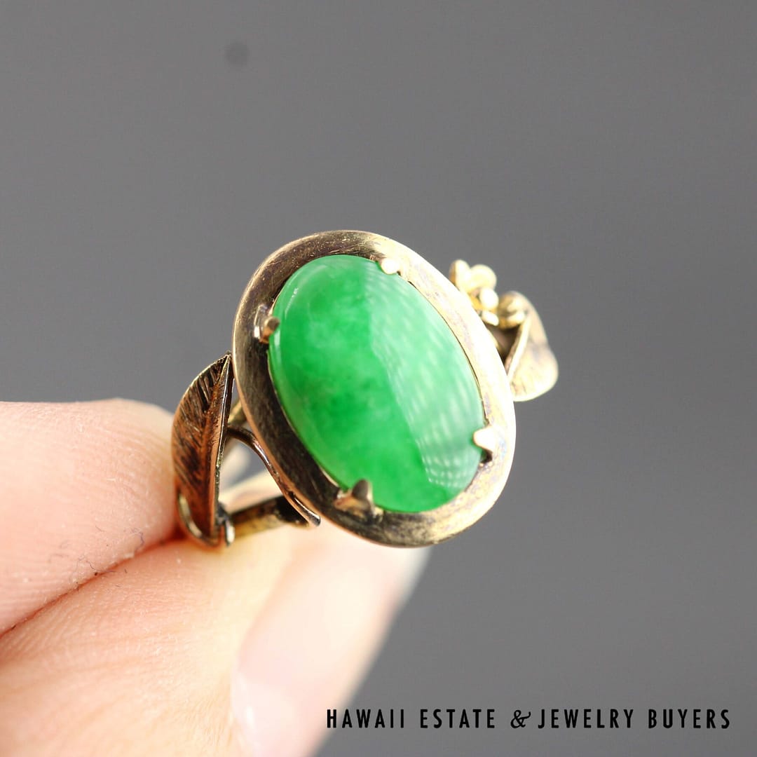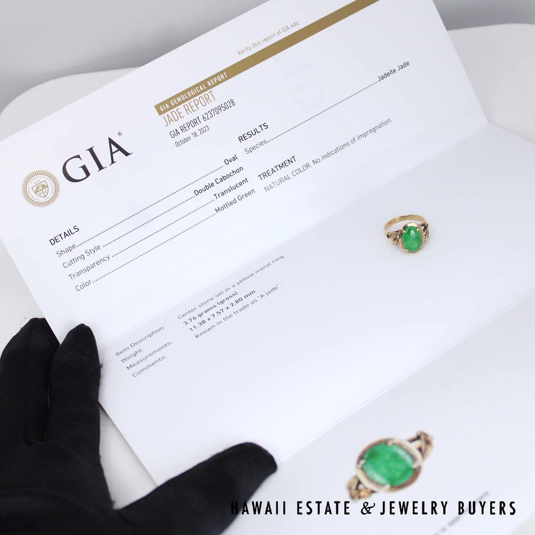 DescriptionGIA REPORT 6237095028 – NATURAL COLOR. No indications of impregnation.known in the trade as 'A jade'GIA Type A jade measures 11.38 x 7.57mmGIA 3.8g 14KYG OVAL GREEN A JADE RING SIZE 5.5 (2934-06)$1,200.00Out of stockSKU: 2934-06Category: Pre-owned Jade JewelryRelated StylesGIA 67.2g 14KYG TRANSLUCENT MOTTLED GRAYISH GREEN JADE HINGED BANGLE BRACELET$9,500.00GIA 58.8g 14KYG ORANGY BROWN & WHITE JADE HINGED BANGLE BRACELET SIZE 8$4,500.0023g 18KYG MOTTLED GREEN JADE CARVED PENDANT$2,800.00GIA 14KYG 52.3g GRAY PURPLE JADE TYPE A HINGED BANGLE BRACELET SIZE 7$11,000.00