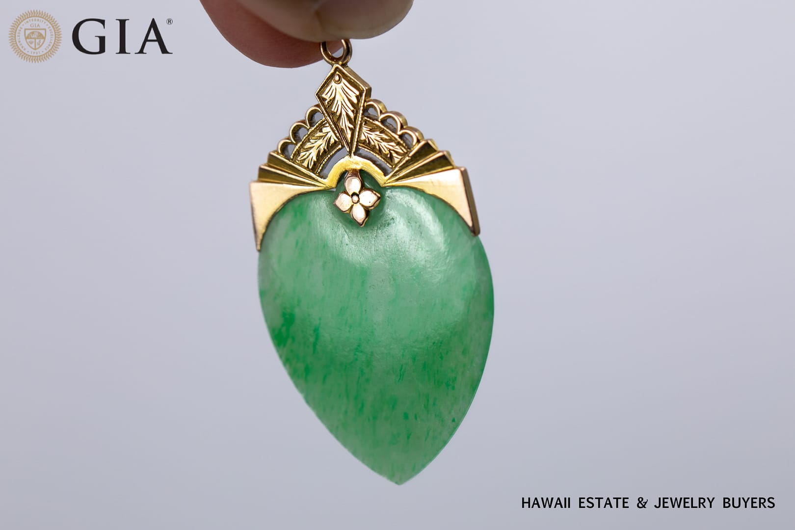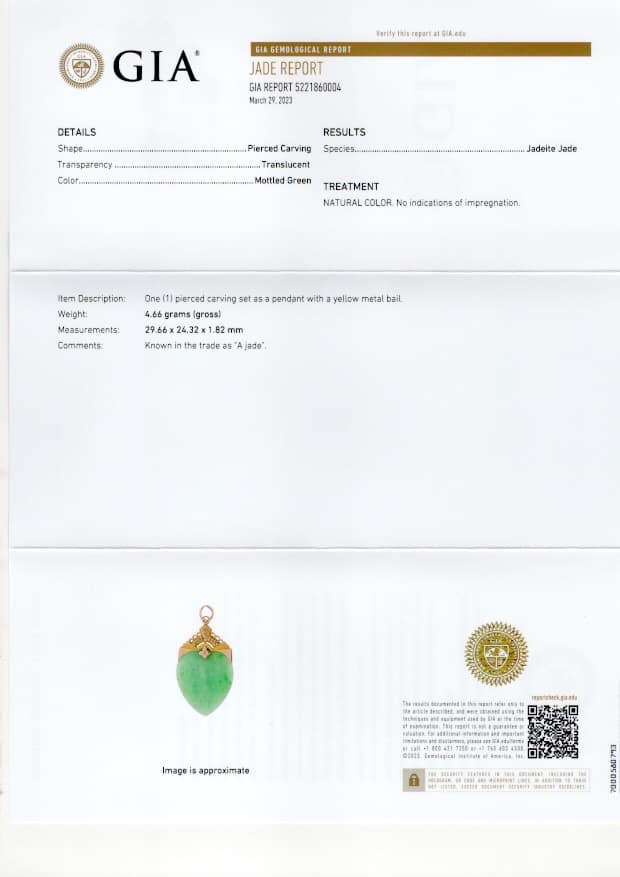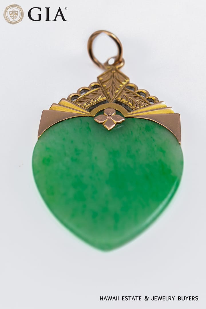 DescriptionGIA 4.7g 14KYG GREEN JADE HEART PENDANT14KYG Green Jade heart pendant with GIA JADE REPORT is Type A, pendant measures 43 X 24mm. Jump ring diameter is approx. 4.5mm.$3,100.001 in stockGIA 4.7g 14KYG GREEN JADE HEART PENDANT quantityAdd to cartMake OfferSKU: 092922-04Category: Pre-owned Jade JewelryTags: 14k yellow gold, gia, GIA JADE, green jade, PENDANTRelated StylesGIA 2.5g 14KYG DARK GREEN AND WHITE CARVED JADE AND DIAMOND PENDANT $2,200.004.1g 24KYG GREEN JADE PENDANT MEASURING 26x3mm$5,000.00GIA CERTIFIED 4.4g 18K TWO TONE 4.71ct CUSHION CUT PINK-PURPLE SAPPHIRE 0.45ctw DIAMOND RING SIZE 5$25,000.00GIA 3.4g 24KYG TYPE A GREEN JADE HEART PENDANT MEASURES 28 X 19mm$3,900.00
